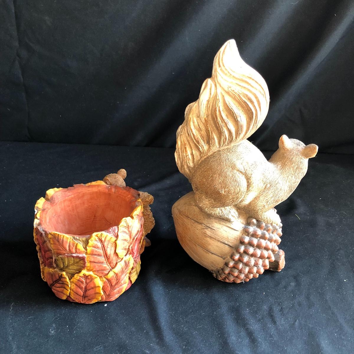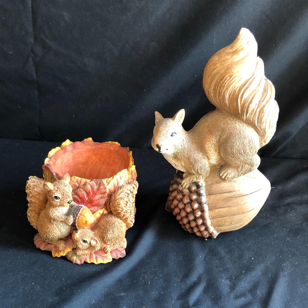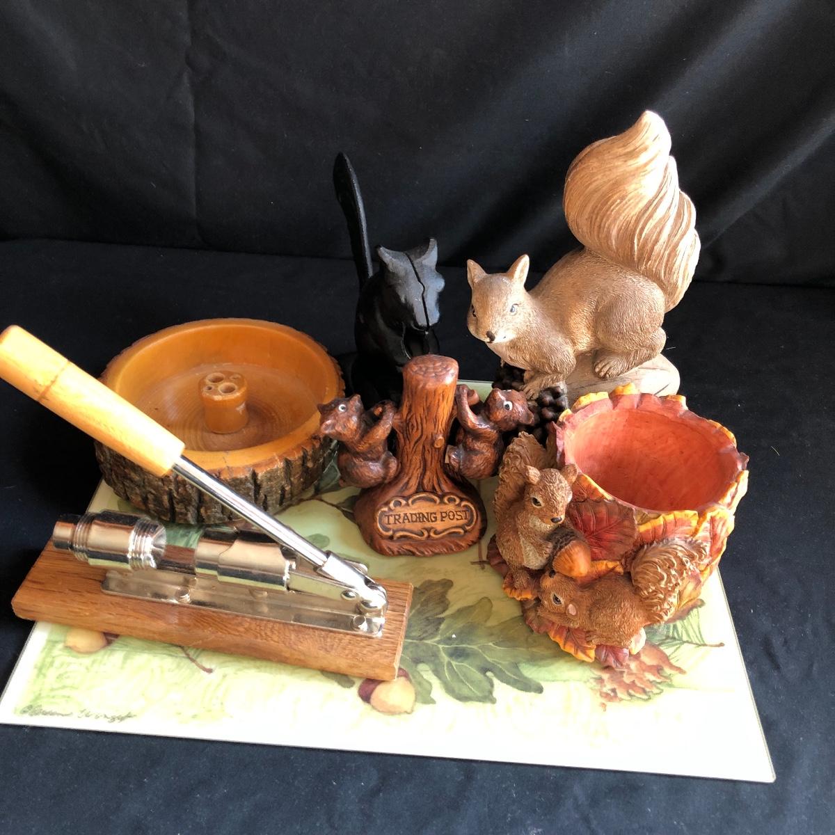 You will go nuts over this lot. Lot includes metal squirrel nut cracker, two resin figurines, ceramic salt and pepper shakers, wooden bowl and a slide nutcracker. Metal squirrel measures 3” x 4.5” x 6”.