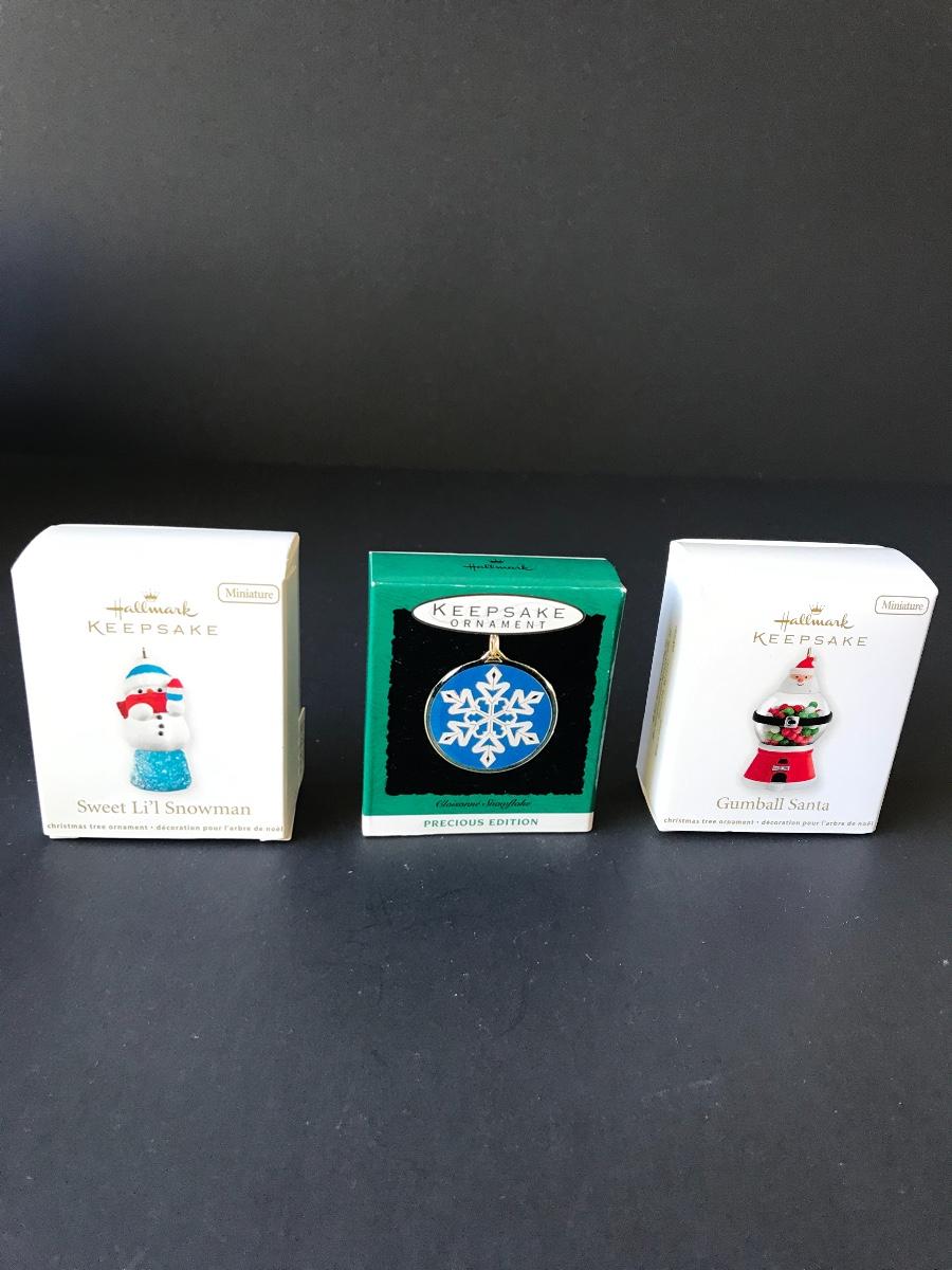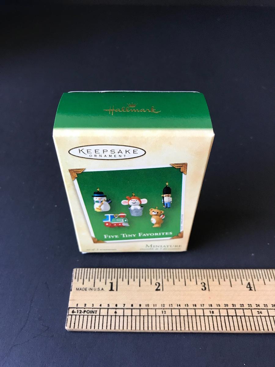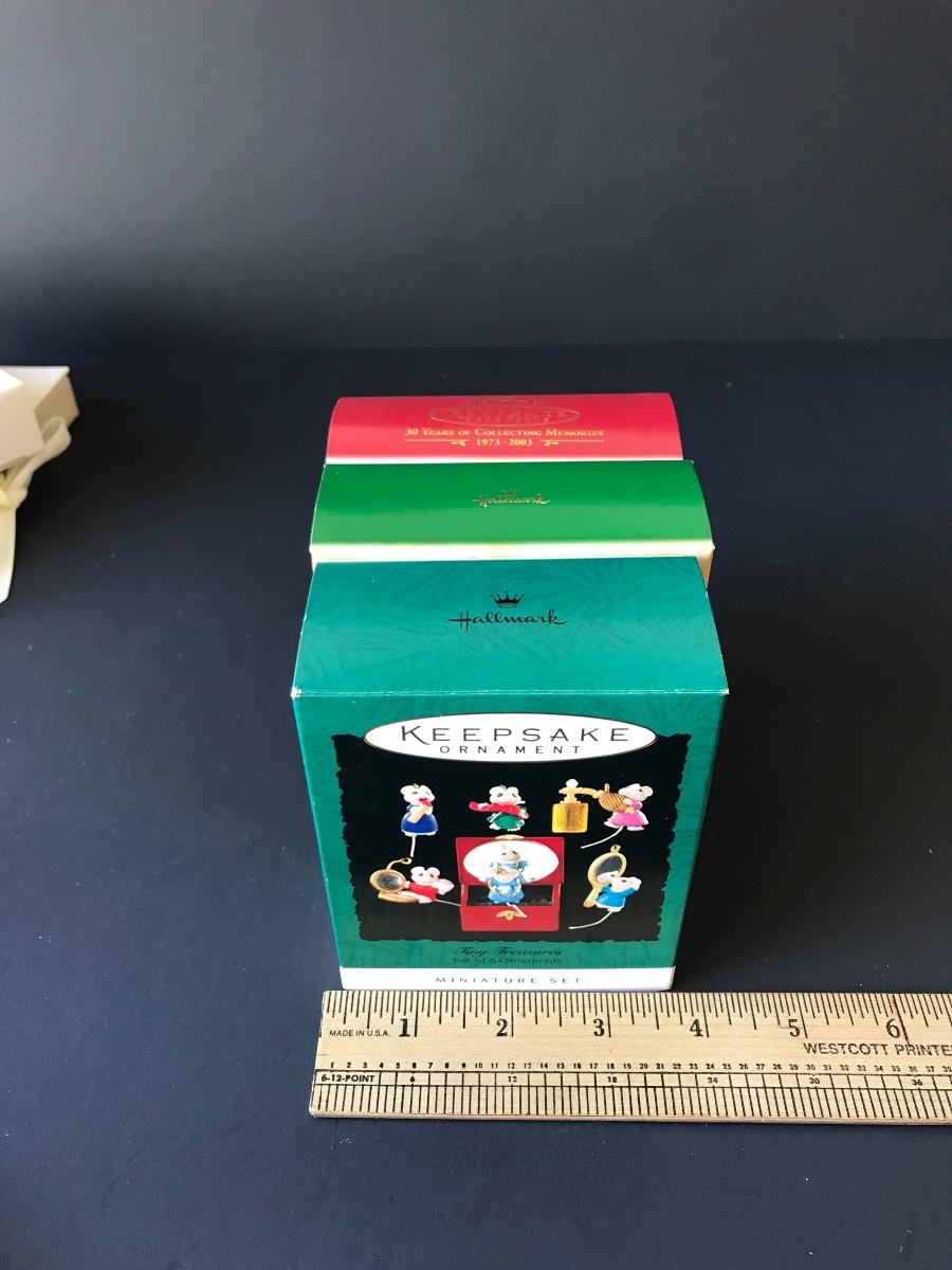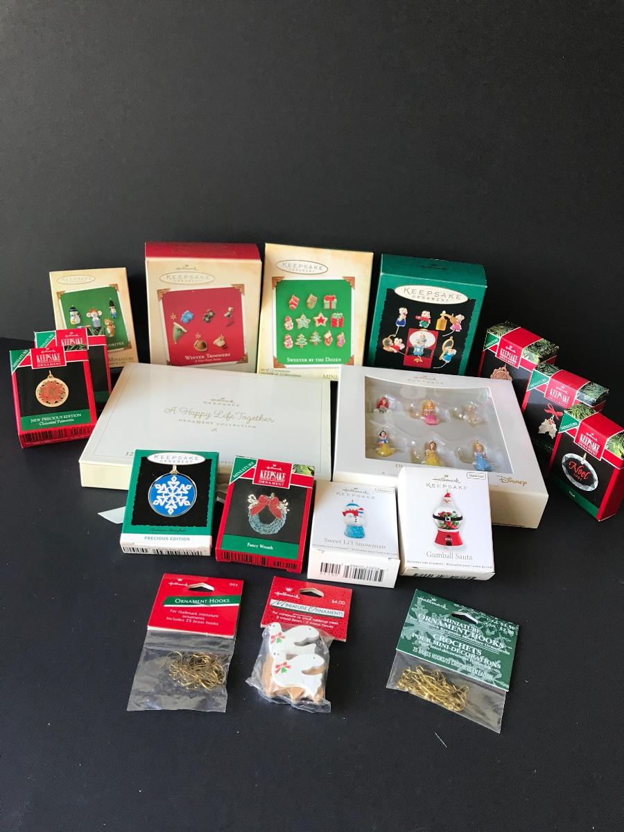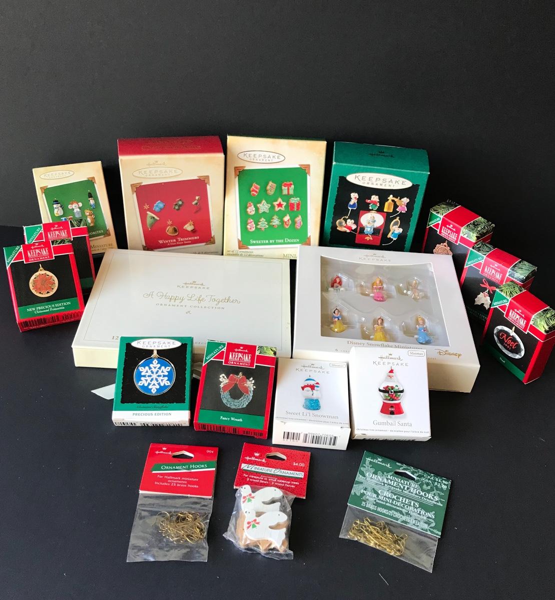 Miniature Christmas Ornaments - Hallmark Keepsake. All Holiday items in this auction are as-seen. The client collected a lot of holiday pieces and some are new in box, some were displayed once and come with original box, and some have been displayed and come with no box. They are all pre-owned in some fashion and have been stored in an attic or on shelf in library. Please see all pictures. The pictures show condition, measurements if taken, and what is included in the lot. Due to the large amount that we photograph and the time frame, we are not always able to take measurements. All items unless noted, are pre-owned and have been used. Thank you