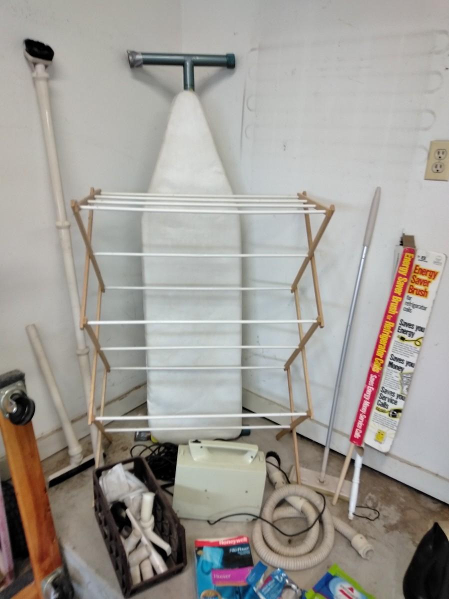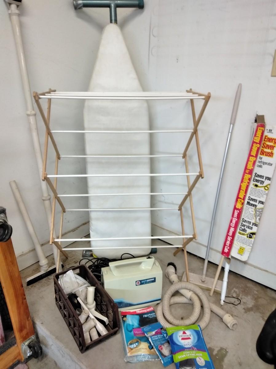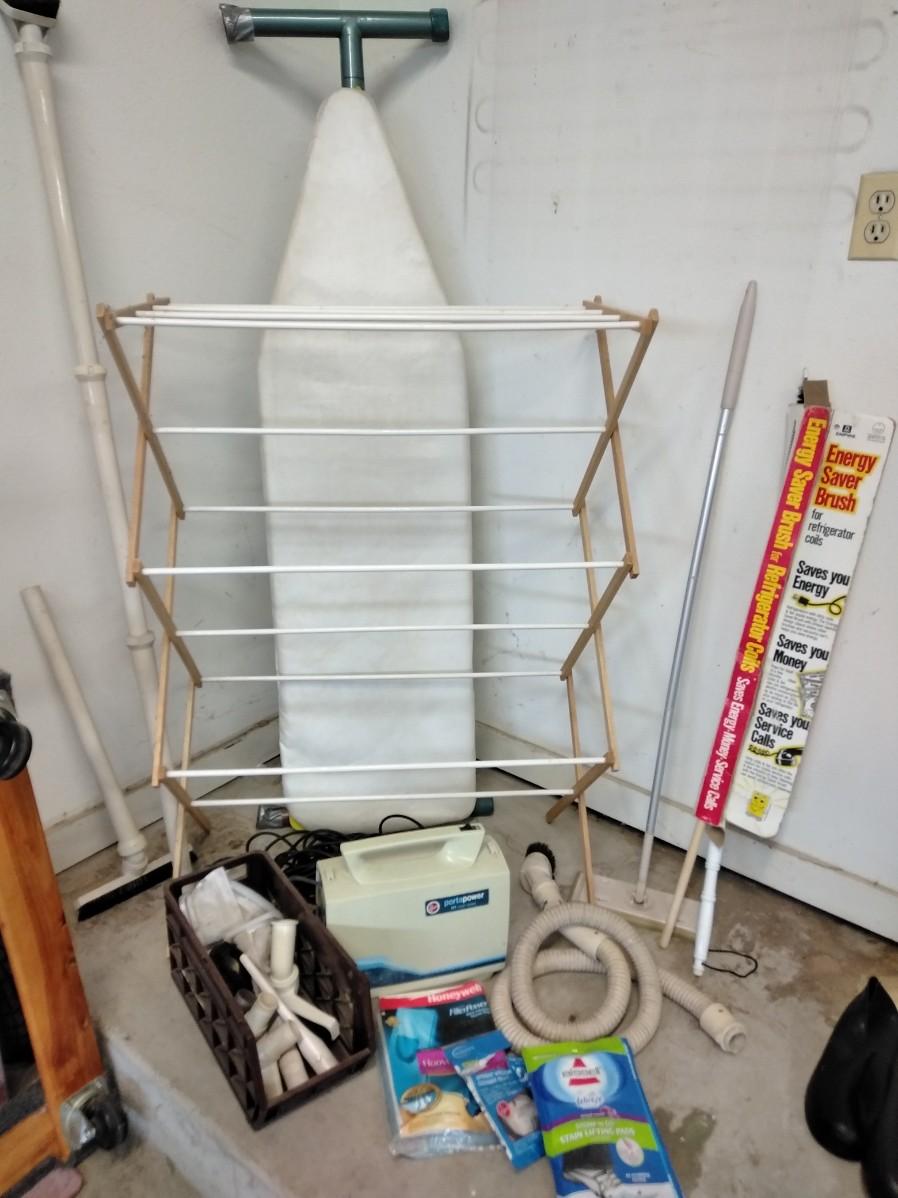 SMALL HOOVER CANISTER VACUUM, IRONING BOARD, CLOTHES DRYING RACK AND MORE