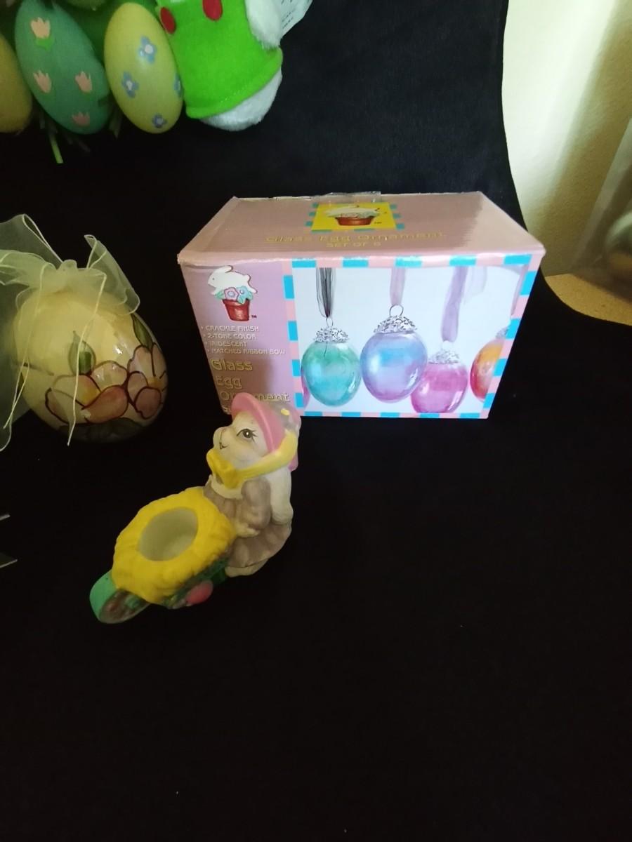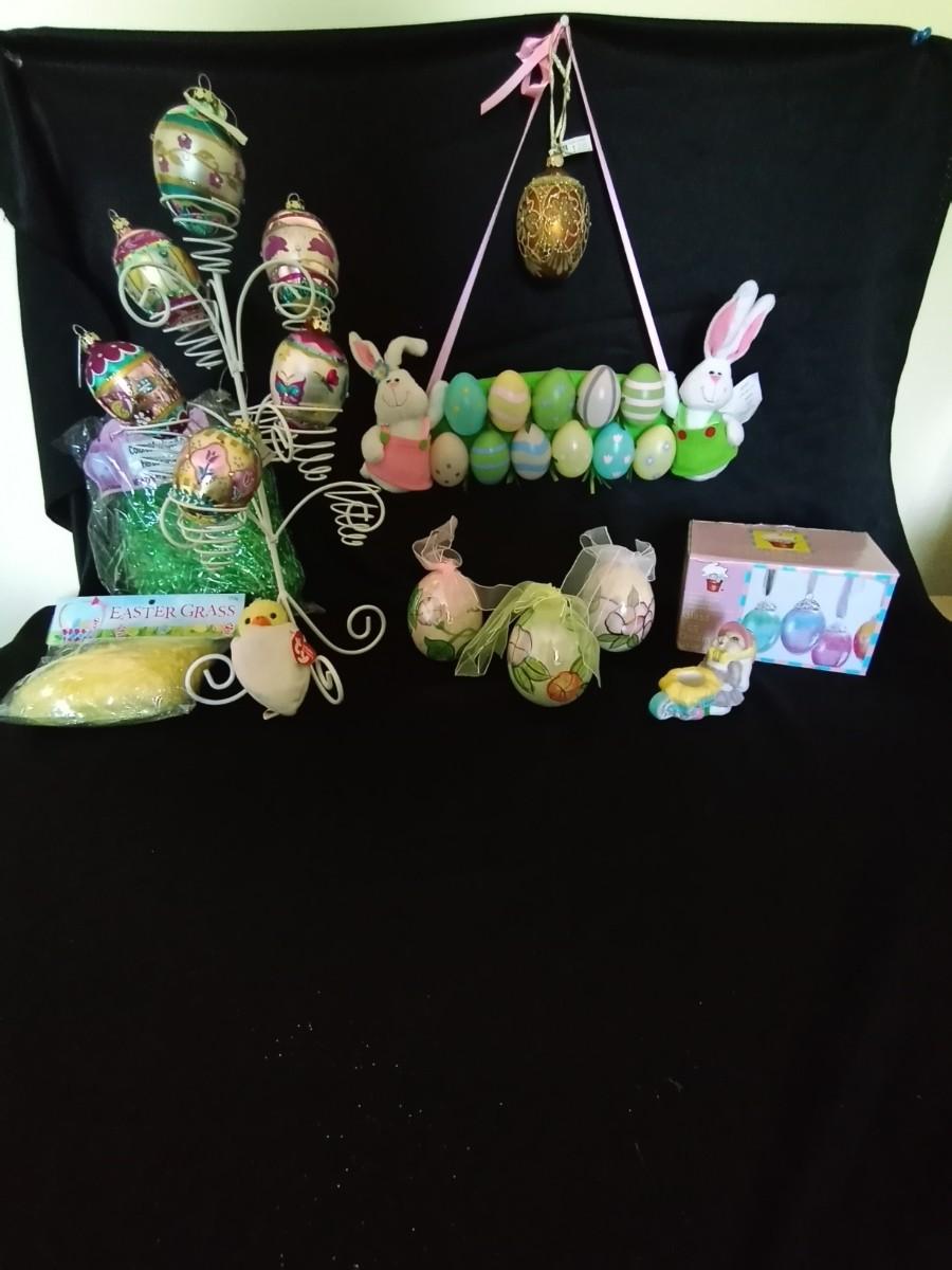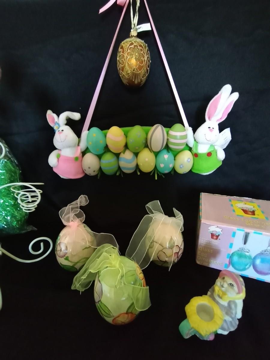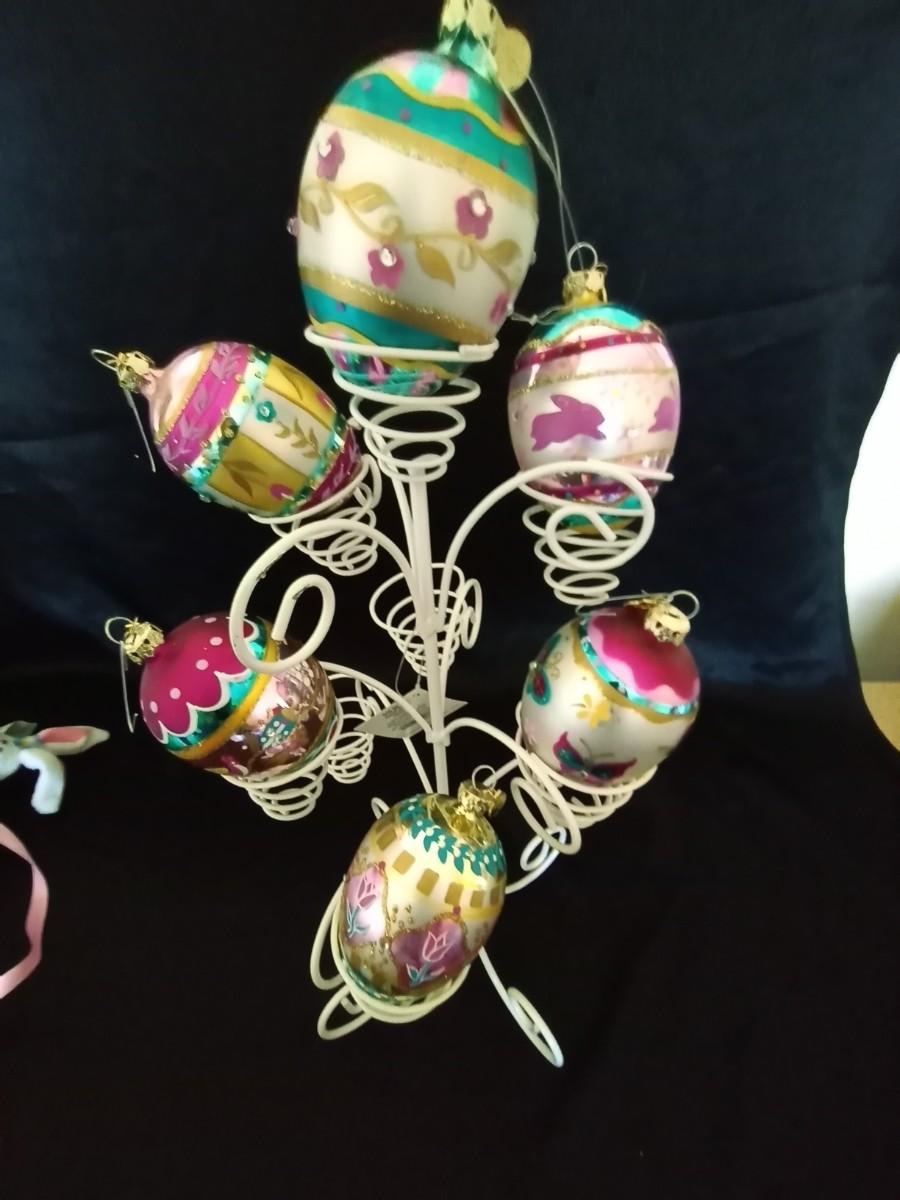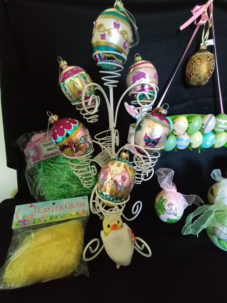 GLASS EGG ORNAMENTS, METAL DYE EGG HOLDER, COLORED GRASS,, AND MORE