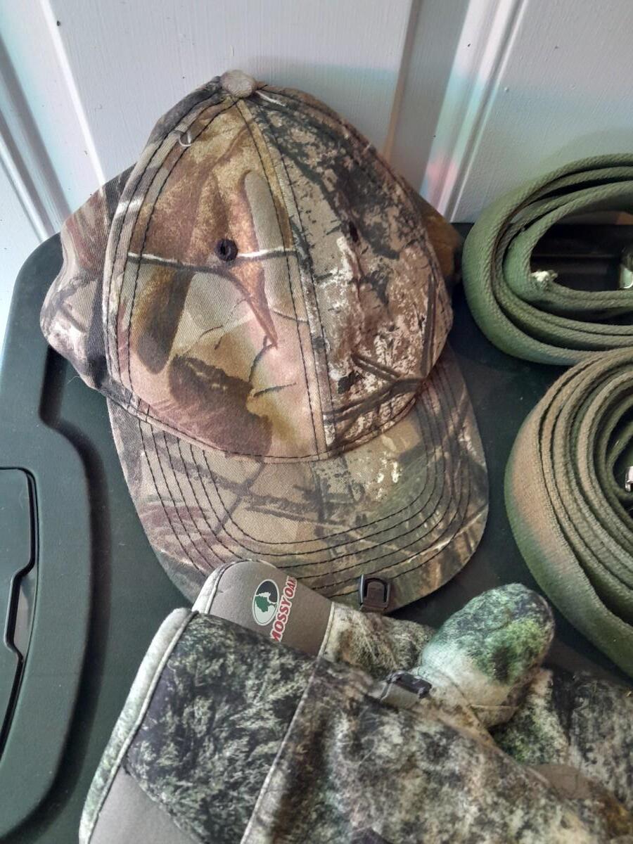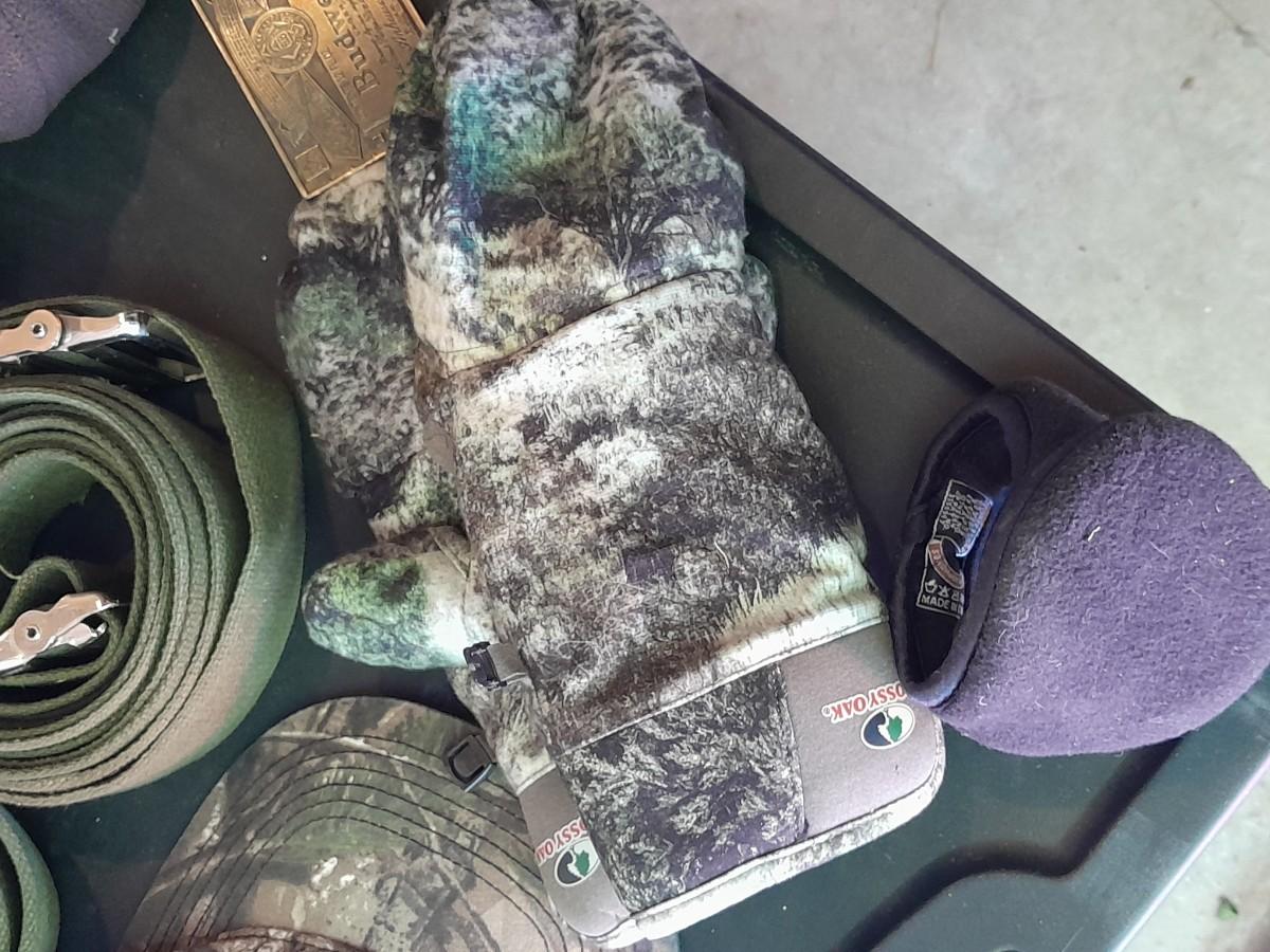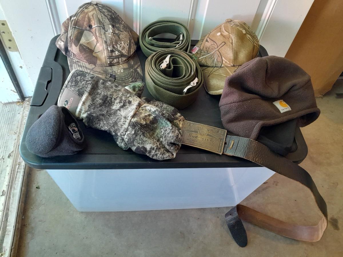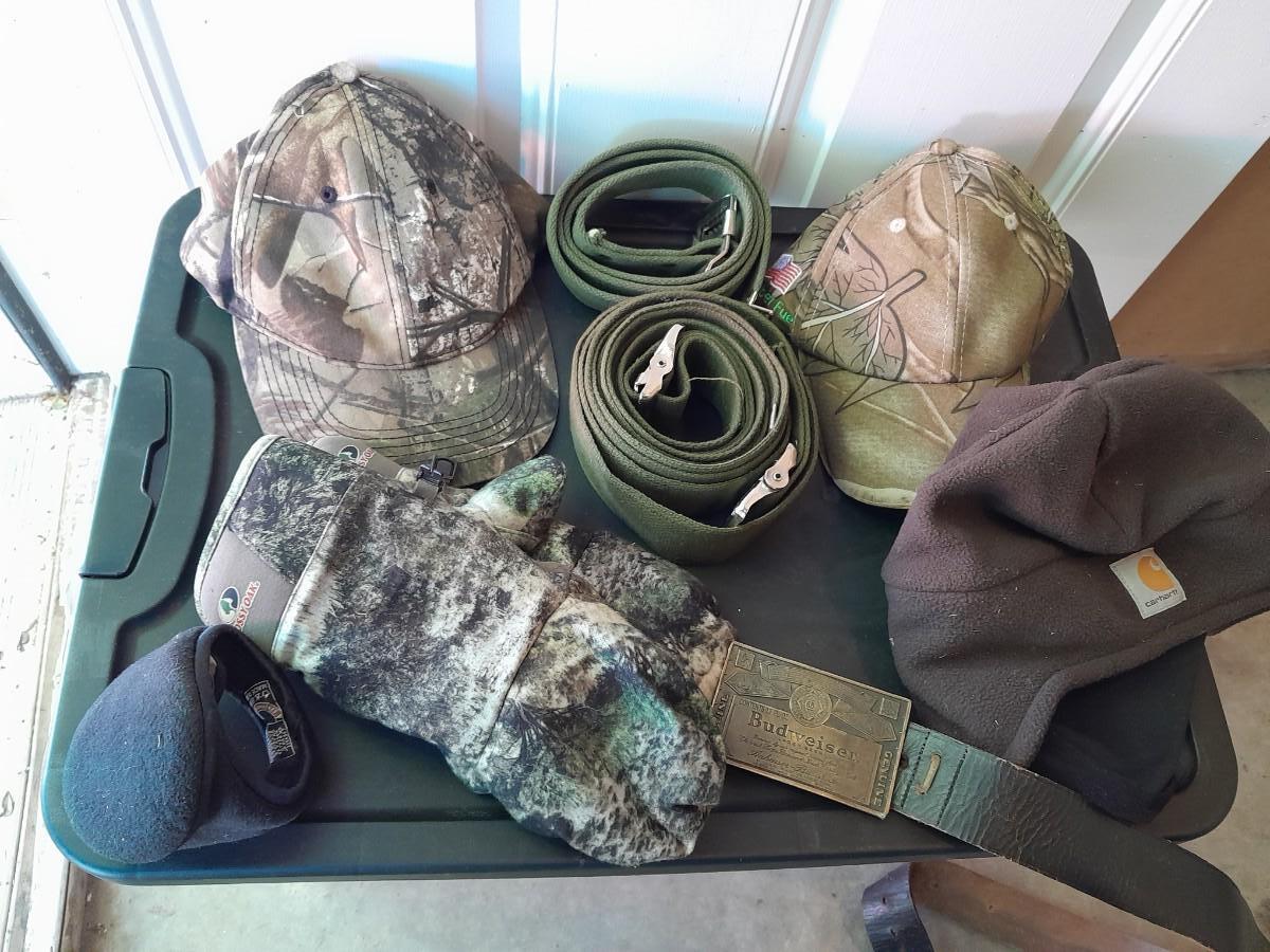CAMOFLAUGE WINTER GEAR, MITTENS, TWO BASEBALL HATS, BLACK EARMUFFS, CARHART CAP, AND TWO GREEN STRAPS, AND A BUDWEISER BELT BUCKLE