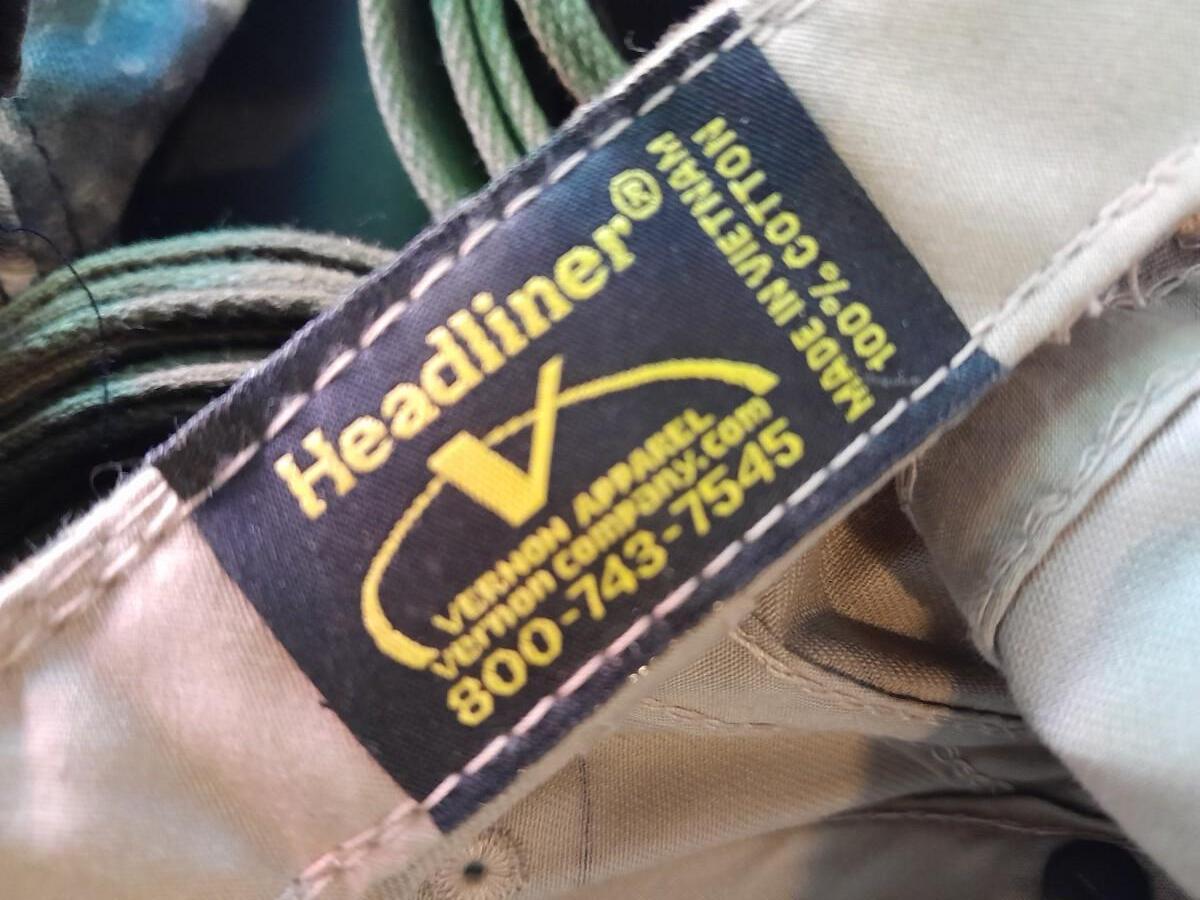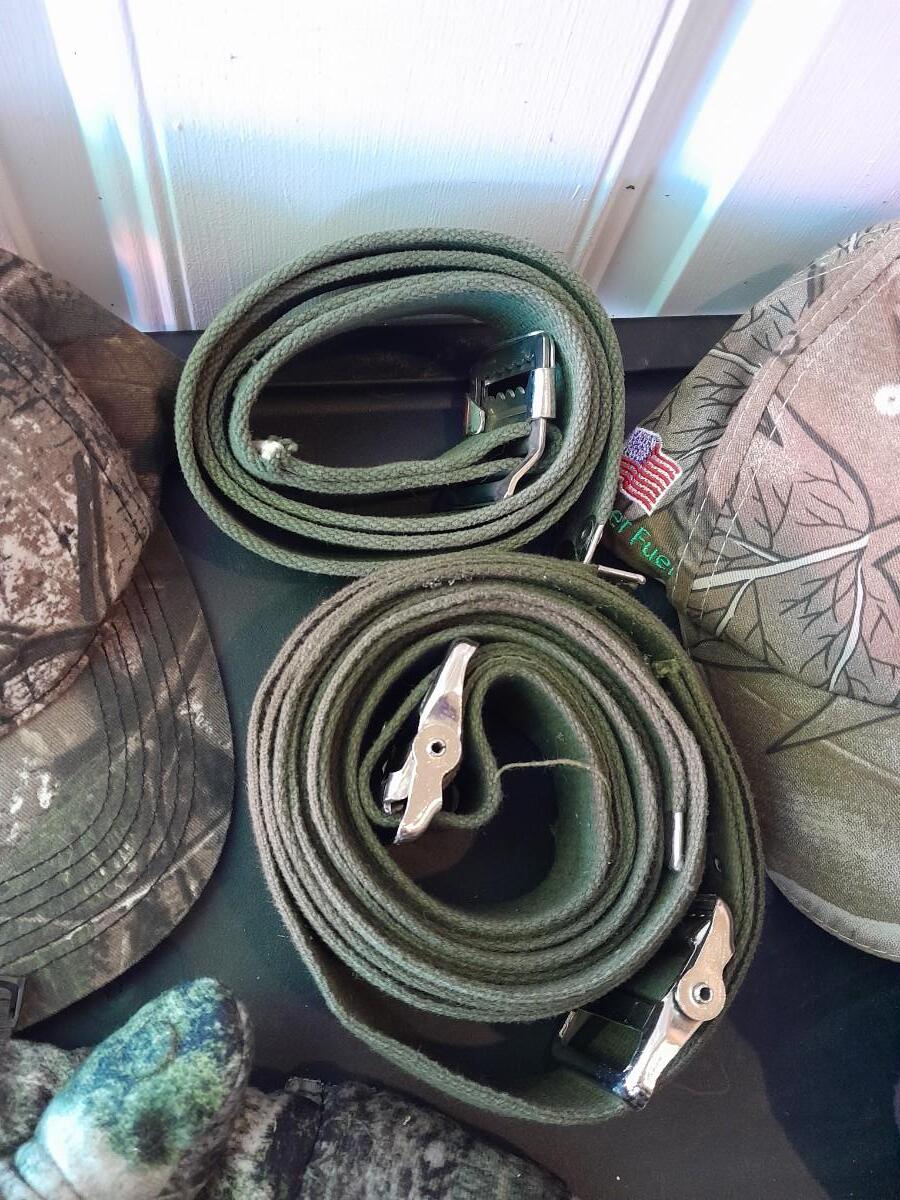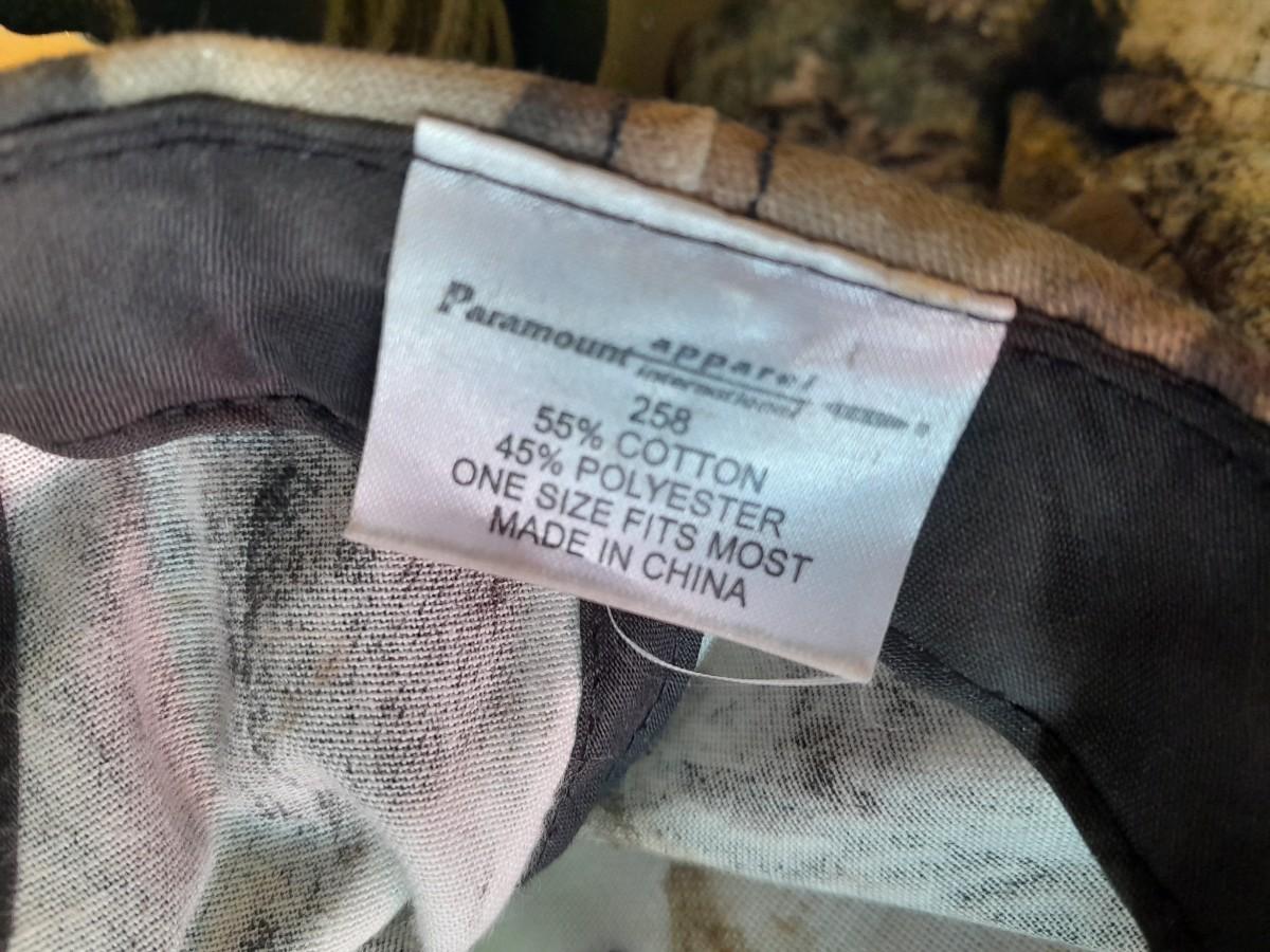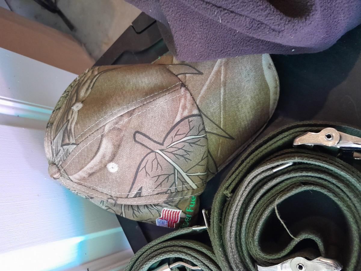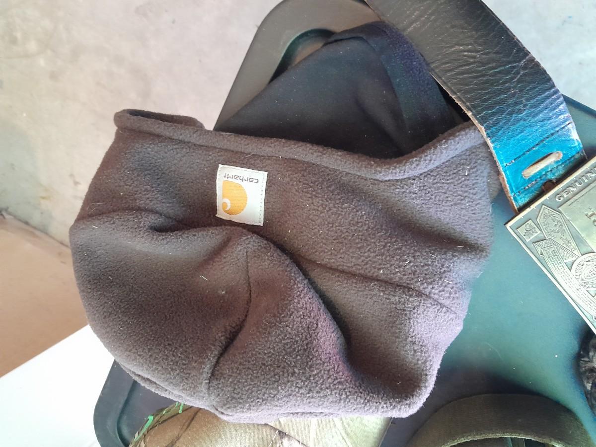 CAMOFLAUGE WINTER GEAR, MITTENS, TWO BASEBALL HATS, BLACK EARMUFFS, CARHART CAP, AND TWO GREEN STRAPS, AND A BUDWEISER BELT BUCKLE