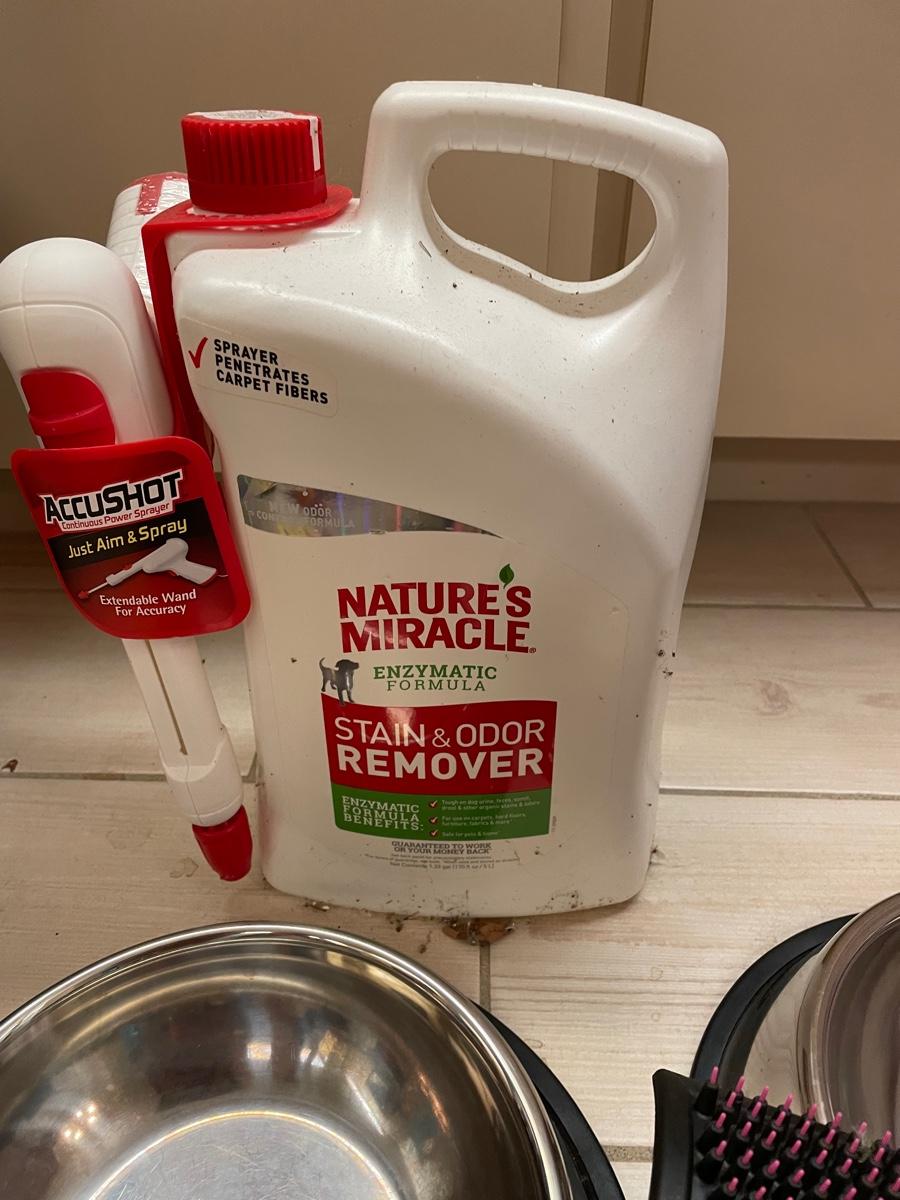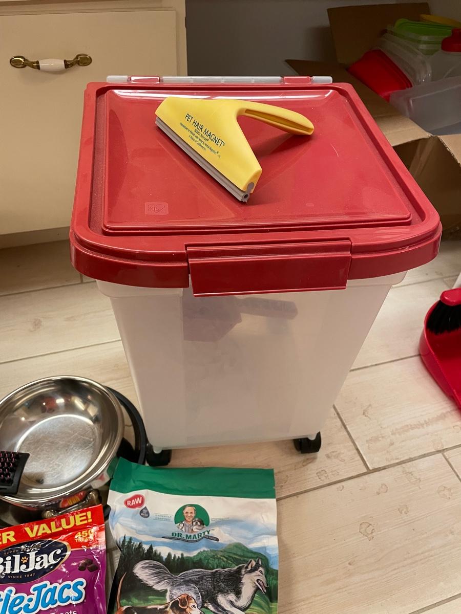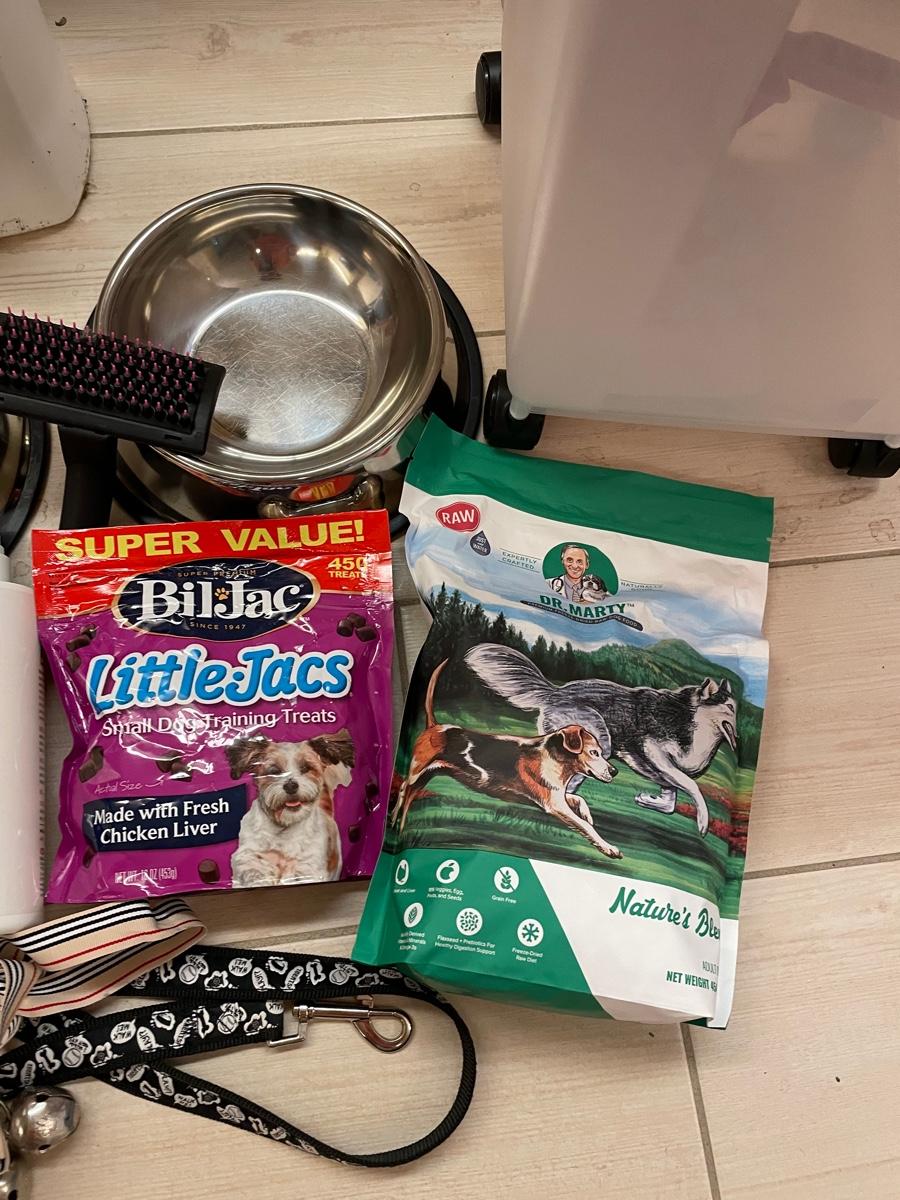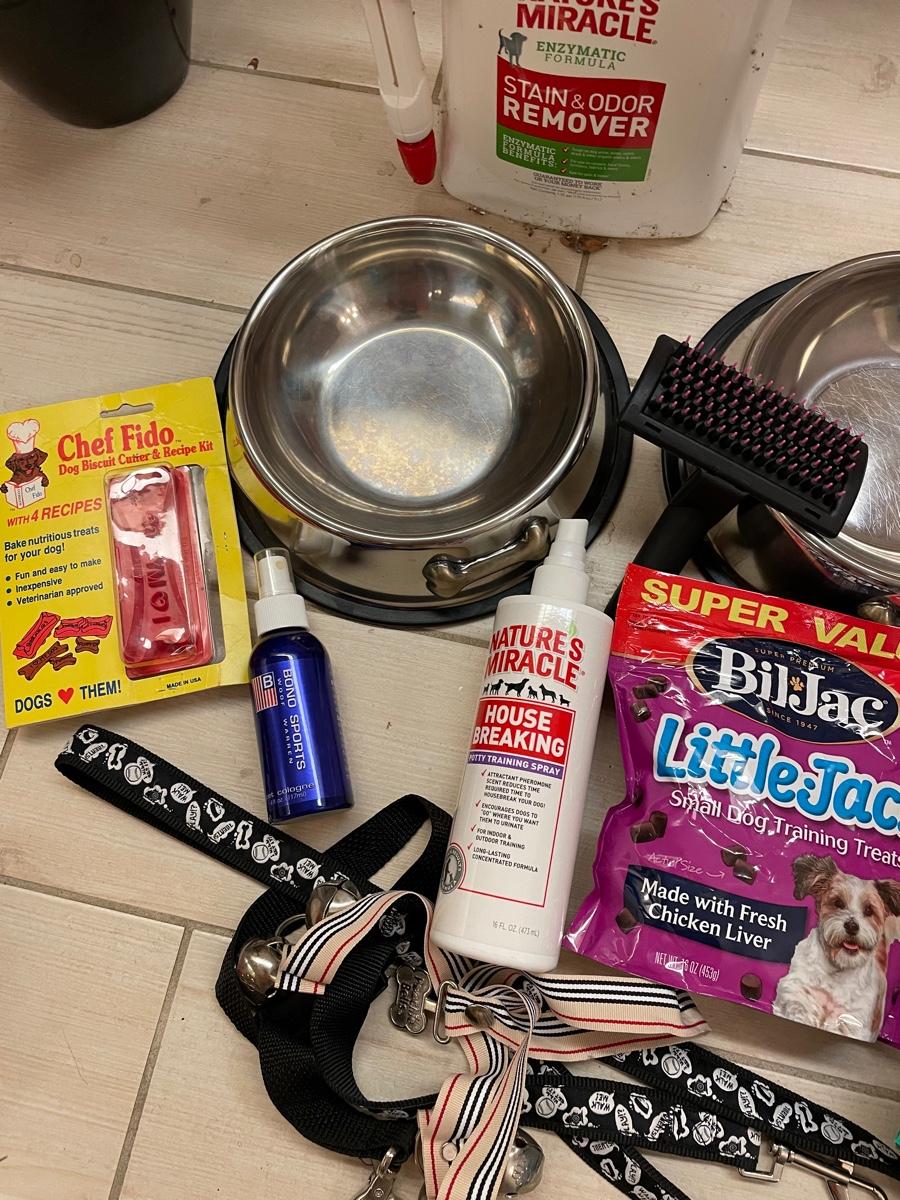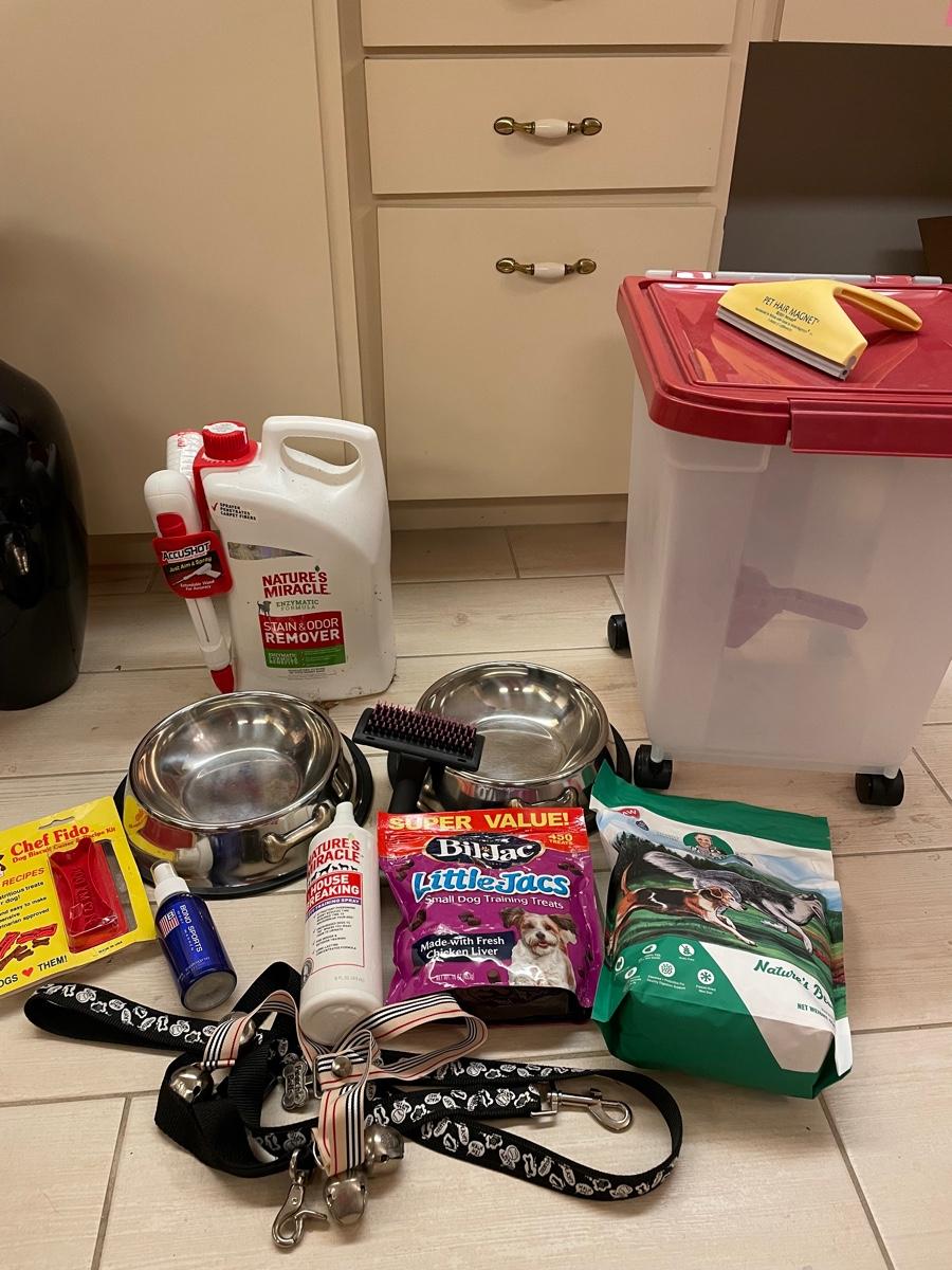 Assortment of dog supplies including food storage bin, pair of metal dishes, treats, leash, Nature's Miracle housebreaking spray and odor remover, dog biscuit cookie cutter, brush and pet hair remover