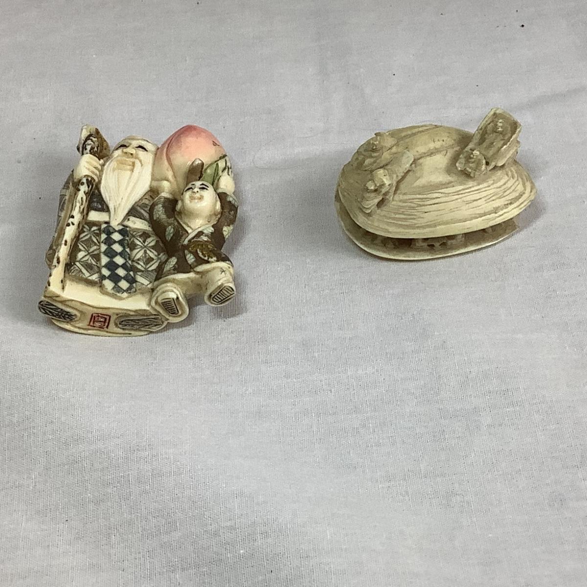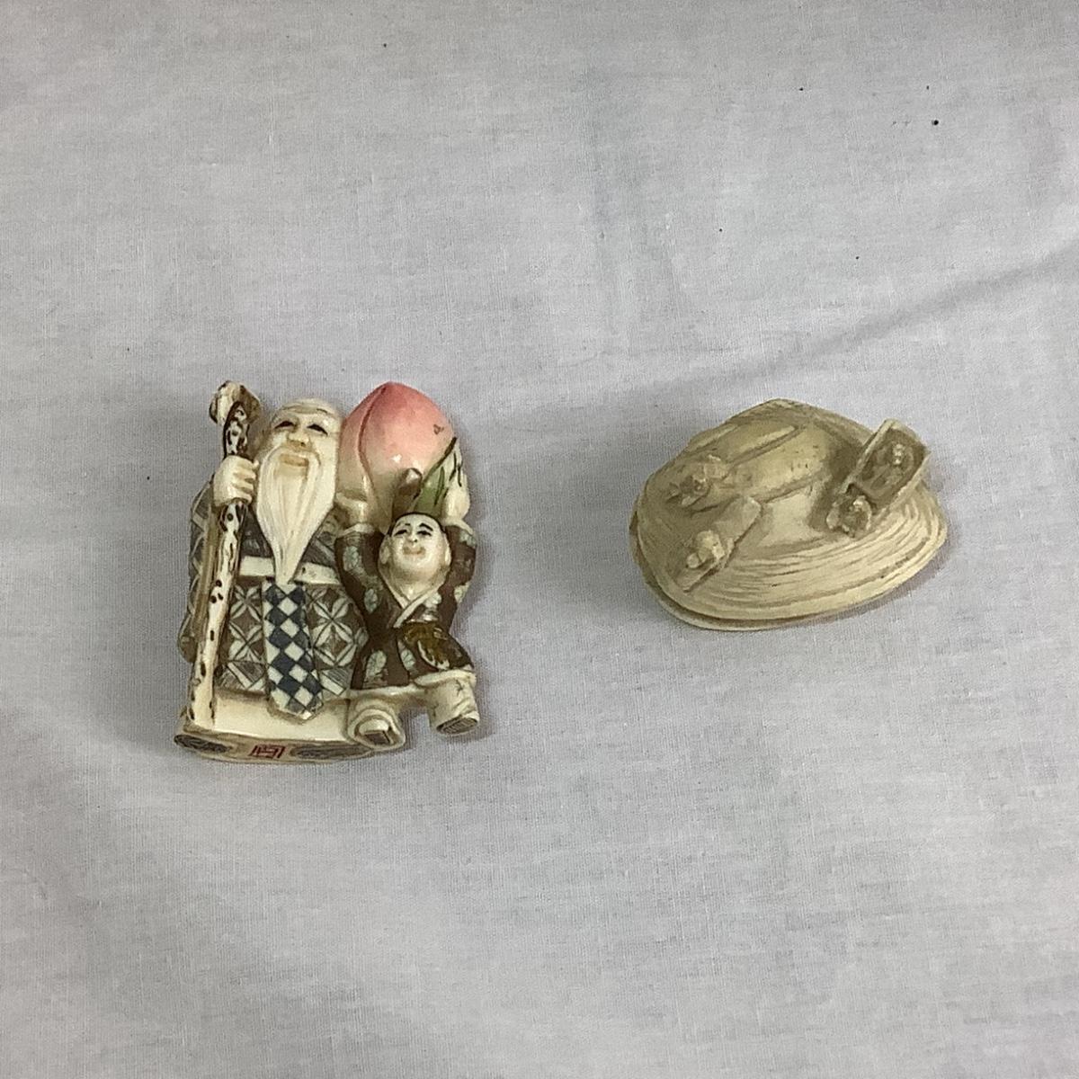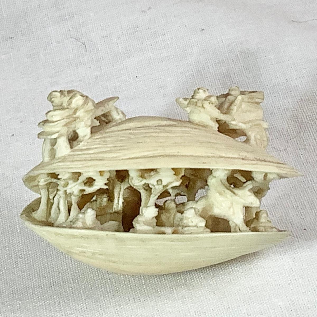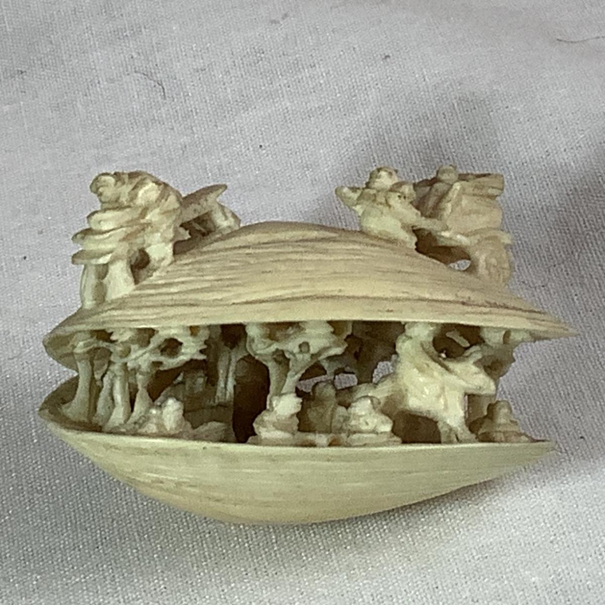 Lot 373 Japanese Carved Celluloid Clam Shell Diorama & Japanese Detailed Hand Carved Netsuke Sculpture, Man with Child