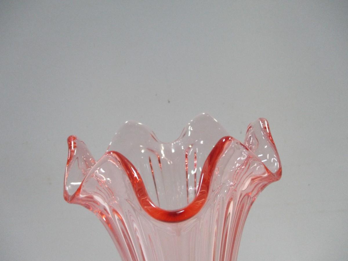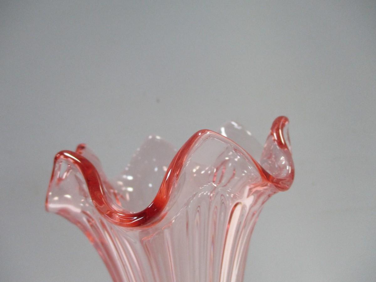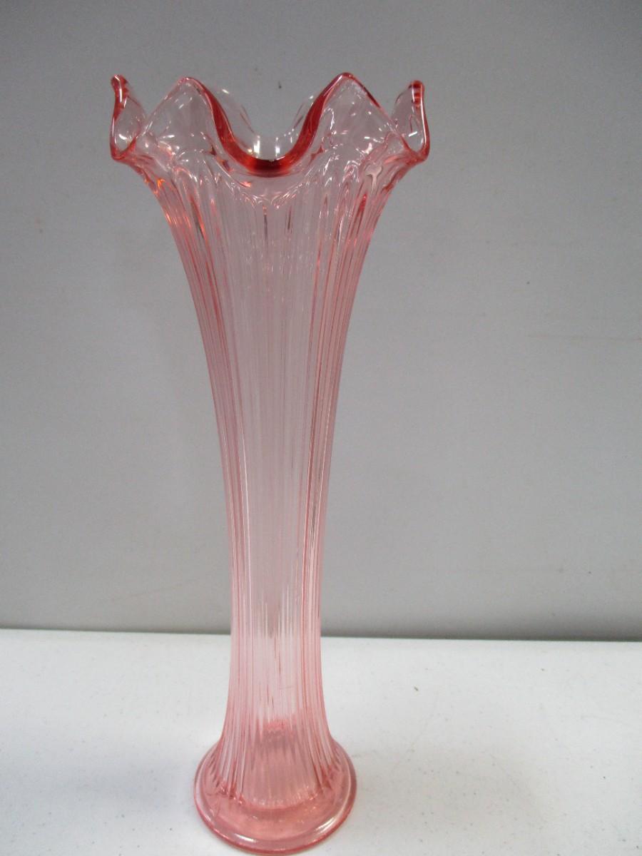 Lot 373 - Pink Ribbed Art Glass Swung Vase w/ Fluted Top 11 3/4"