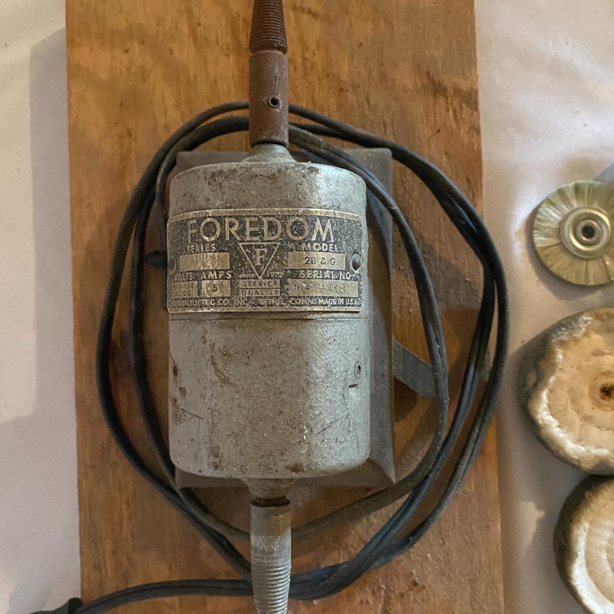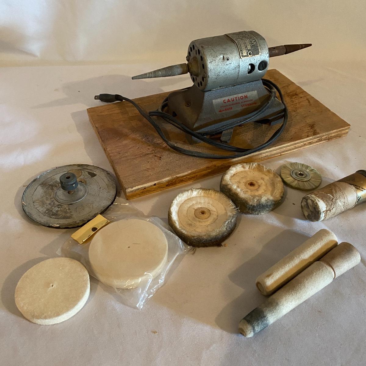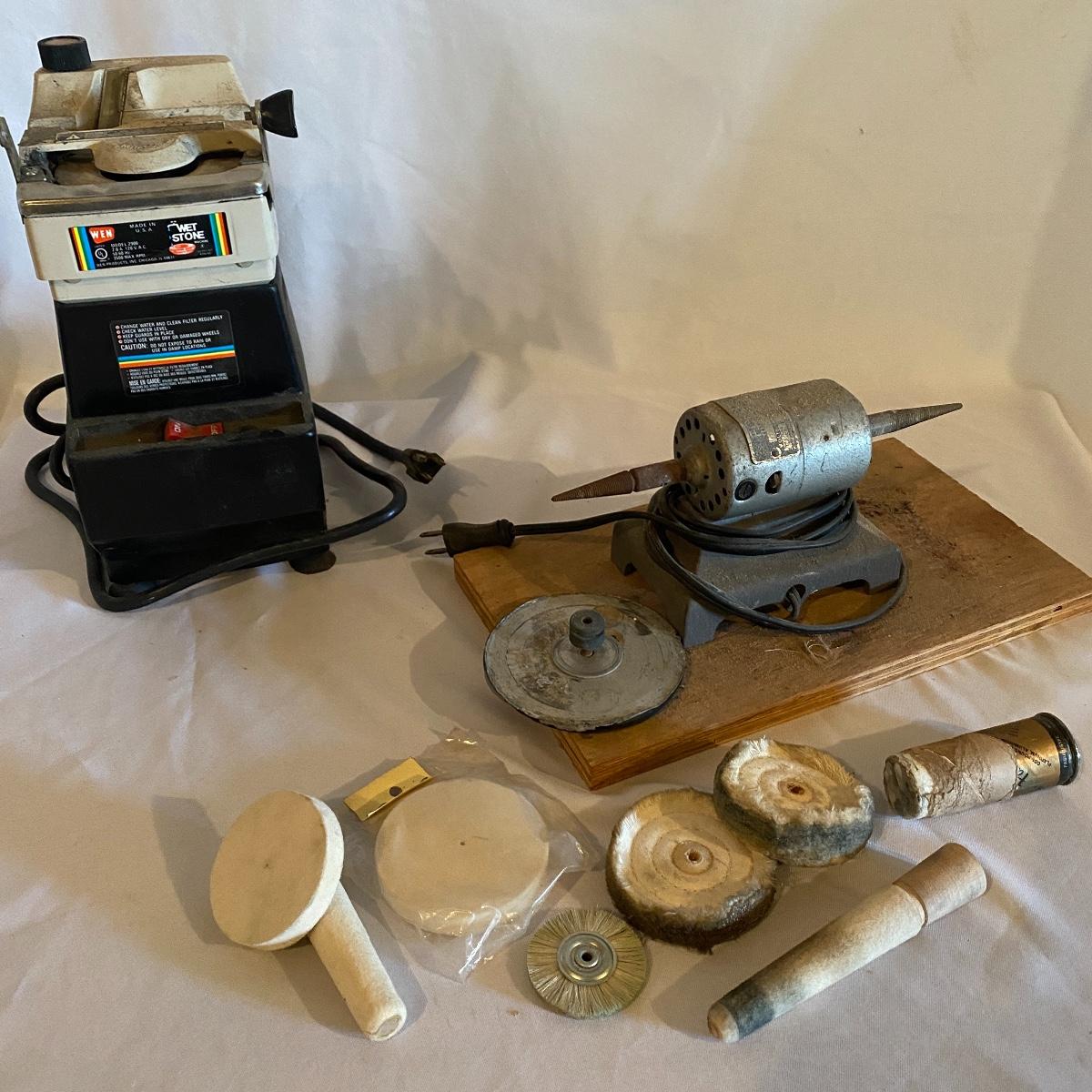 These two machines may be helpful with your hobby. Includes a WetStone Grinder model # 2900 from WEN products. We were unable to power it on but you may be able to tweak something that we were unaware of? Lot also includes a polisher from Foredom. Unable to read serial numbers but it appears to say “2B & G “ for model #. It powered on without issue. It has a lever to move for Buff or Stone. The machine is attached to a piece of wood. We’ve included some polishing accessories as well. Shipping available.