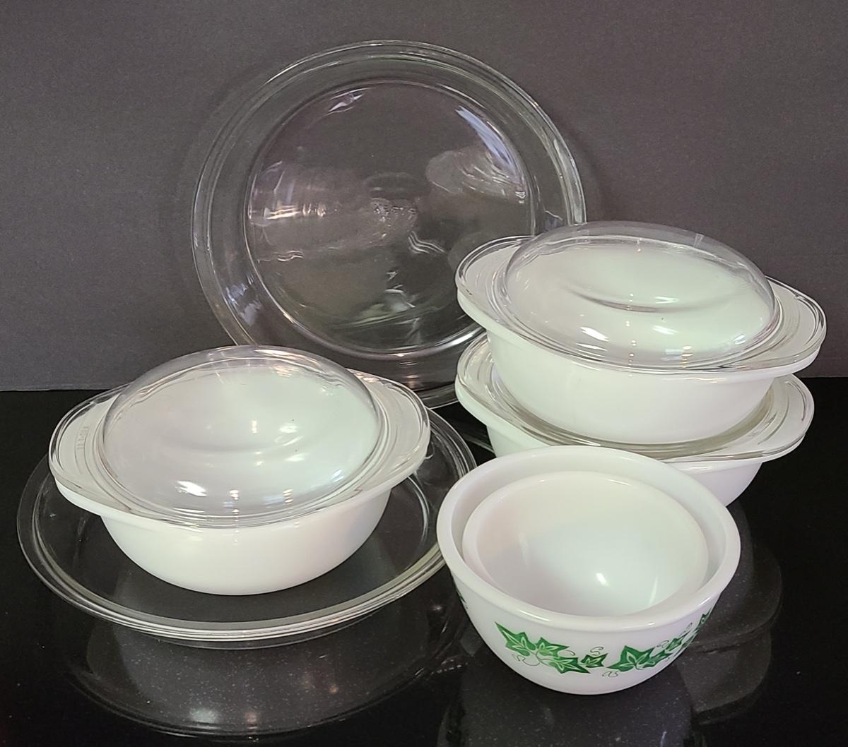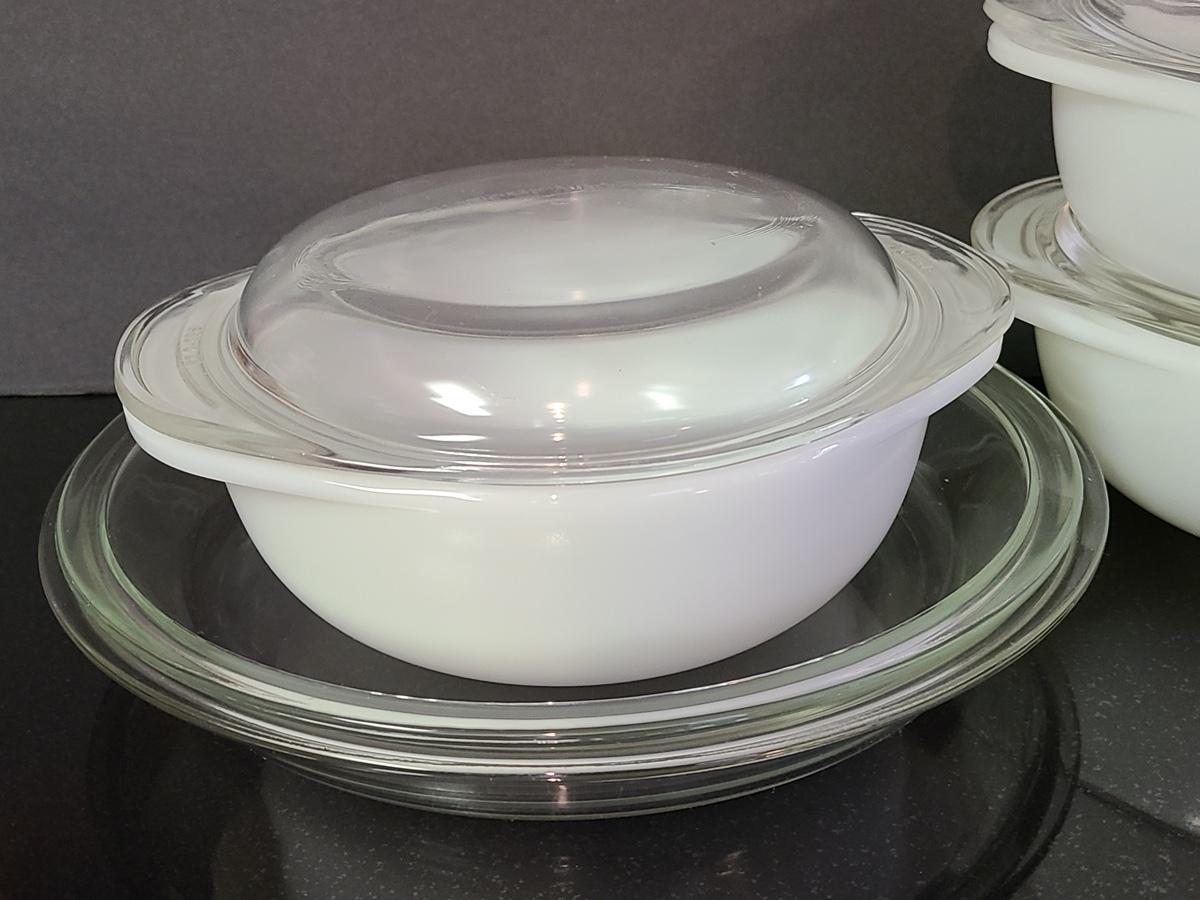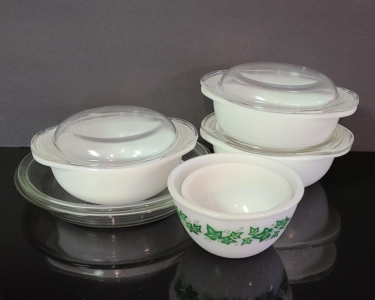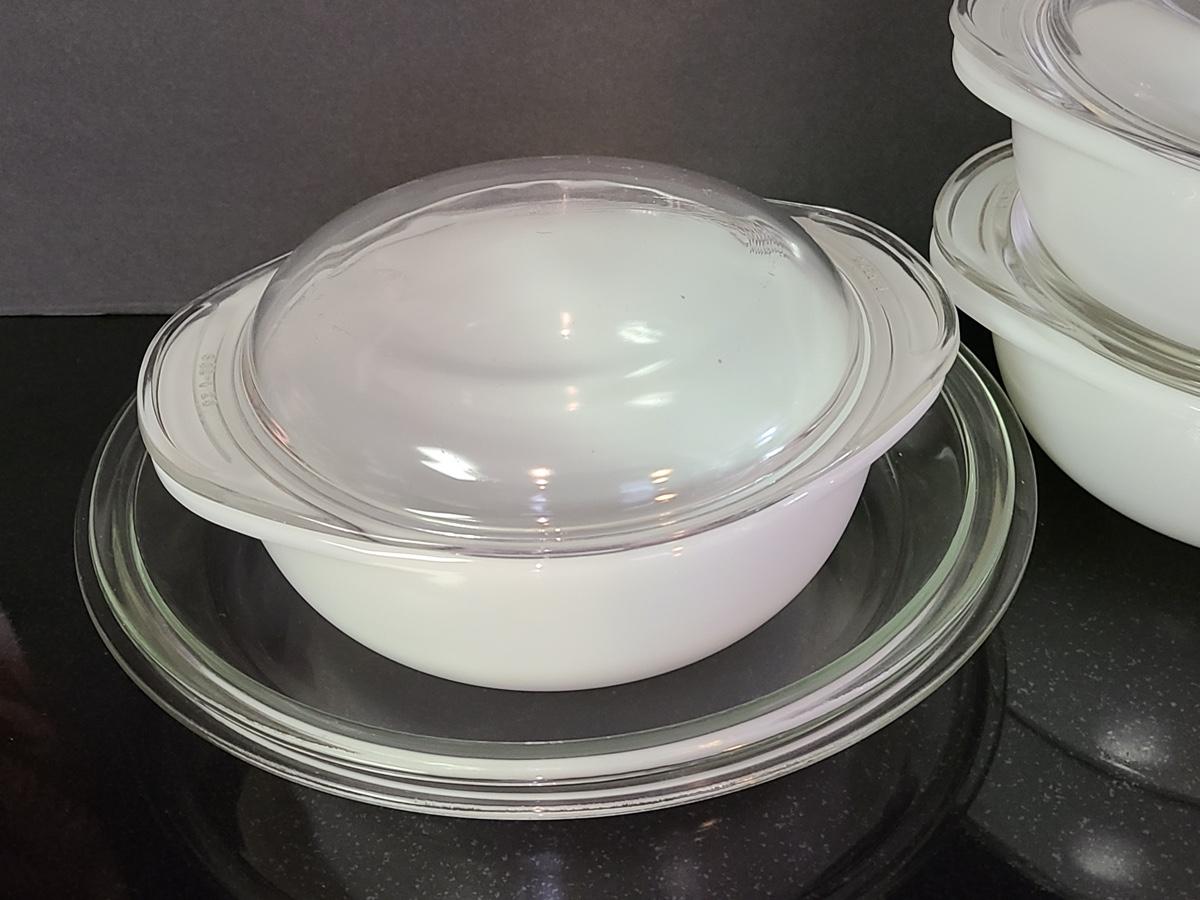 Lot 374: Pyrex Milk Glass  Covered Casseroles, Pie Plates and More