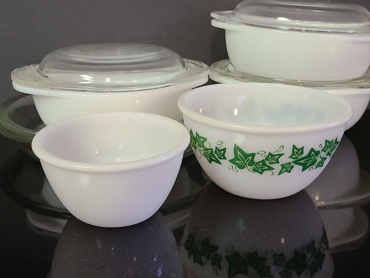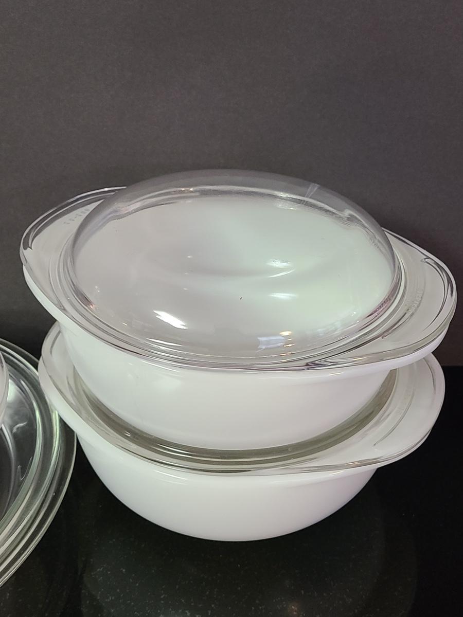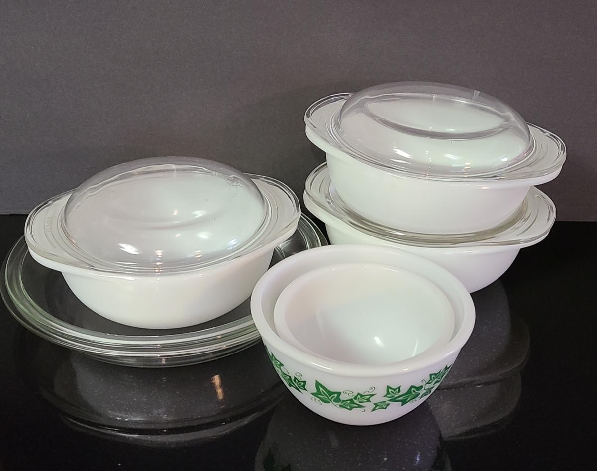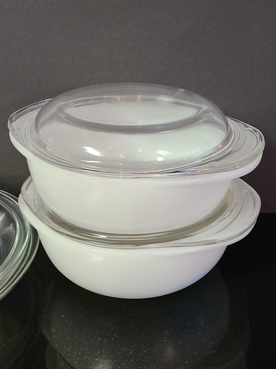 Lot 374: Pyrex Milk Glass  Covered Casseroles, Pie Plates and More