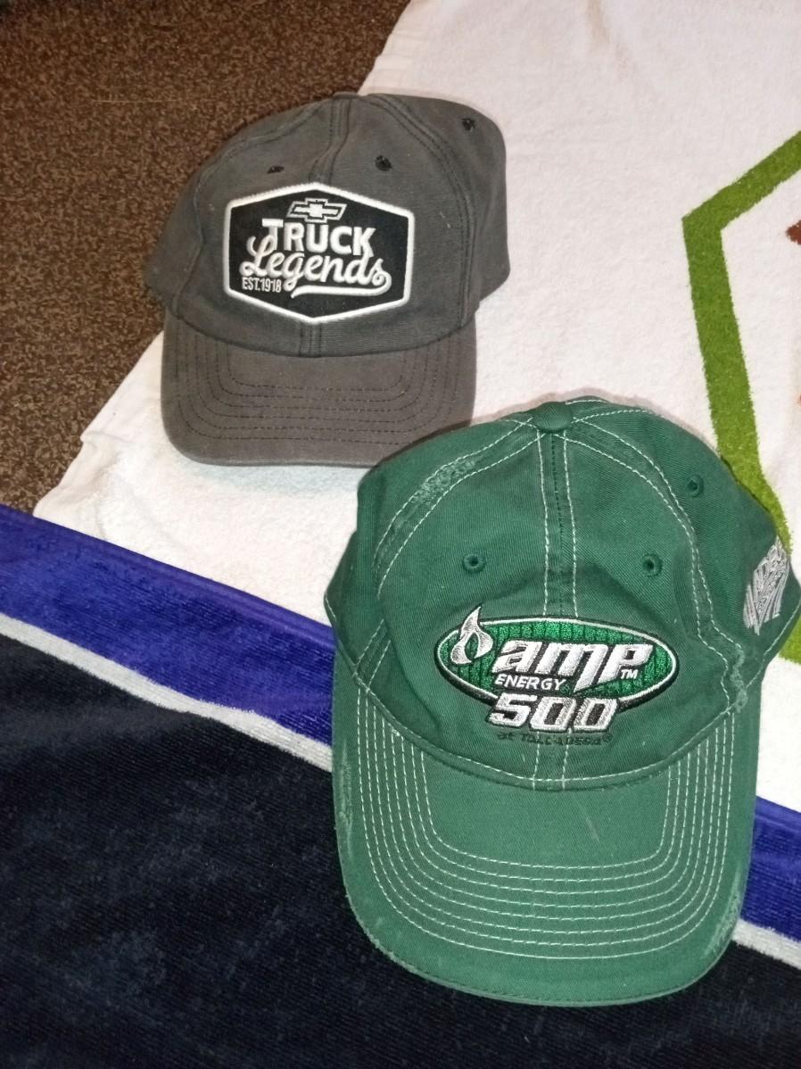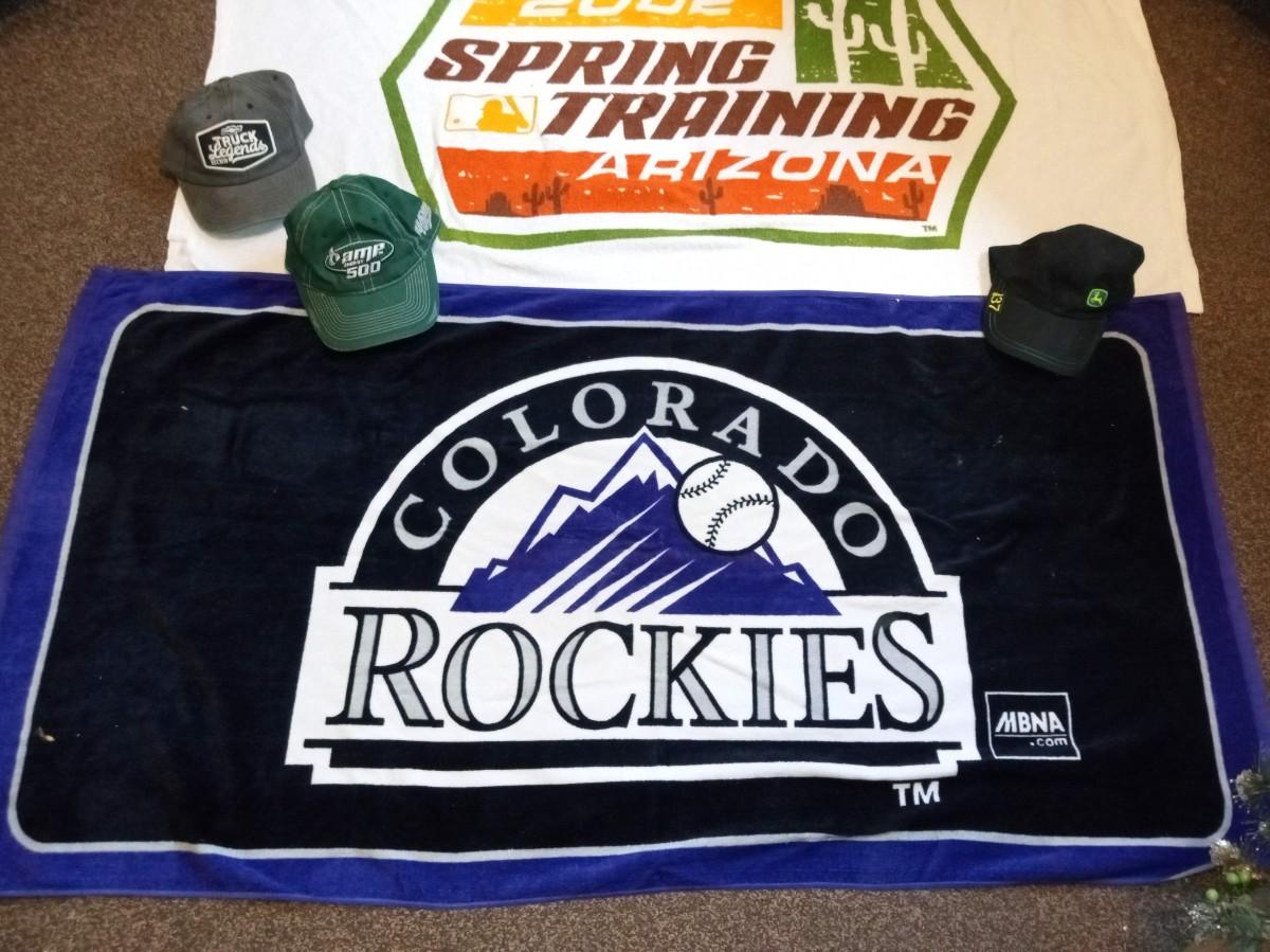 LOT 374  TWO BEACH TOWELS AND 3 BALL CAPS
