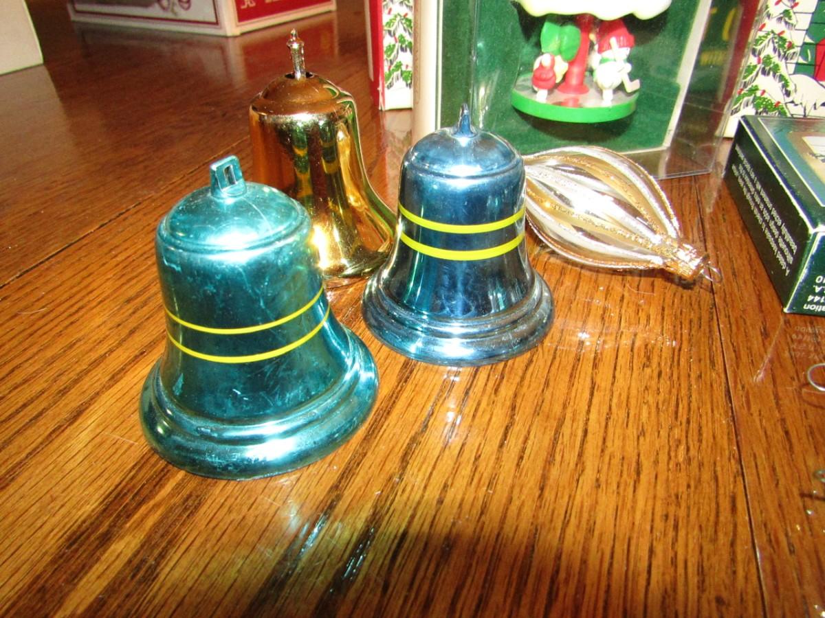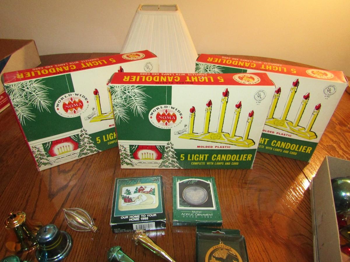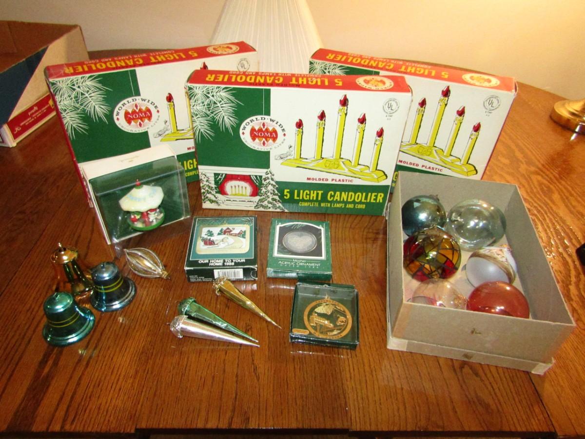 3 VINTAGE CANDOLIERS IN BOXES, ORNAMENTS IN BOXES, GLASS ORNAMENTS AND 3 METAL BELLS