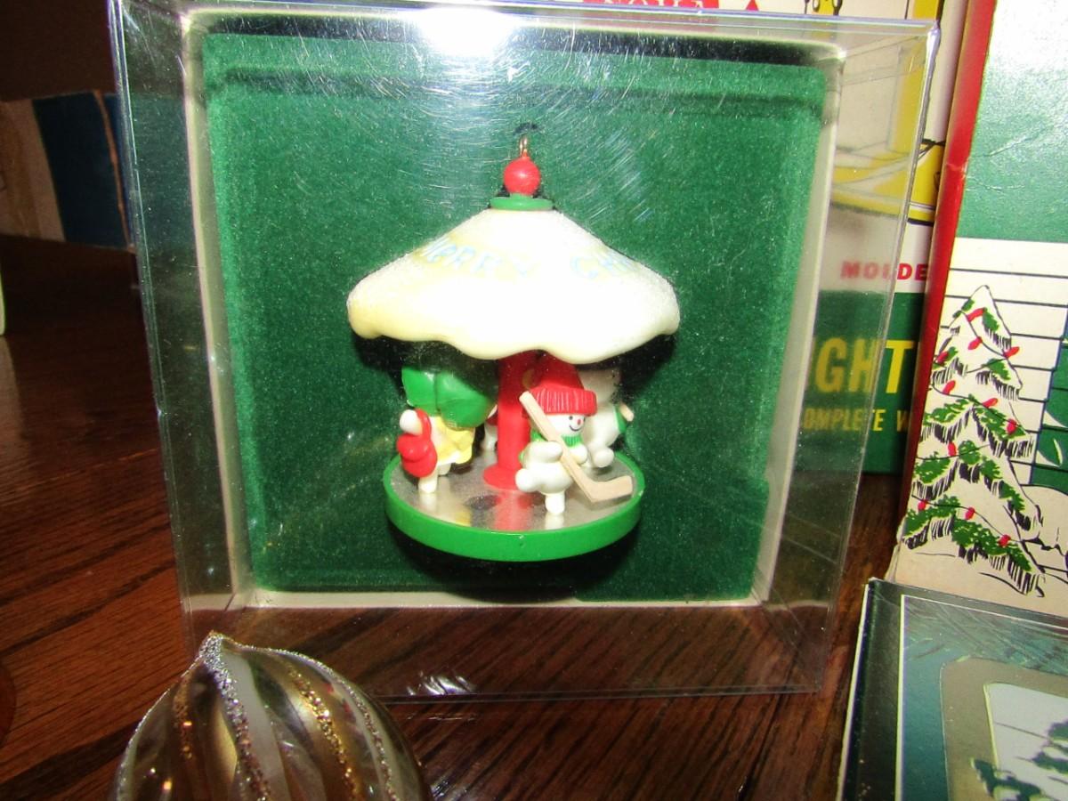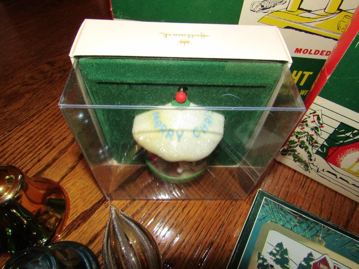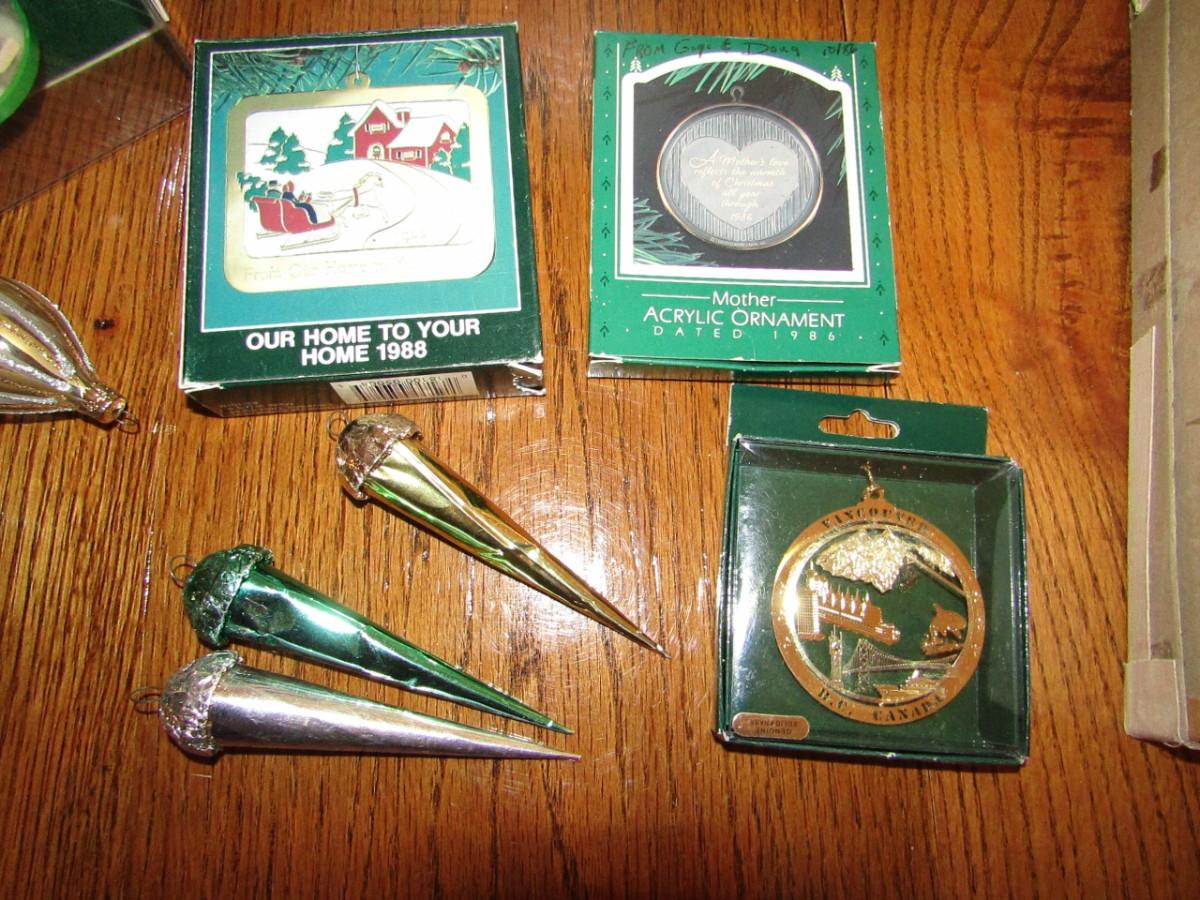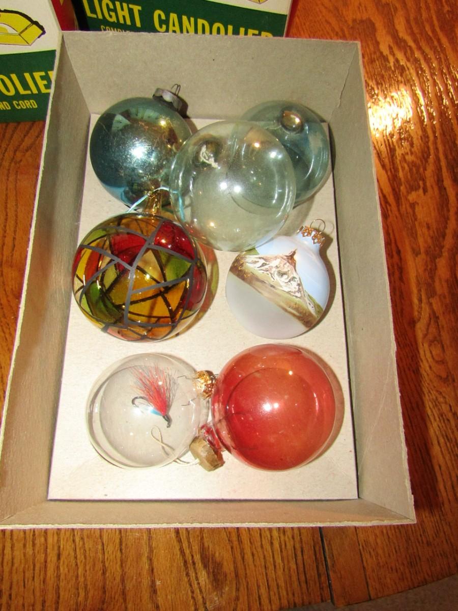 3 VINTAGE CANDOLIERS IN BOXES, ORNAMENTS IN BOXES, GLASS ORNAMENTS AND 3 METAL BELLS