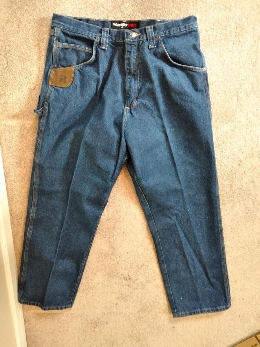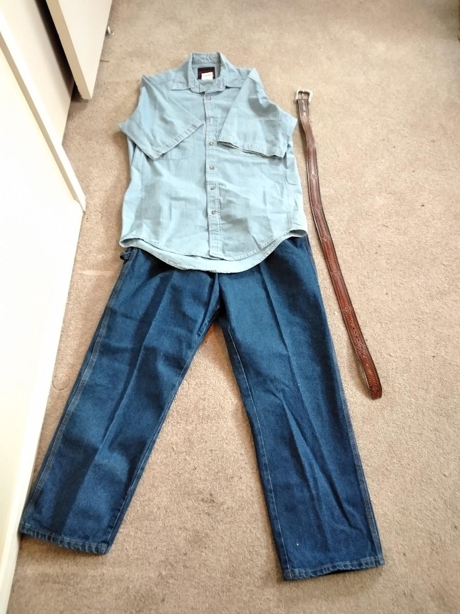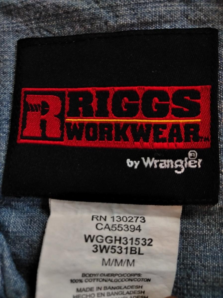 RIGGS WORKWEAR OUTFIT INCLUDING PANTS SIZE 36 X 30, RIGGS LARGE SHIRT, 38" LEATHER BELT. RIGGS BY WRANGLER