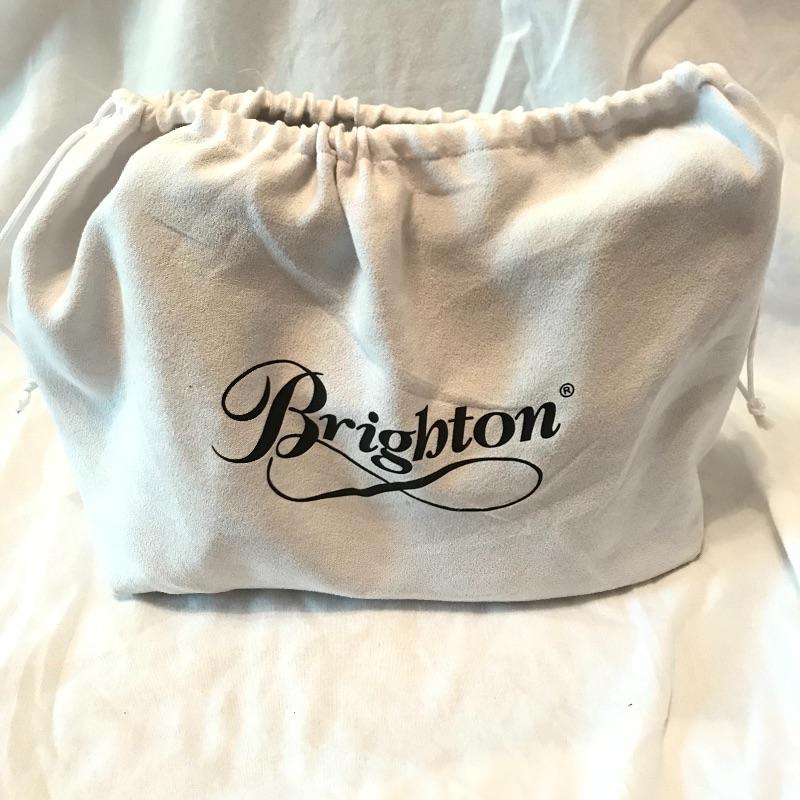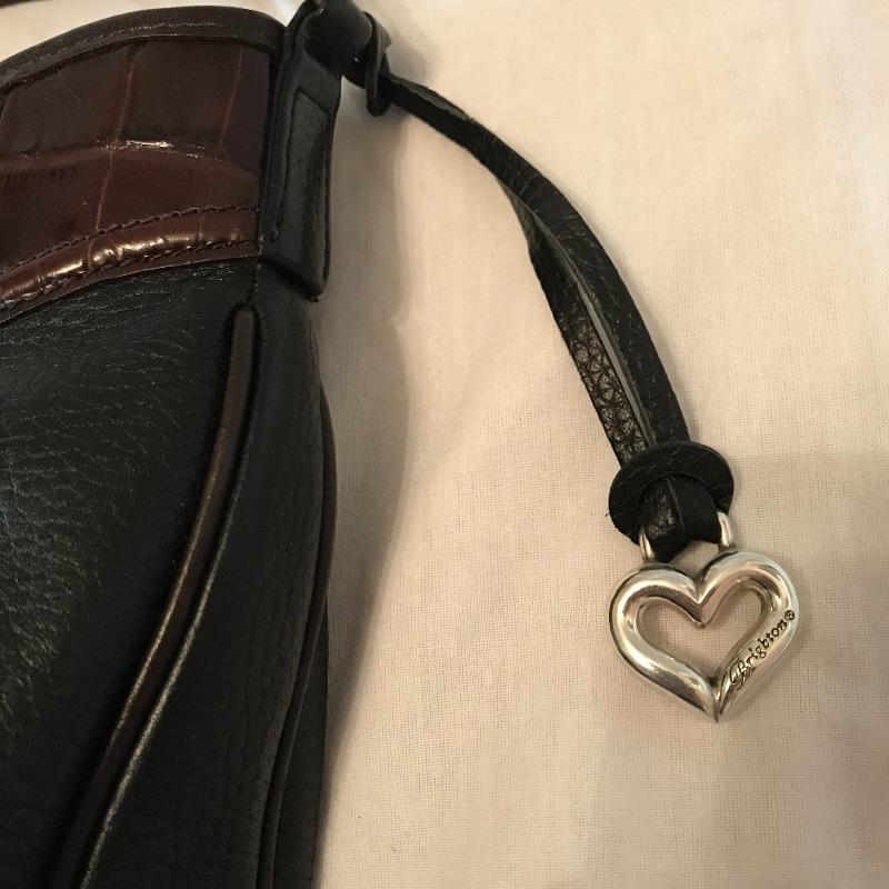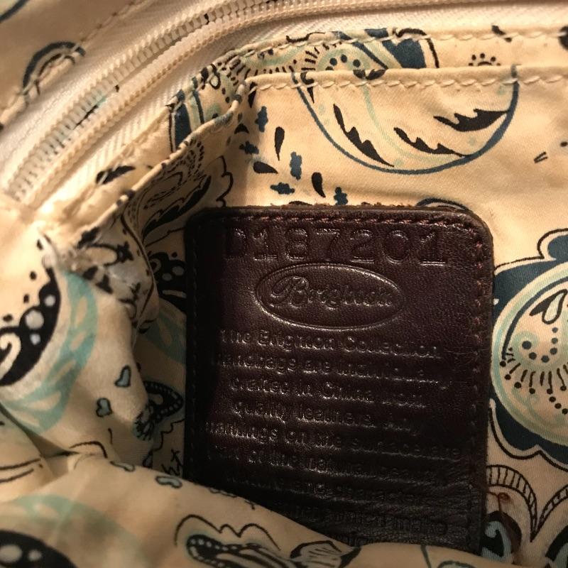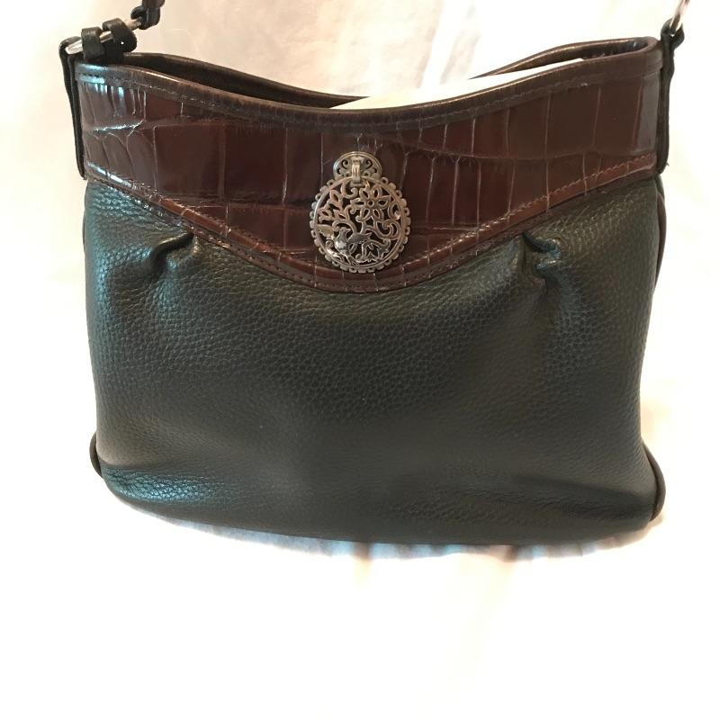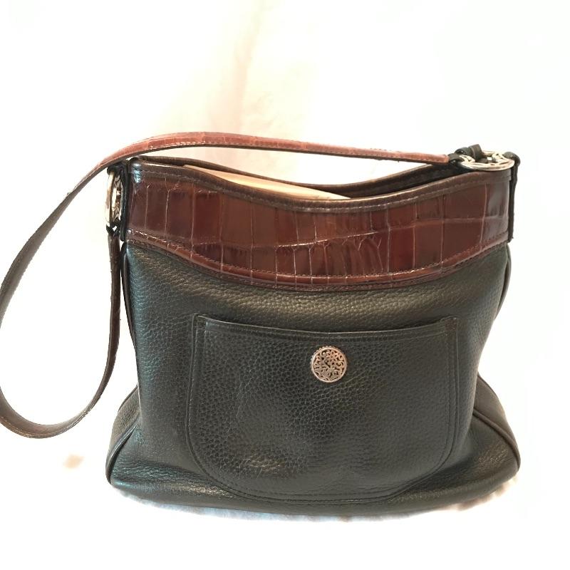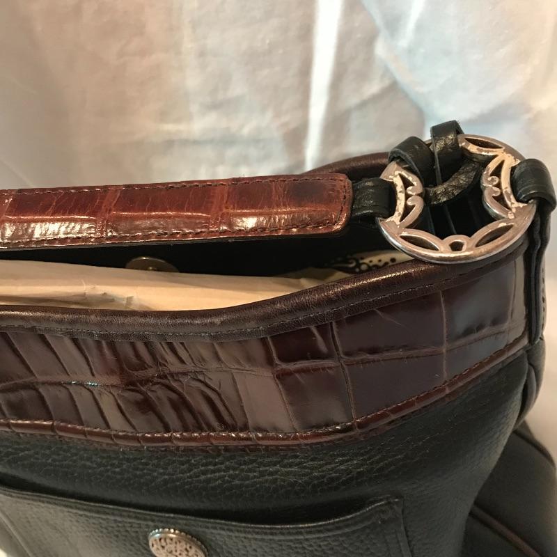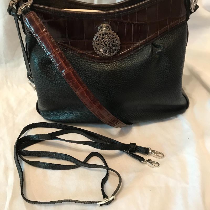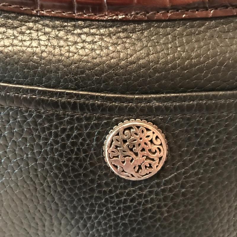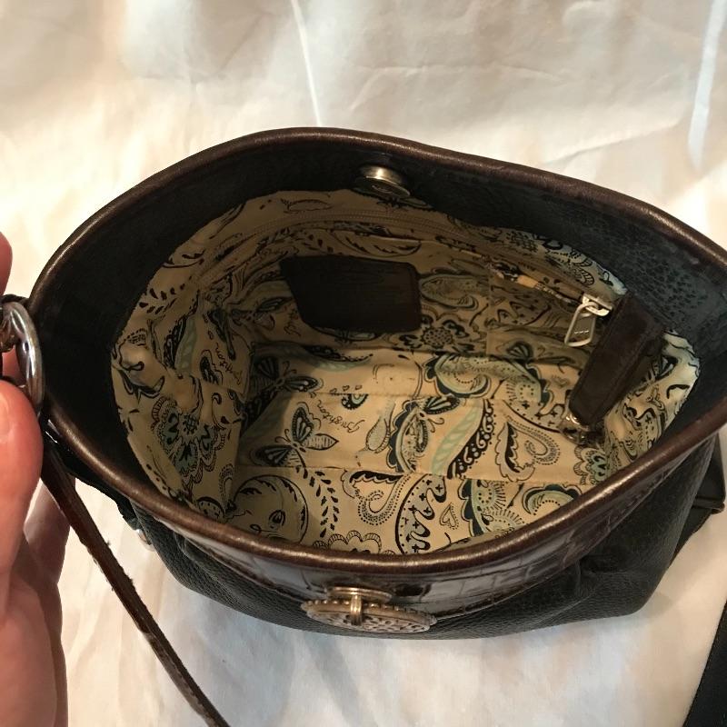Lovely brown croc style leather with black and a lovely paisley lining. The purse appears barely used with a magnetic button closure and a second long black shoulder strap. The purse appears to have been stored with paper and its shape is like-new! It measures approximately 11” x 9.5” and comes with a Brighton white storage bag. See images.