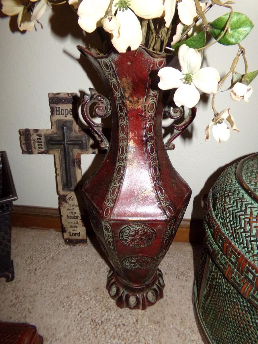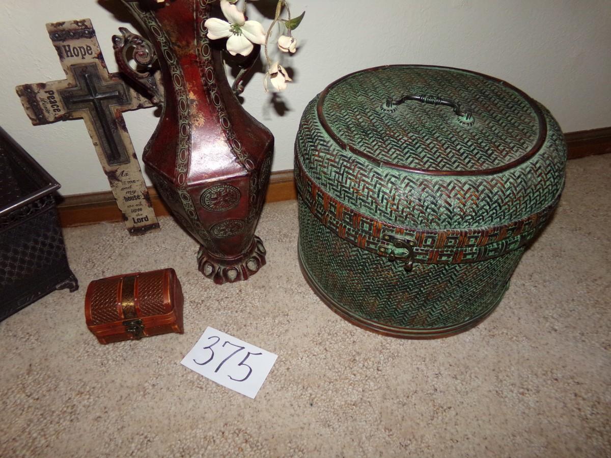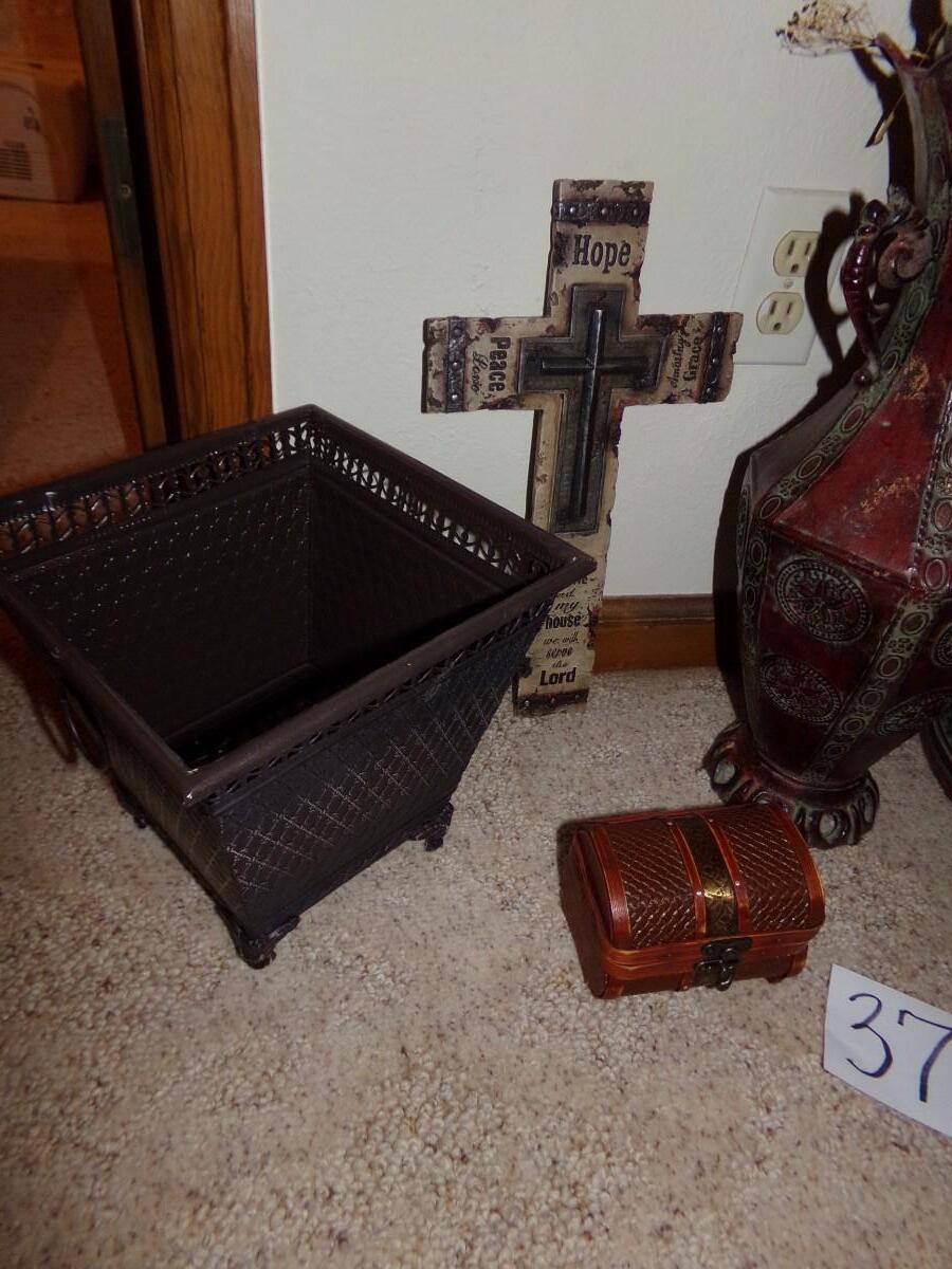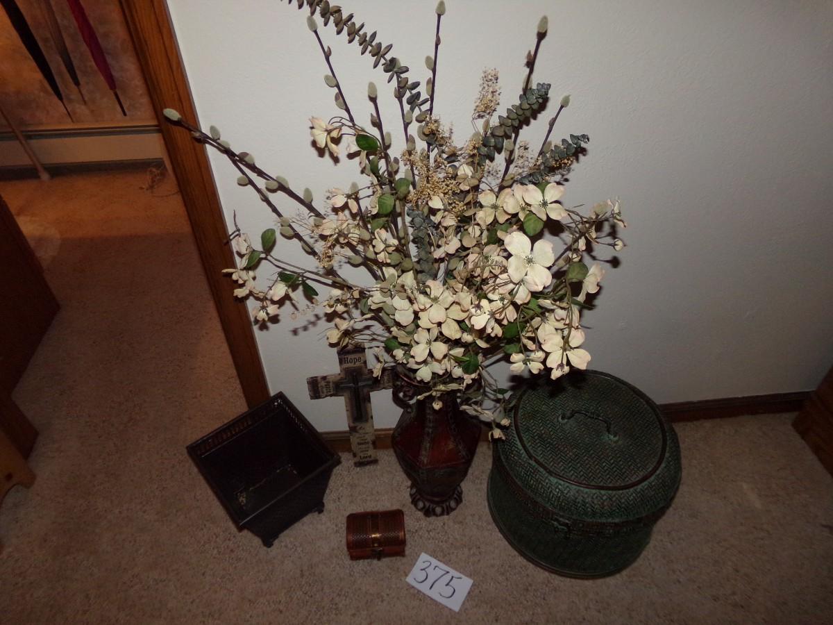 FAUX PLANT ARRANGEMENT WITH A METAL VASE, CHINESE SMALL BROWN WOVEN BOX, NICE WALL HANGING CROSS AND A LARGE WOVEN COVERED BASKET.