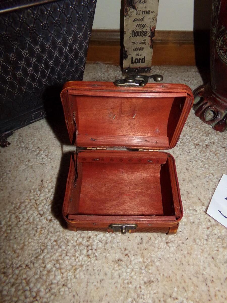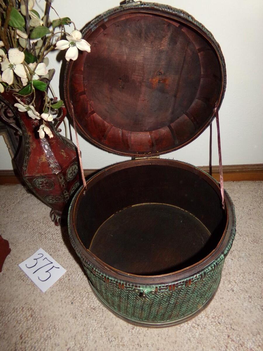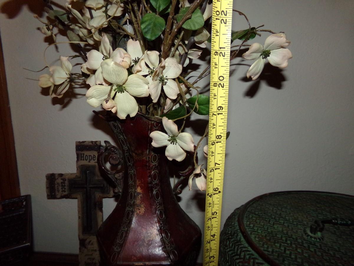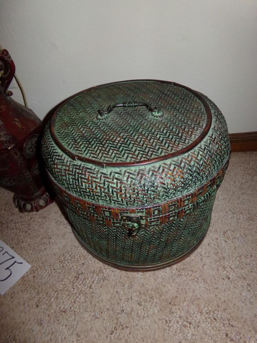 FAUX PLANT ARRANGEMENT WITH A METAL VASE, CHINESE SMALL BROWN WOVEN BOX, NICE WALL HANGING CROSS AND A LARGE WOVEN COVERED BASKET.