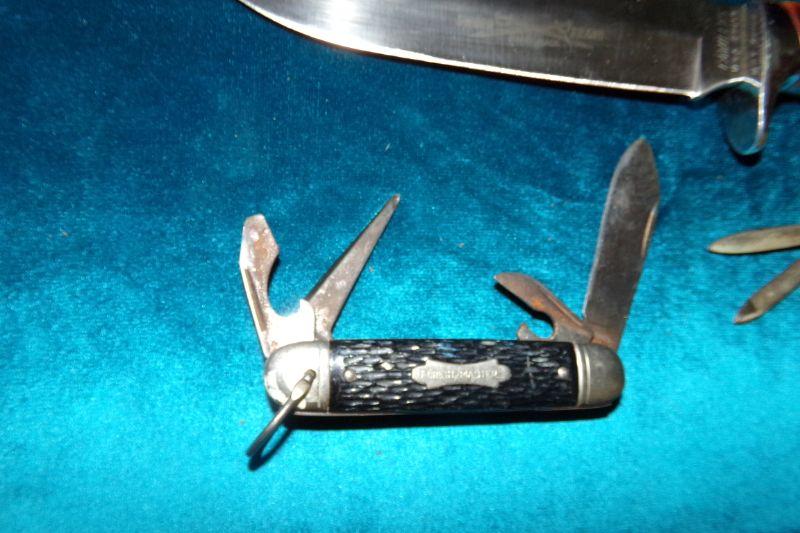 FOLDING KNIFE ON THE LEFT "FOREST MASTER" THE BLADES ARE RUSTY BUT GOOD CONDITION