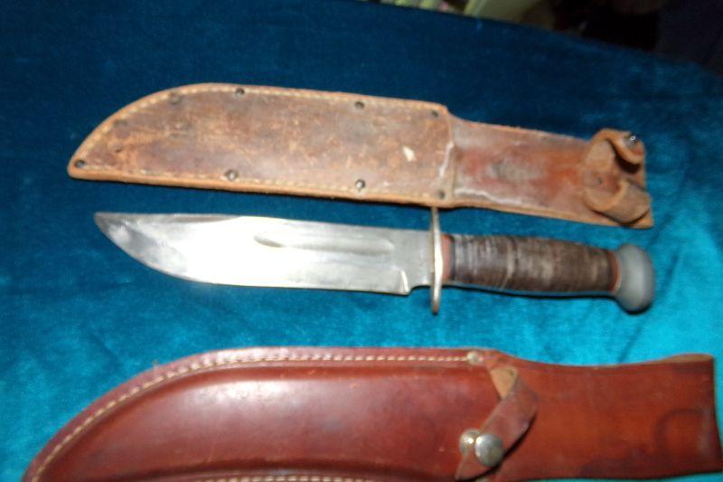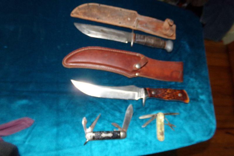 2ND KNIFE FROM TOP IS A "CAMILLUS #1014" ALONG THE BLADE IT READS "SWORD BRAND HAND MADE" VG CONDITION