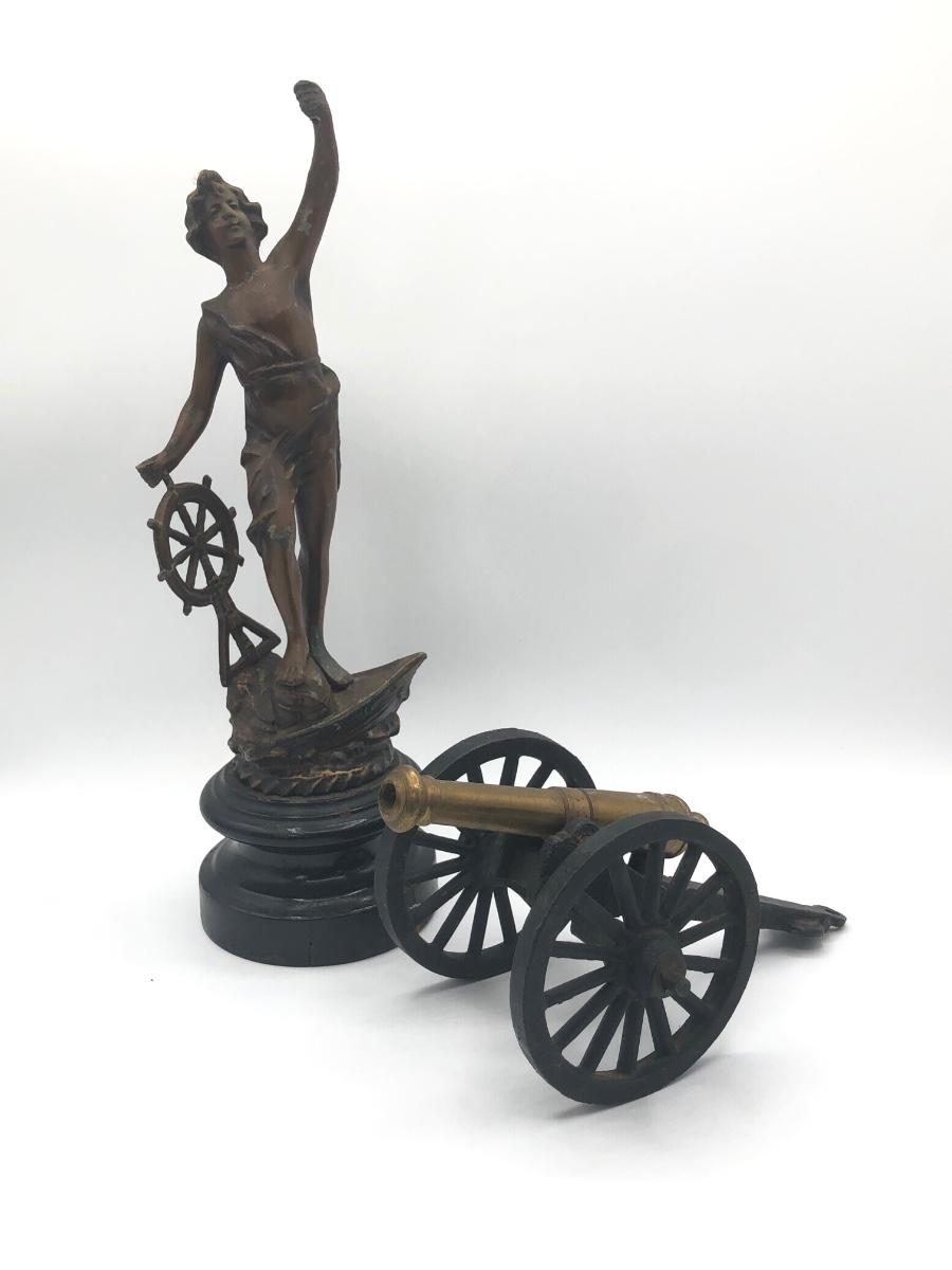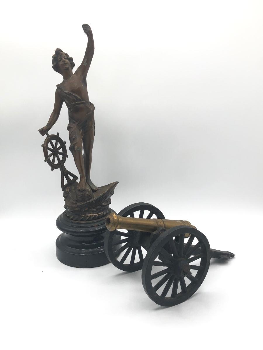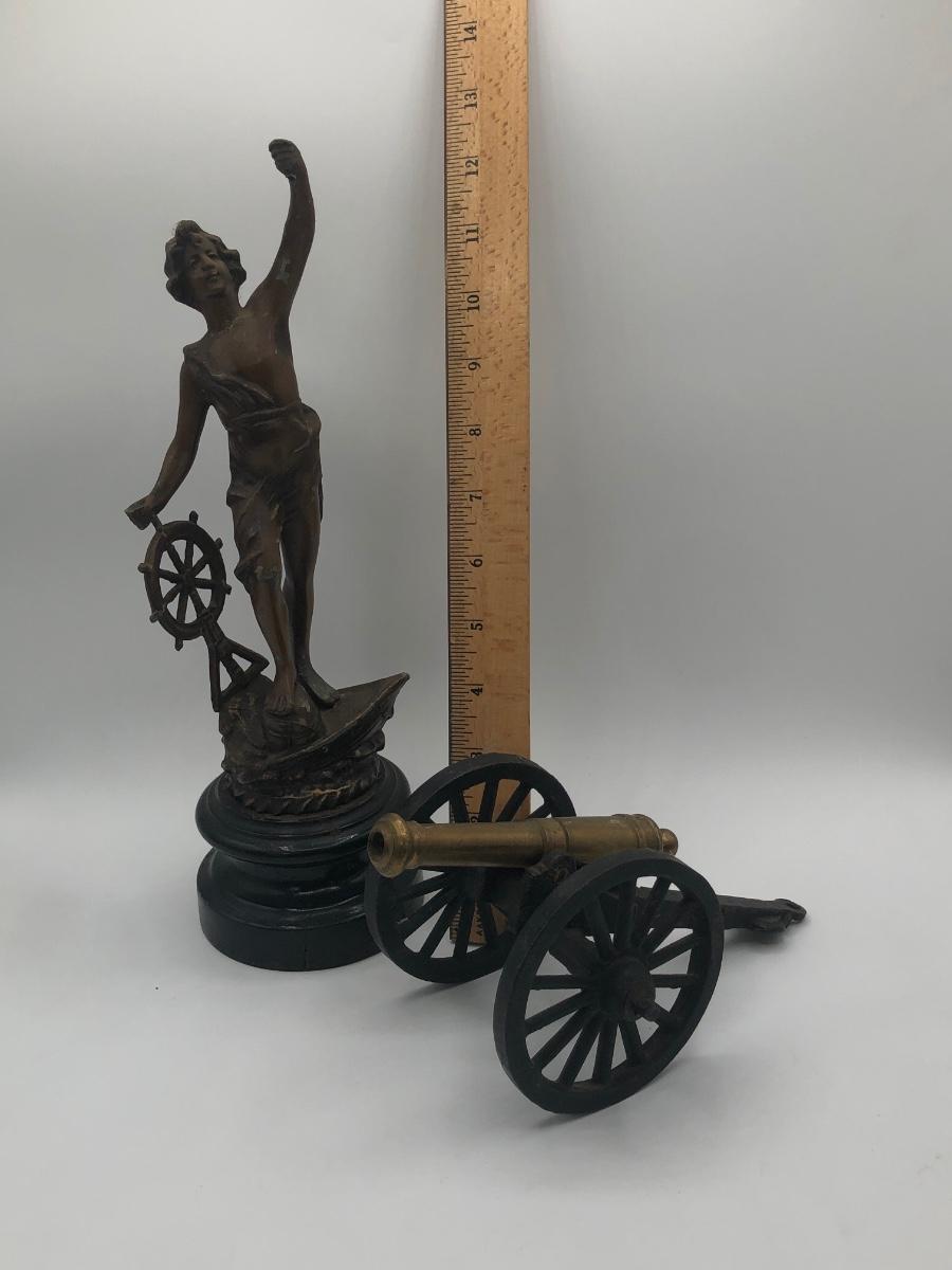 LOT 376L: Vintage French Commerce Cast Metal Sculpture & Die Cast Brass Canon Replica made in USA