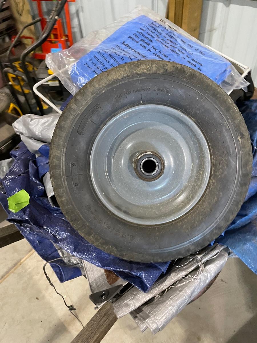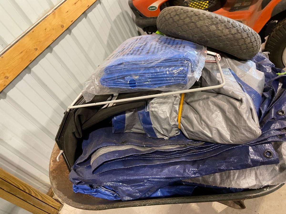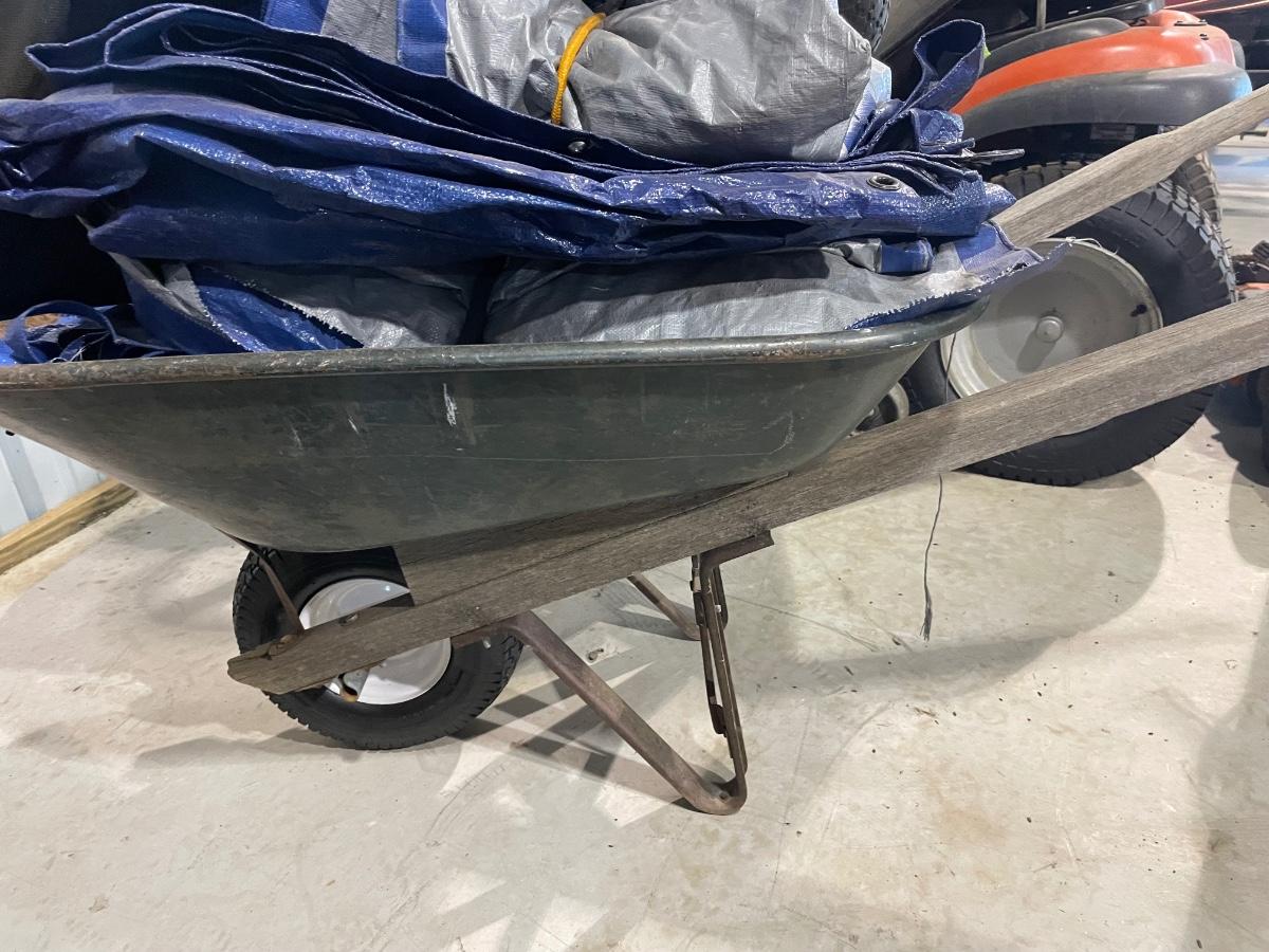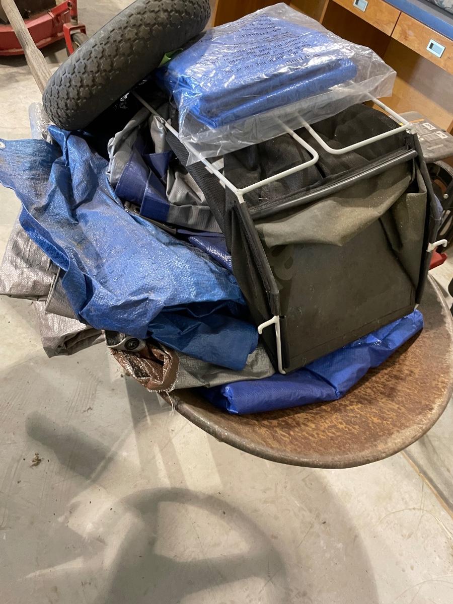 Lot 377 wheelbarrow and tarps (extra wheel for wheel barrow)