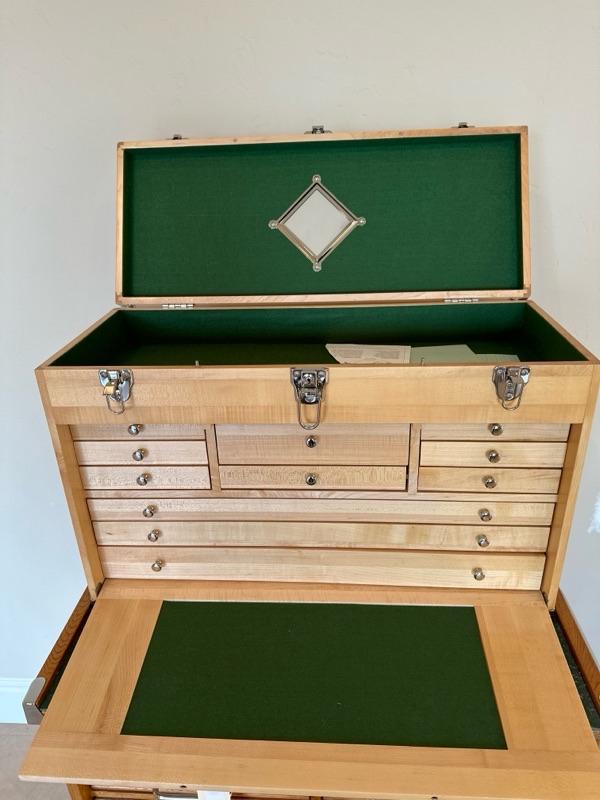Wood roller cabinet in chest chest is a lighter shade of wood, then the cabinet