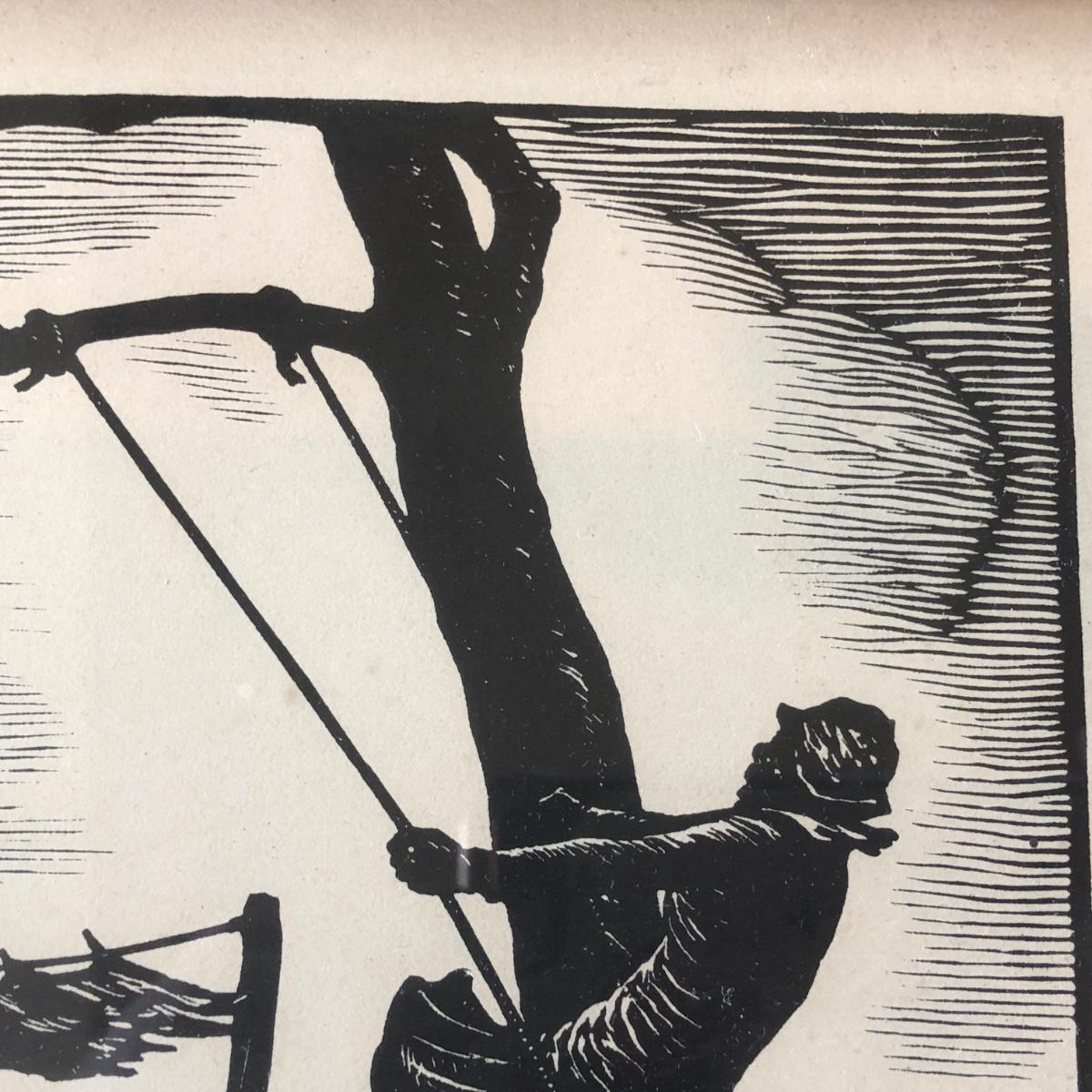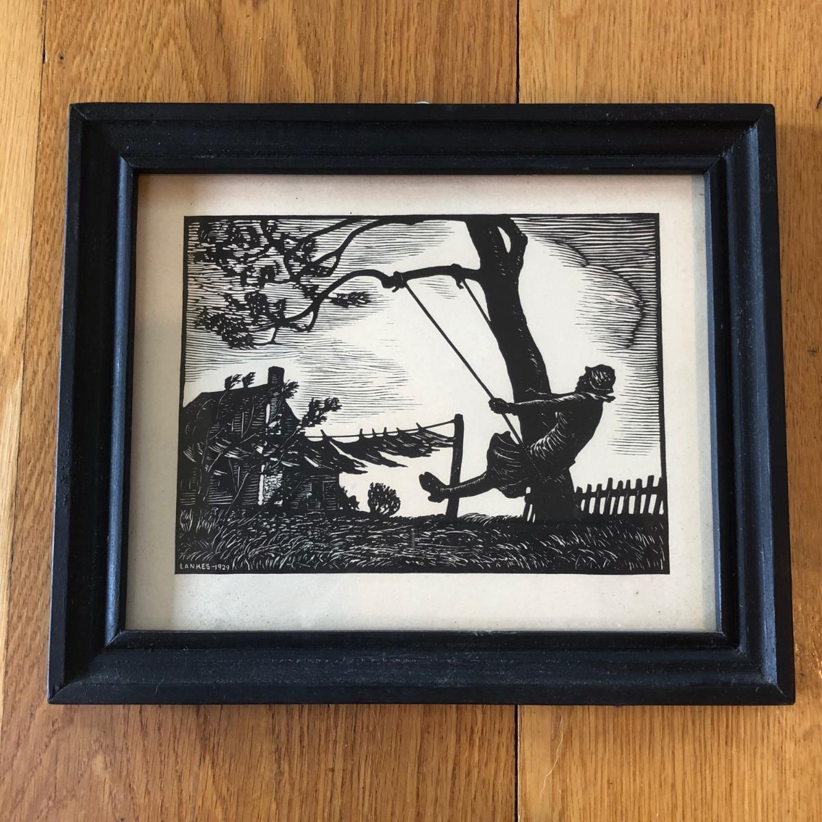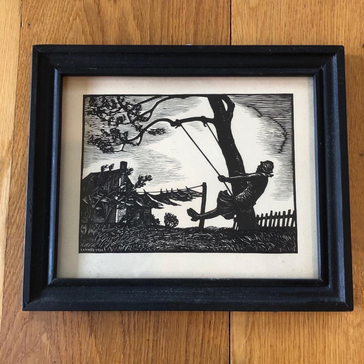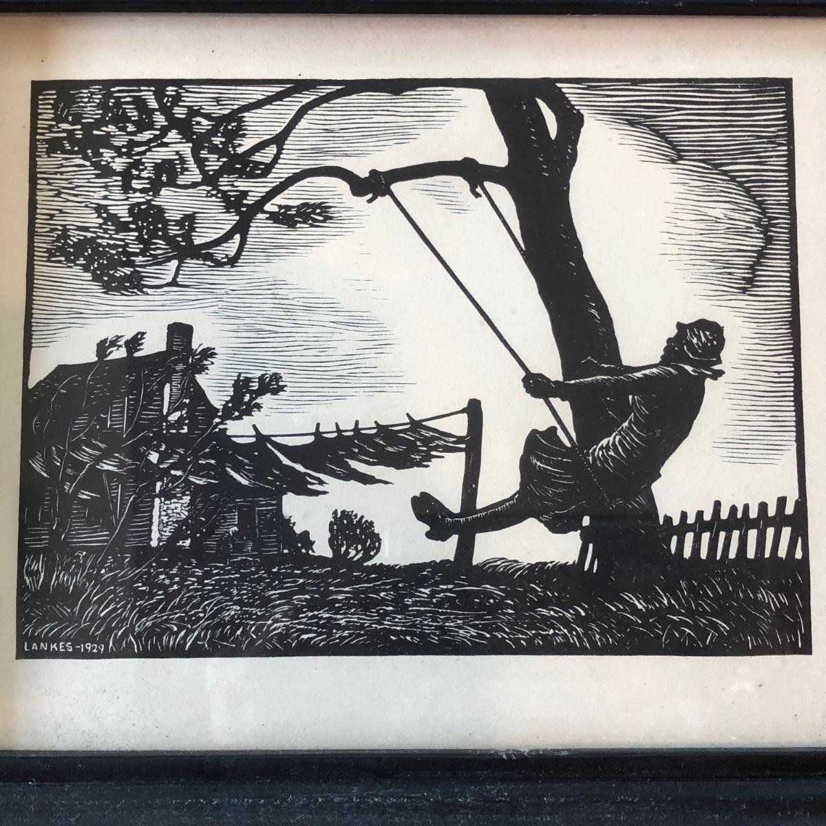 LOT 377L: Vintage 1929 Julius J Lankes (American, 1884-1960) Black Linework Woodcut Swinging Artwork