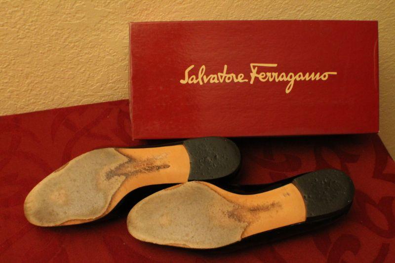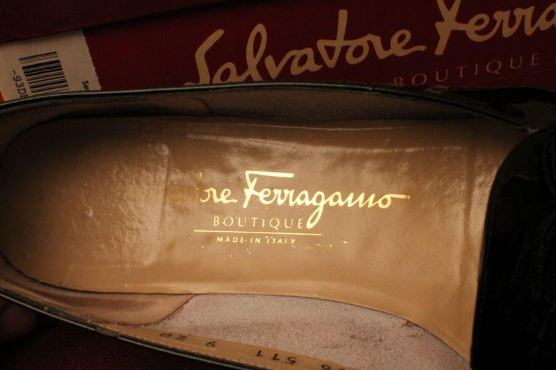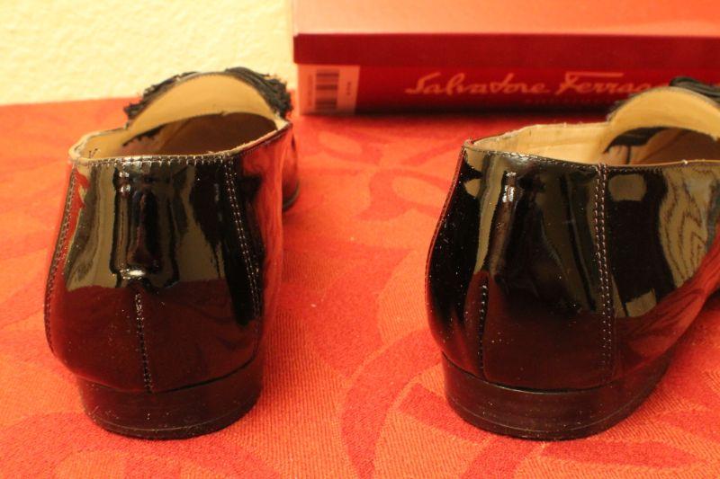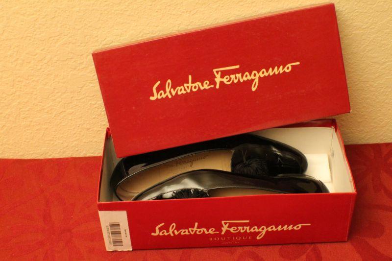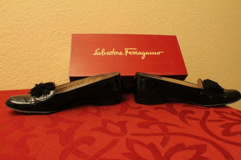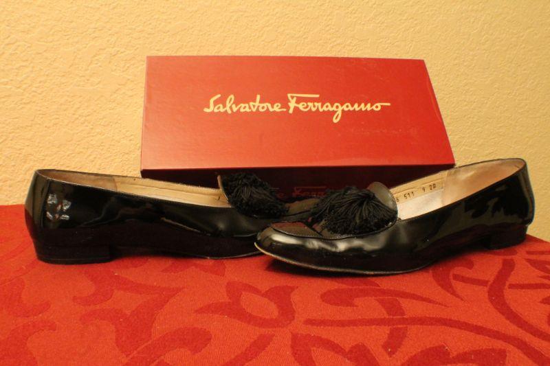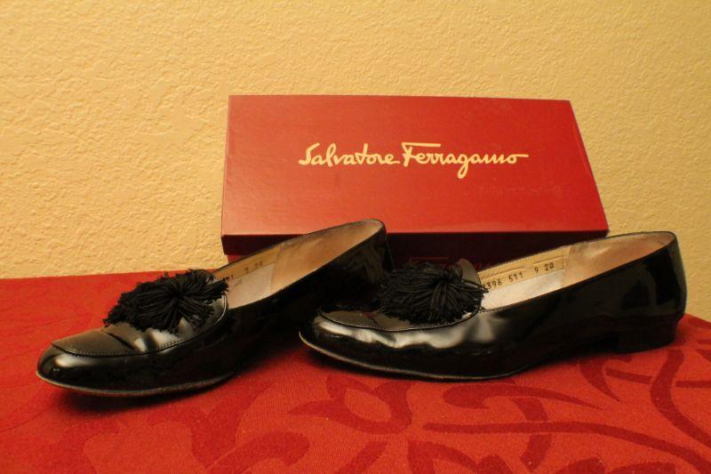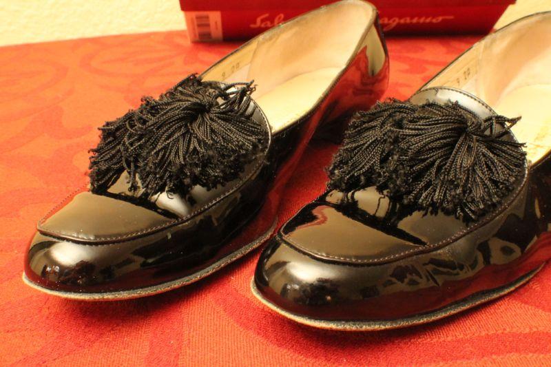 LOT #378: Salvatore Ferragamoâ„¢ Patent Leather Black Thin Tassel Flats SIZE 9 AA