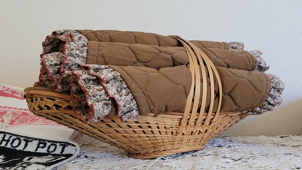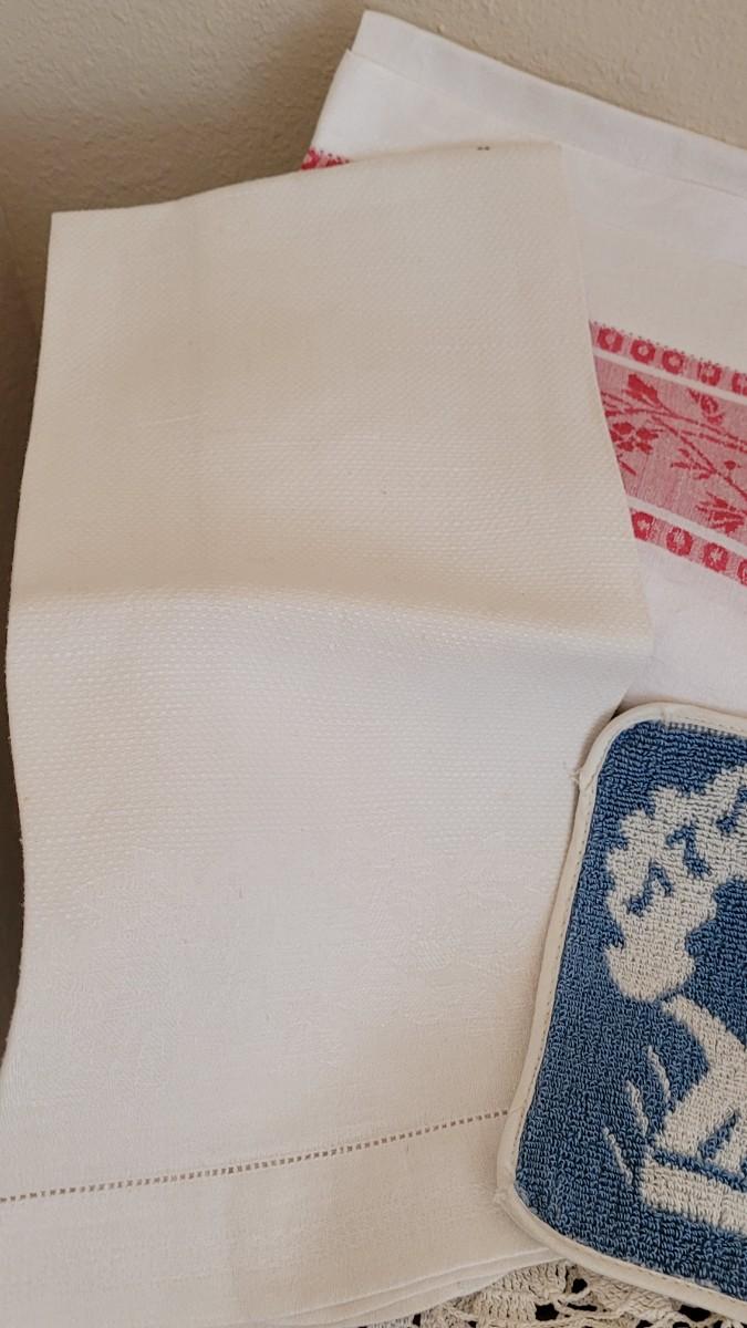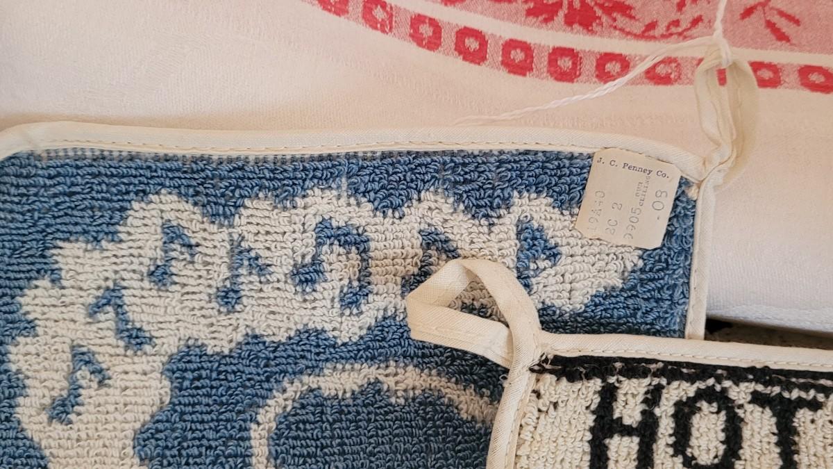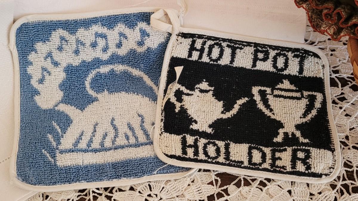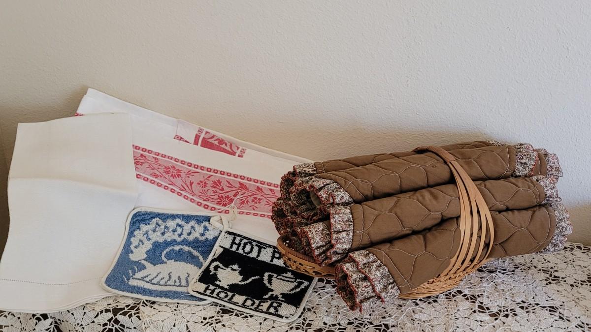 Lot 378: Vintage New Hot Pads, Tablecloth (had some color bleeding), Placemats and Basket