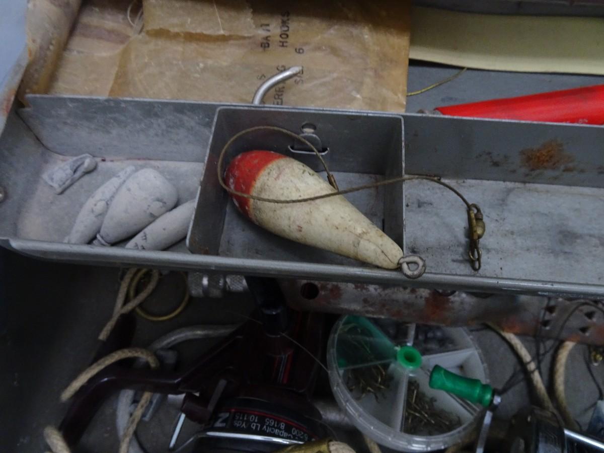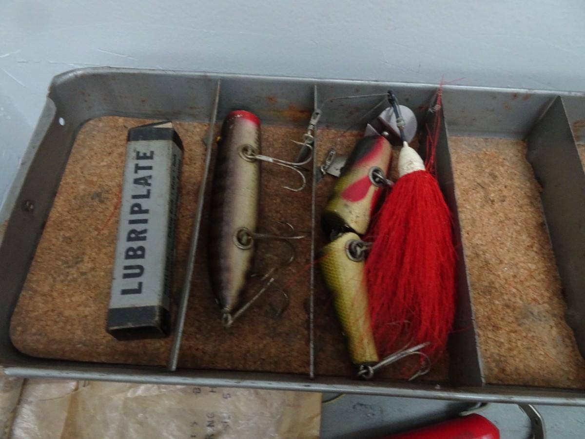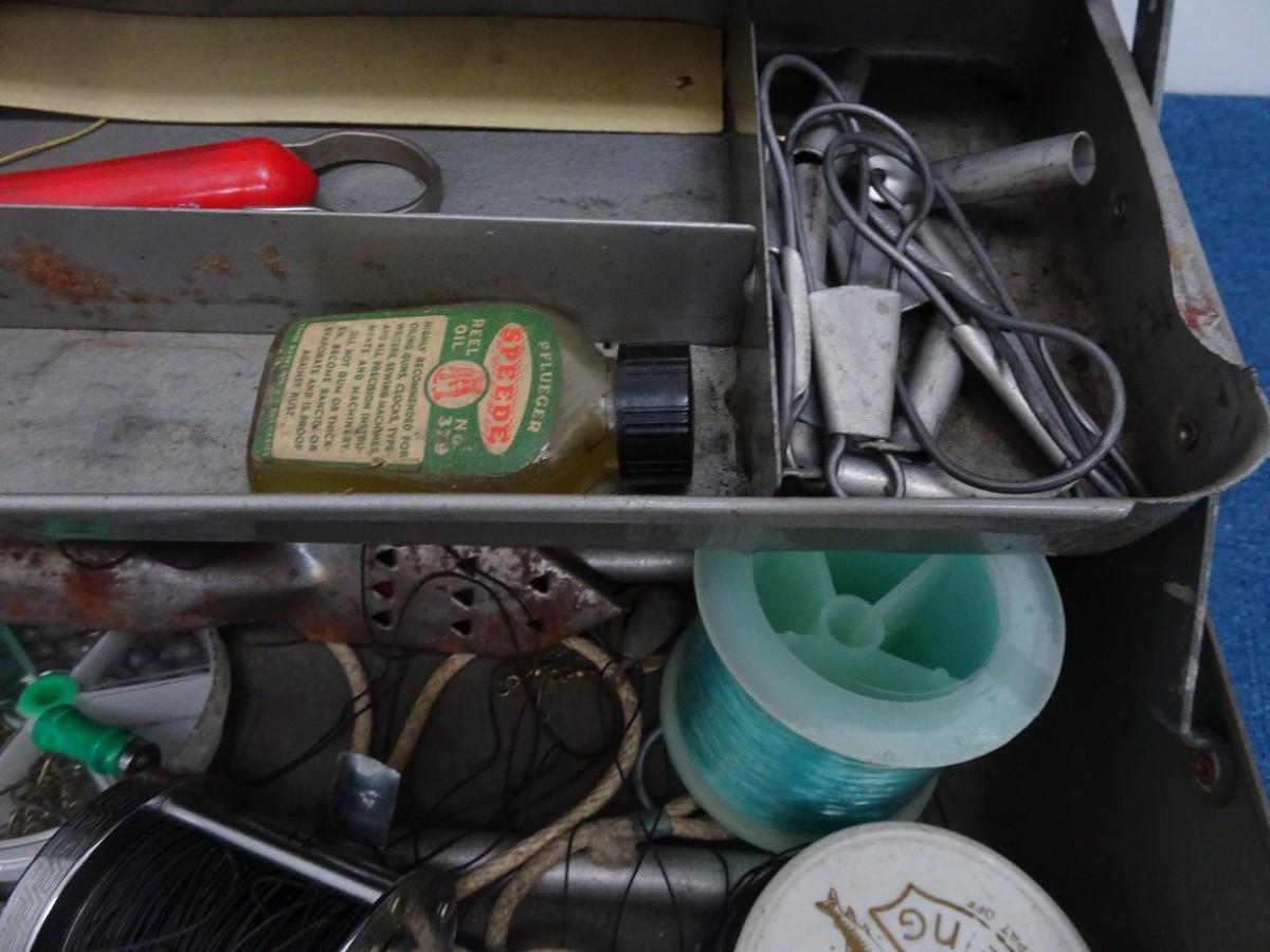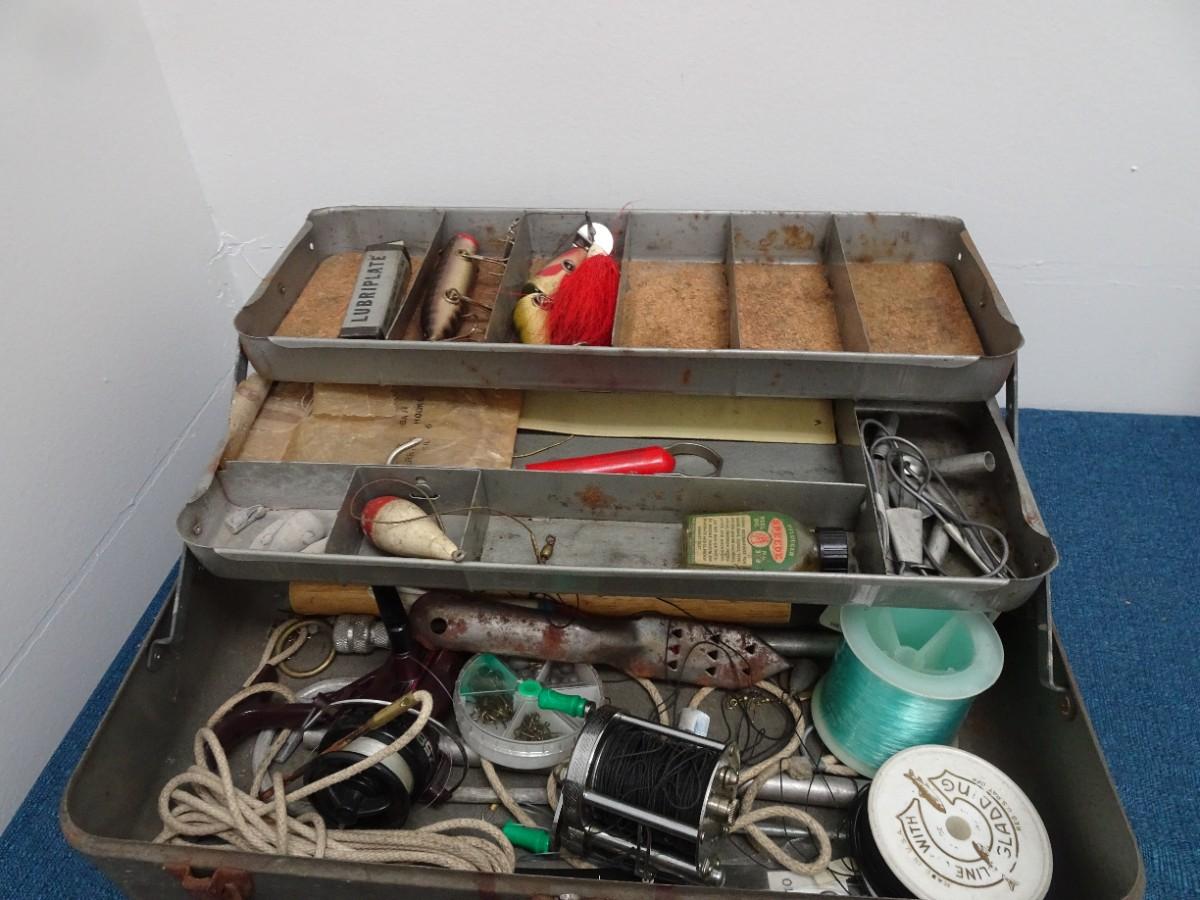 LOT 378. VINTAGE FISHING TACKLE BOX AND CONTENTS