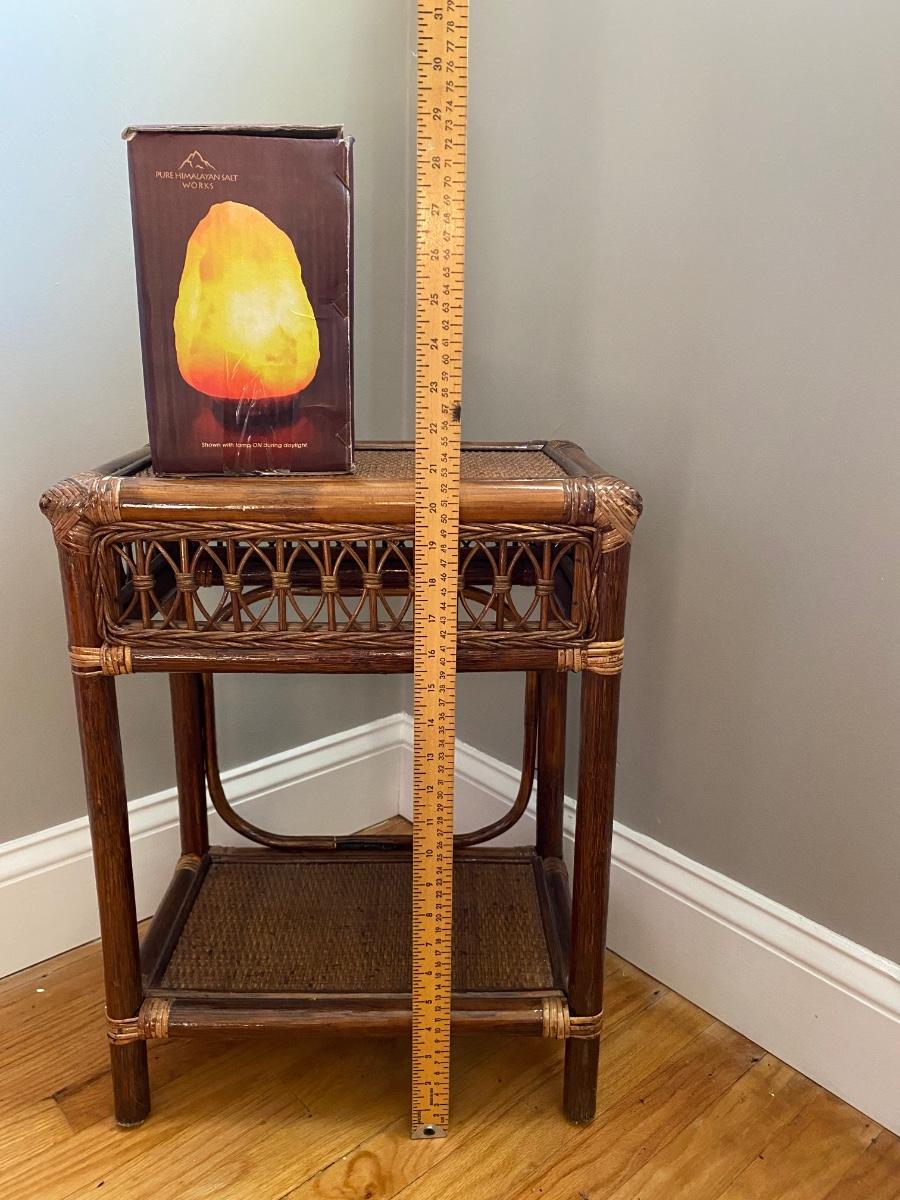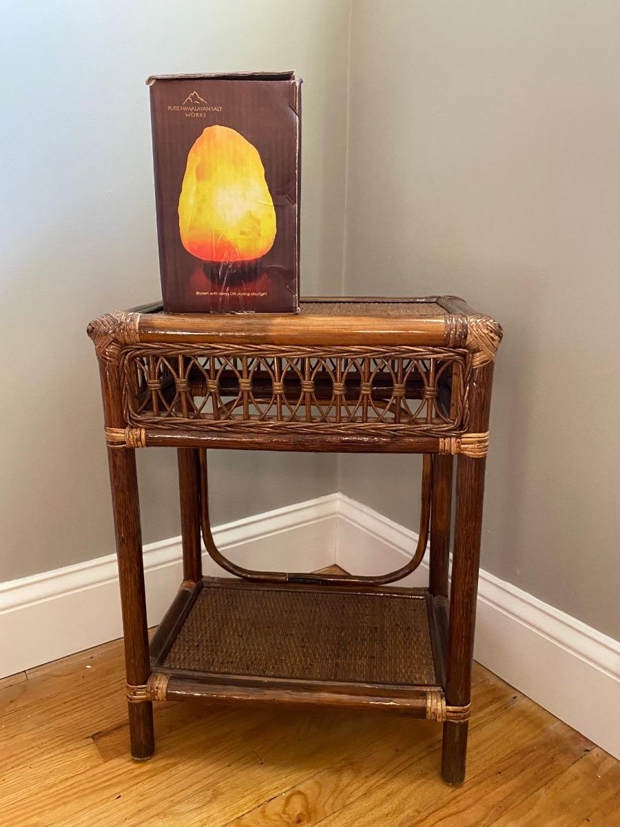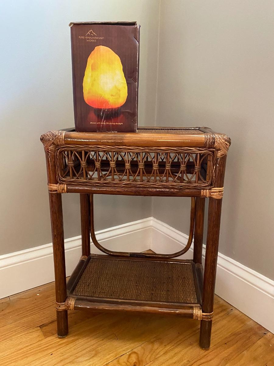 Lot 378: Salt Lamp w/Box and Rattan Accent Table