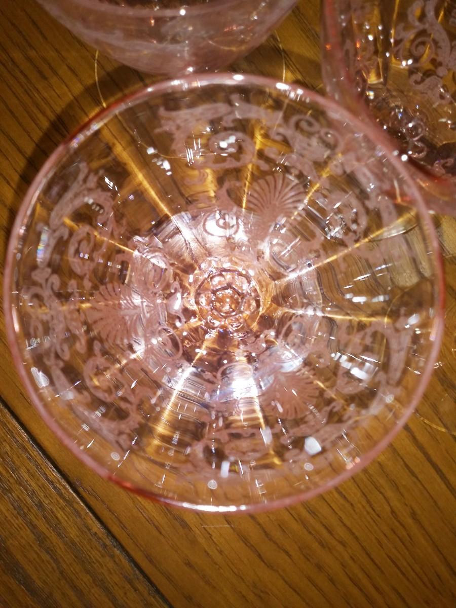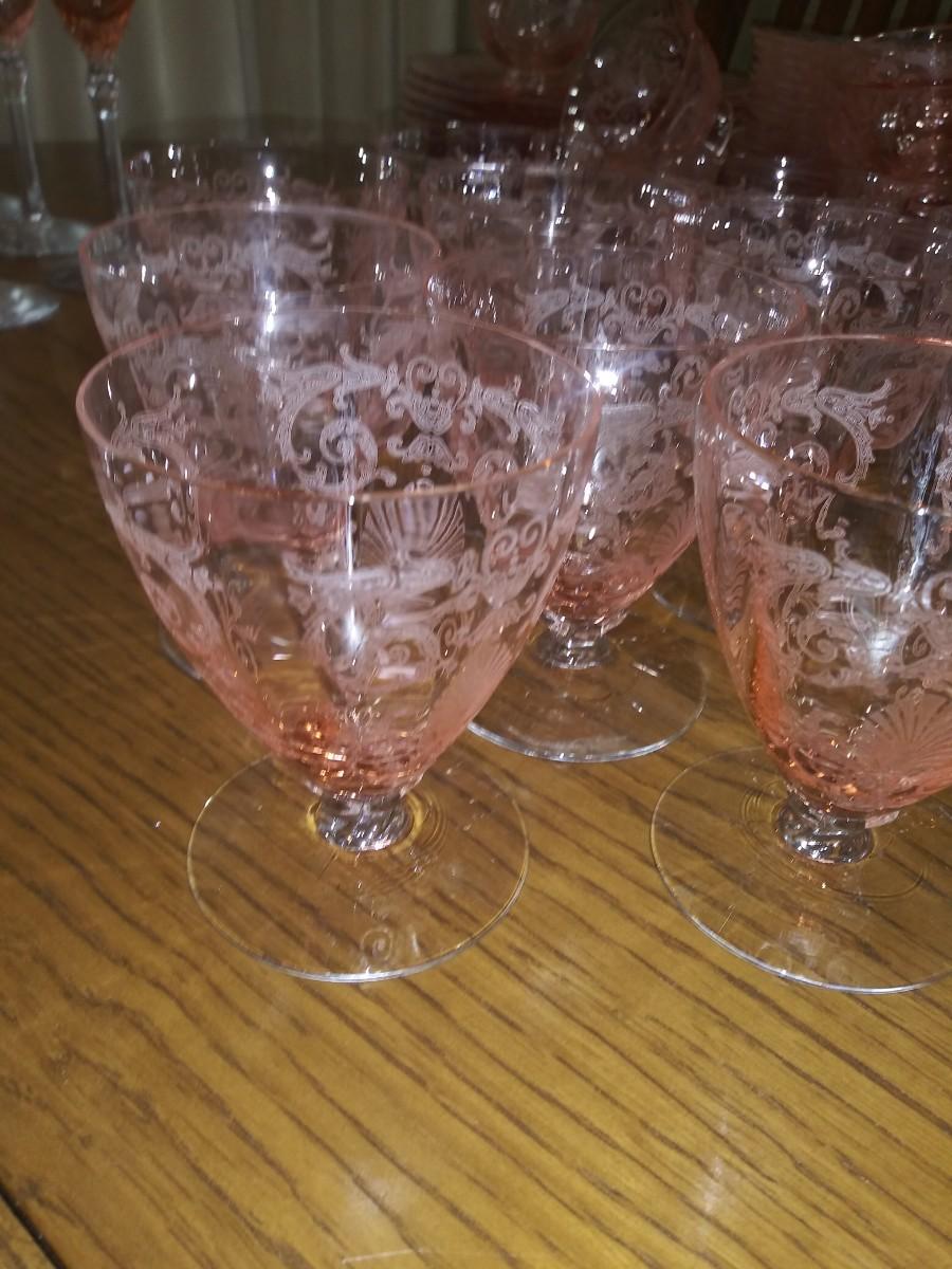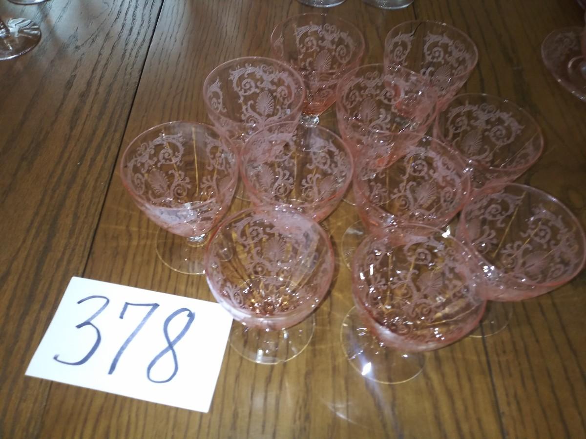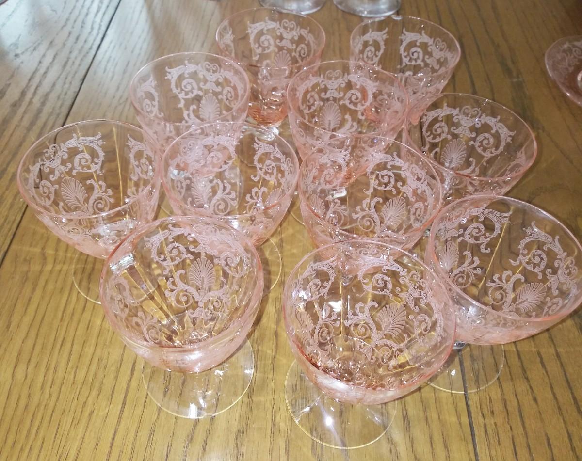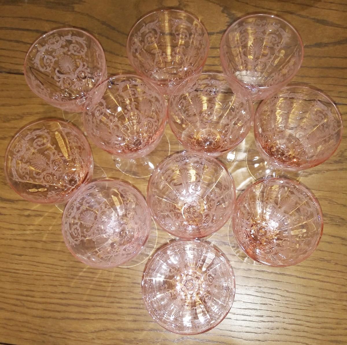 11 ETCHED PINK DEPRESSION STEMMED GLASSES