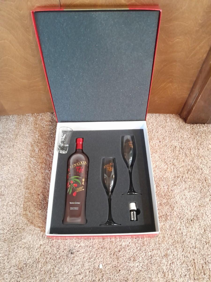 LOT 378 YOUNG LIVING ESSENTIAL OILS NINGXIA DRINK WITH GLASSES