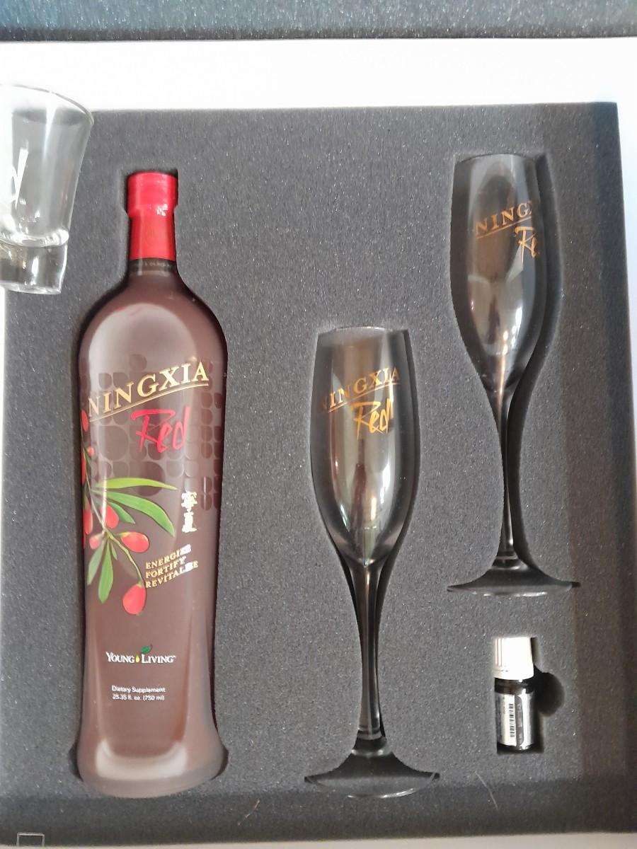 YOUNG LIVING ESSENTIAL OILS NINGXIA RED DRINK WITH GLASSES