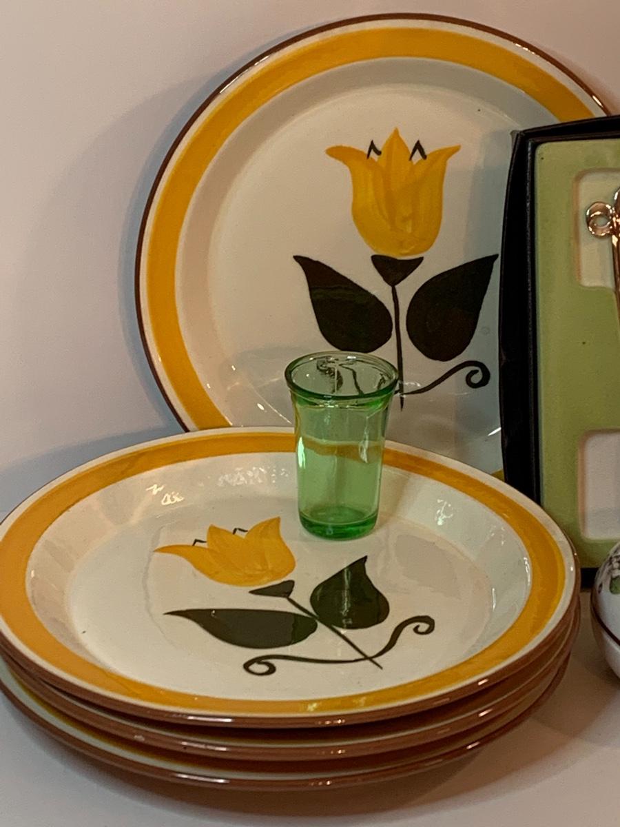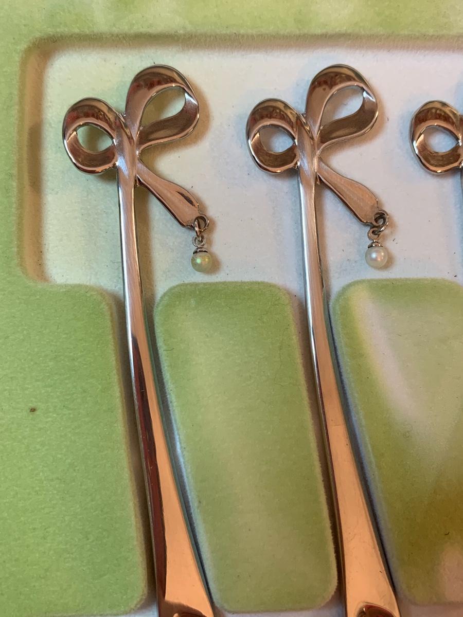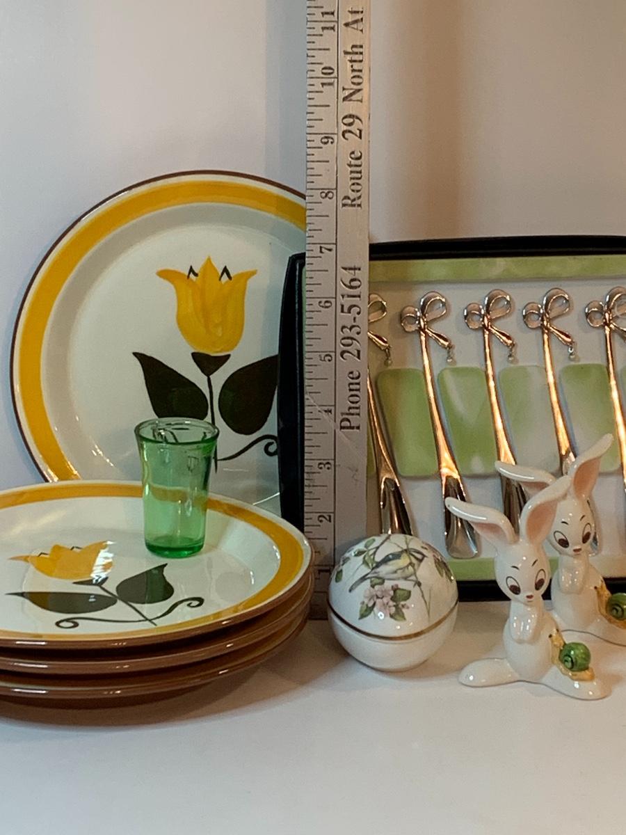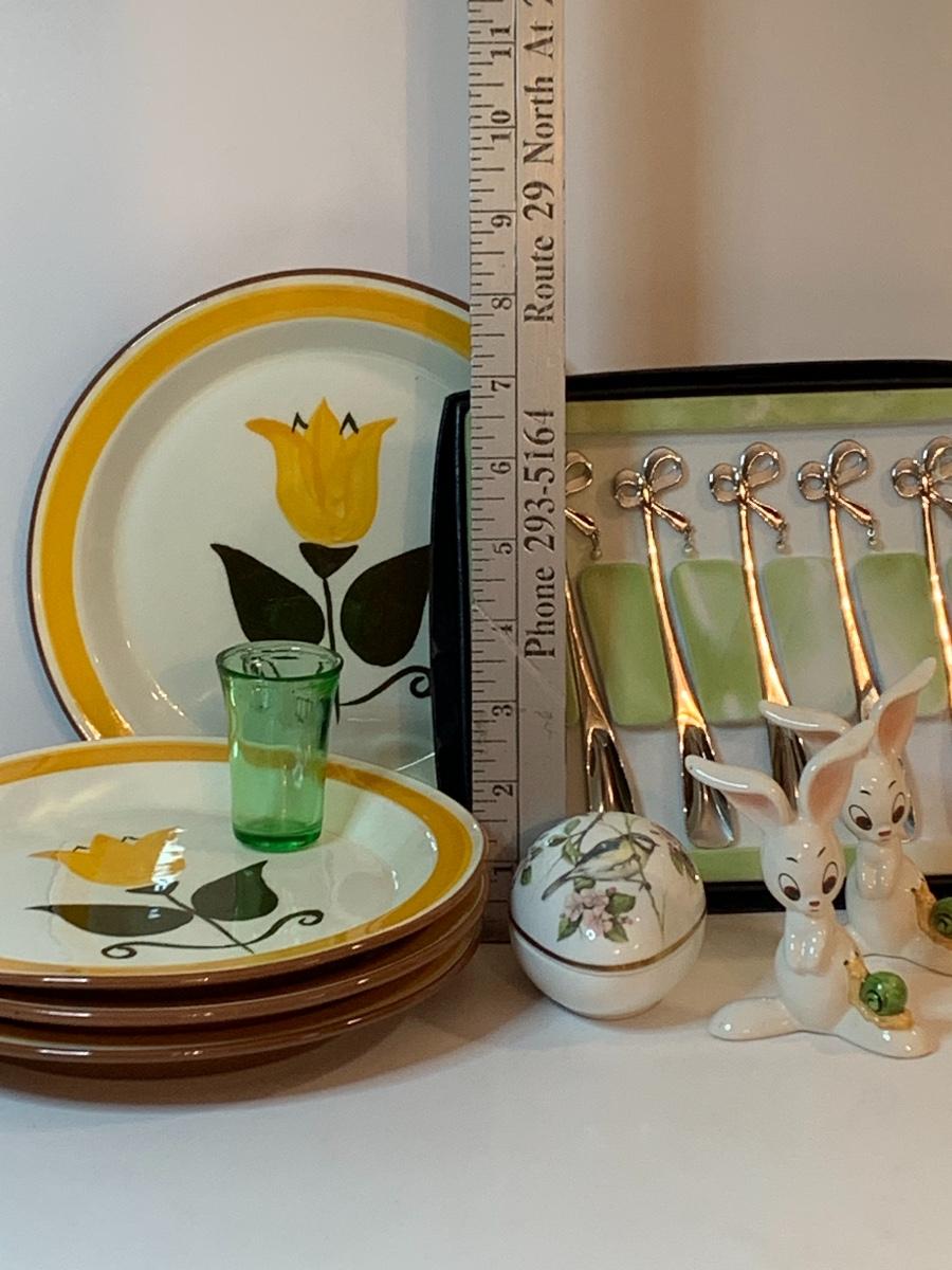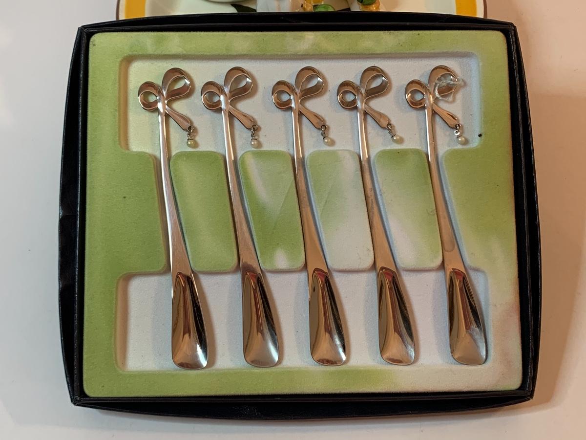 Beautiful Mikimoto dessert spoons (set of 5), Silver Ribbon with Pearl motif, authentic with box (shows wear) along with a set of 4 Stangle stoneware plates, pair of Goebel rabbits w/snail s on feet, and Made in England trinket box. Please see all pictures as they are the best representation of the items. The pictures show condition, measurements if taken, and what is included in the lot. Due to the large amount that we photograph and the time frame, we are not always able to take measurements. All items unless noted, are pre-owned and have been used. If you purchased furniture, you must bring help. We do not allow one person to carry large furniture out on their own. Bring help, tools and a truck for the safety of our client’s homes, and your personal safety. Company policy. Thank you.