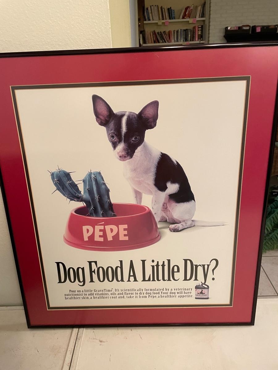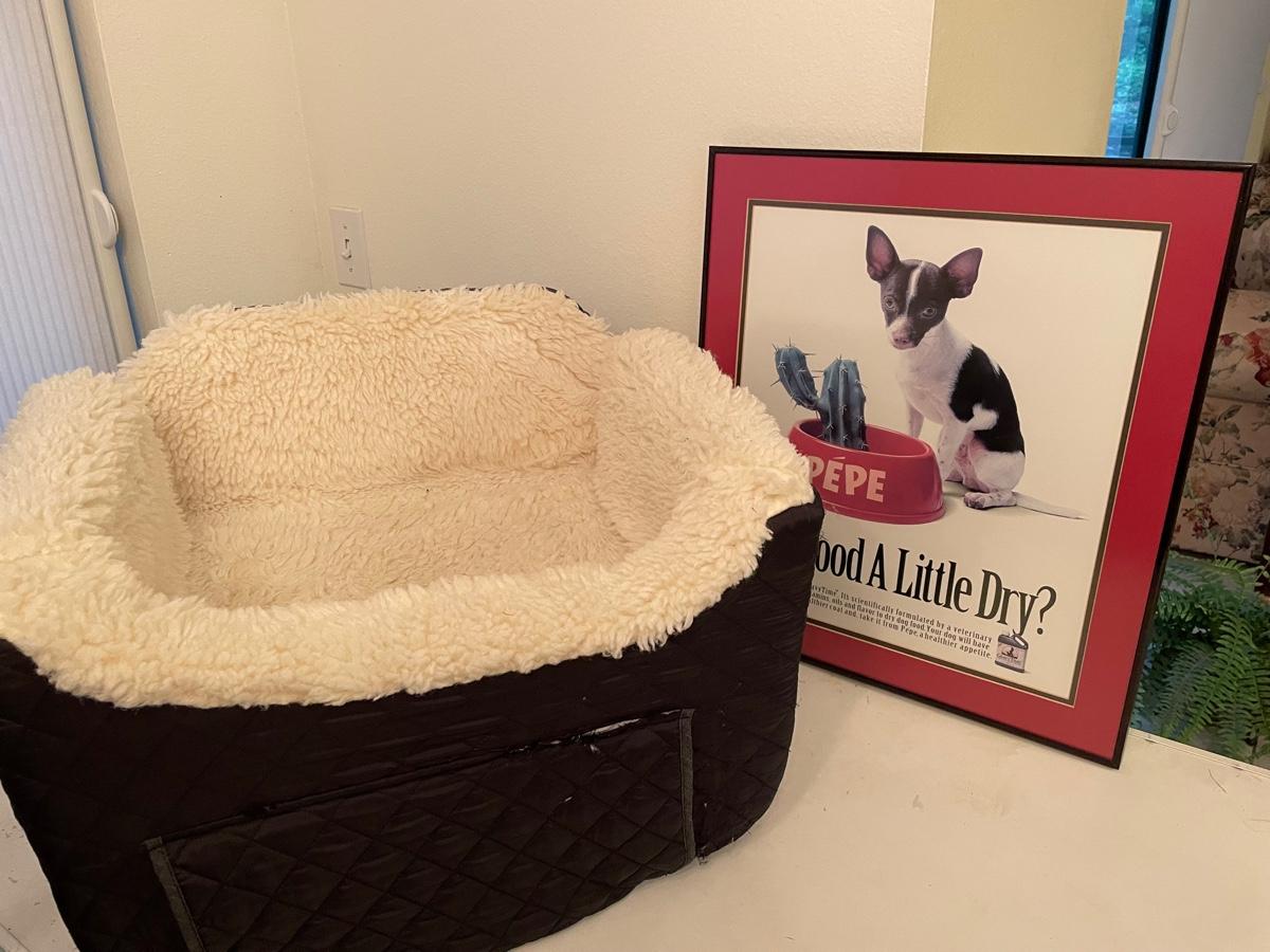 "Snoozer" fleece dog bed with hidden compartment and nicely framed pet food poster