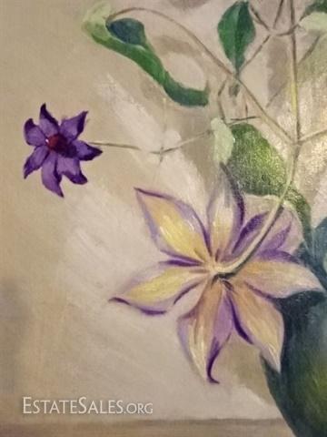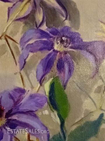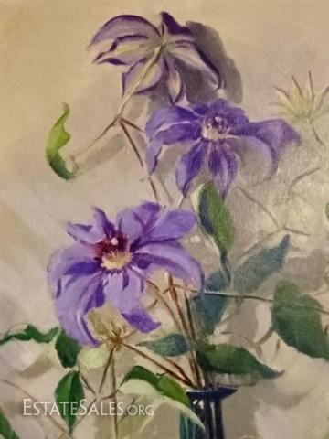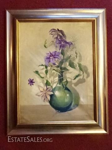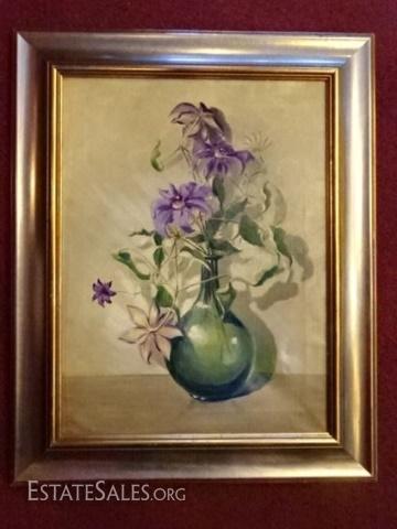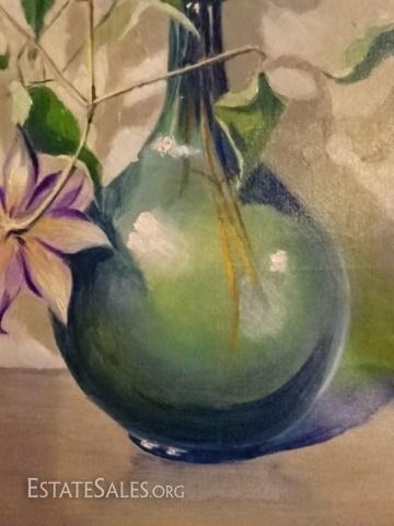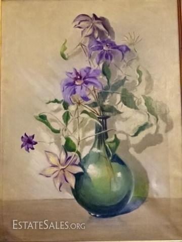 LOT 37A: ETHEL HORE TOWNSEND (1876-1970) OIL ON CANVAS PAINTING, FLORAL STILL LIFE WITH GREEN GLASS VASE, SIGNED LOWER LEFT, CONDITION GOOD WITH LIGHT CRAZING, FRAMED SIZE 31" X 25", CANVAS SIZE 24" X 18.5", SKU265.09