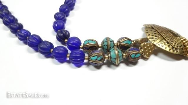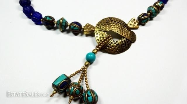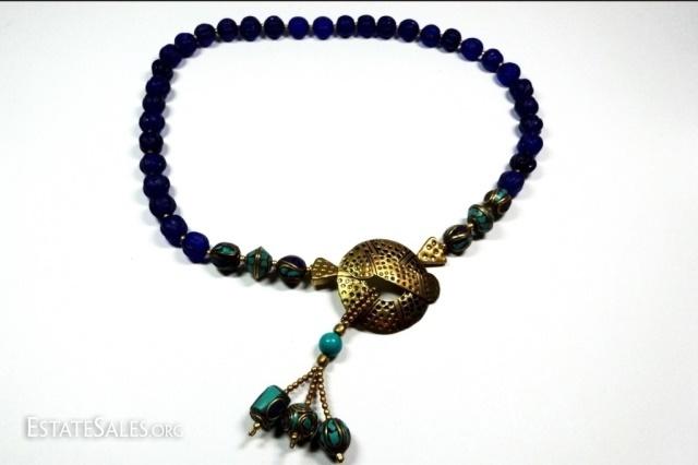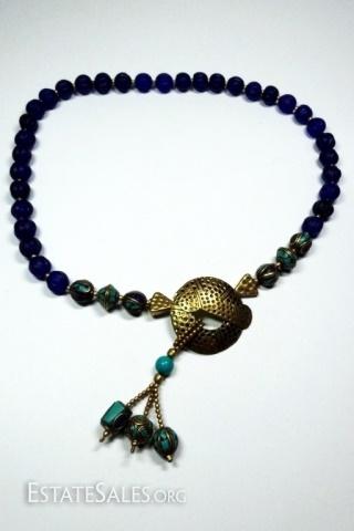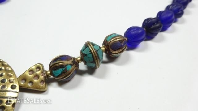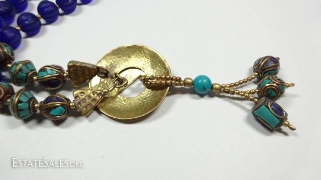 LOT 37C: TIBETAN TURQUOISE, LAPIS & BLUE GLASS BEAD NECKLACE, BRASS ACCENTS, APPROX 18"L, SKU321.102