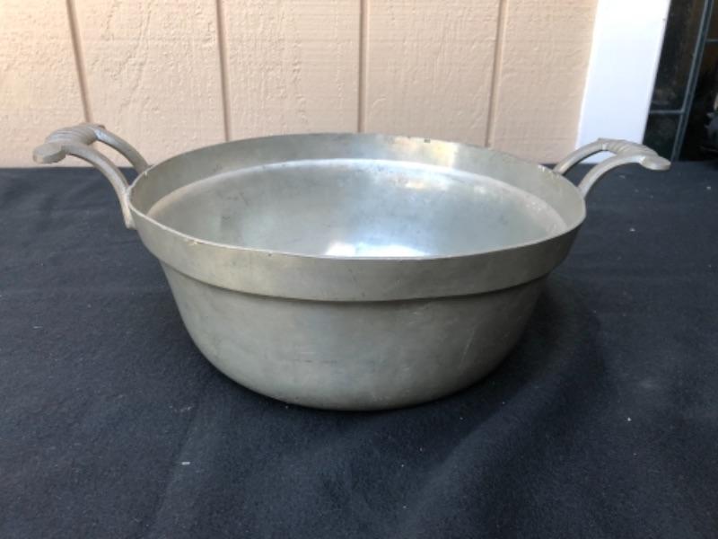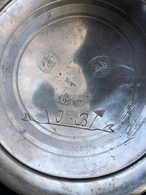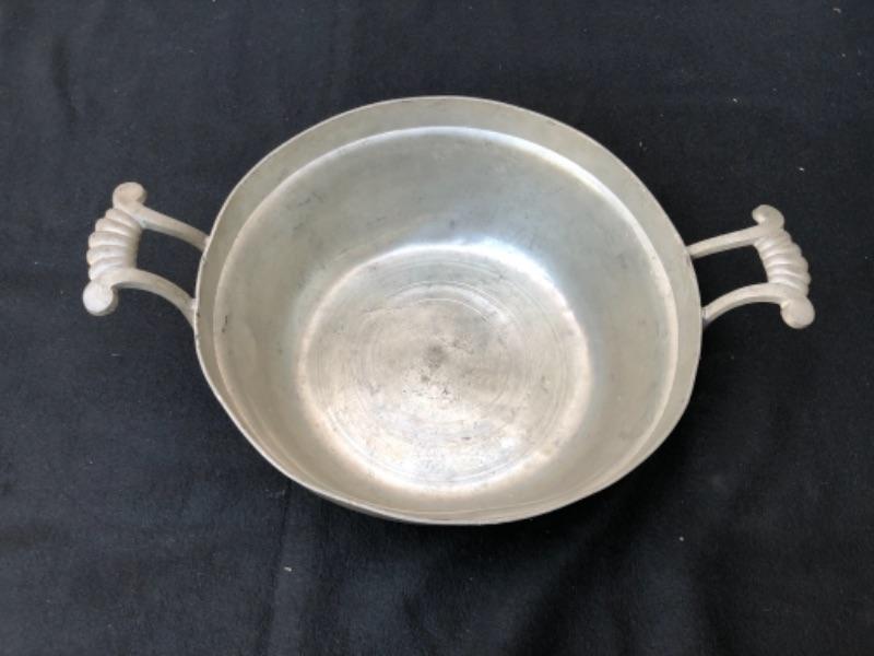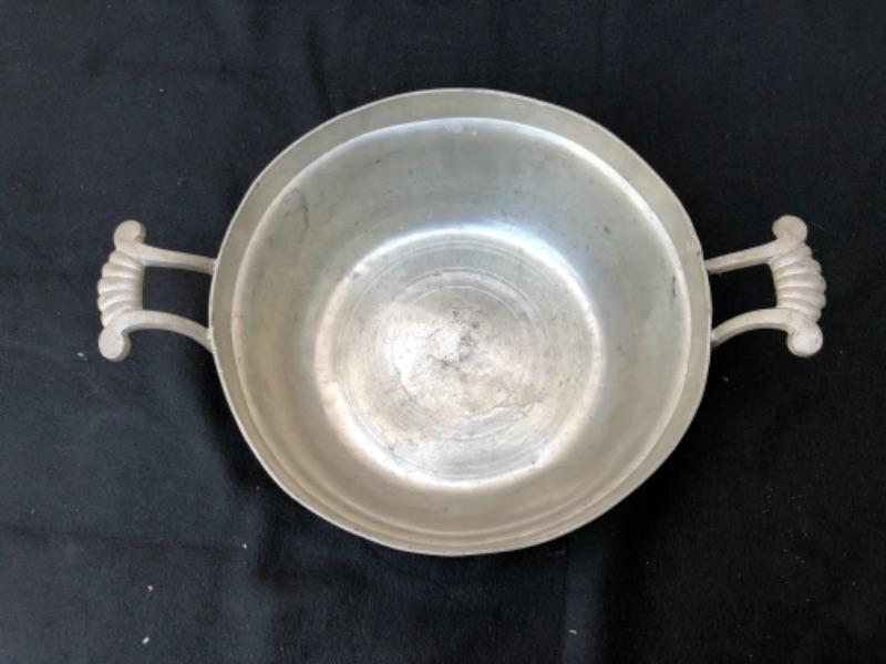 . Lot 37P. Pewter porridge bowl with no lid, large, two handles, stamped London, P. H. Strauss Engl. Blockzinn, monogrammed Von Chr. Kraft, J + B “” $17.50
