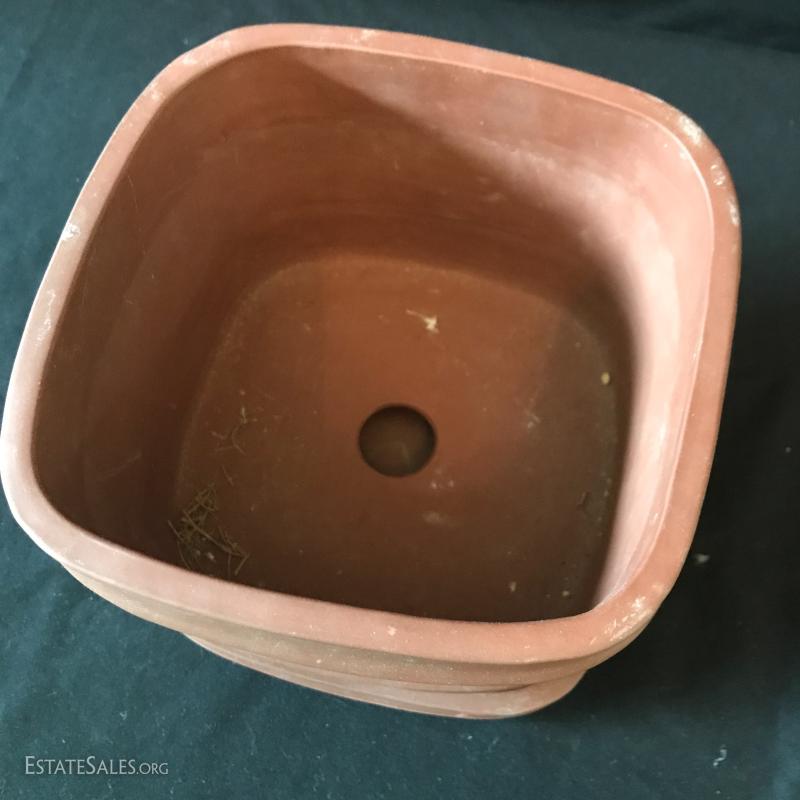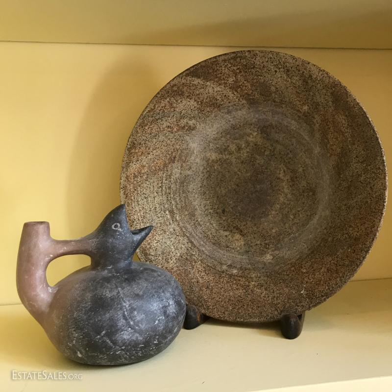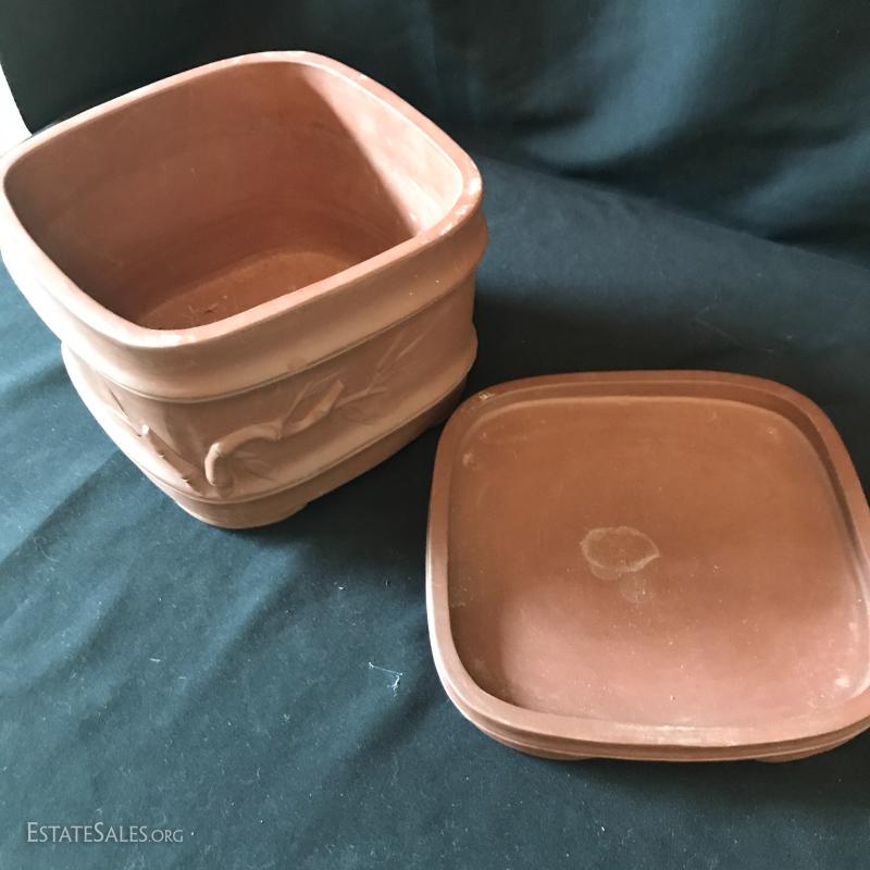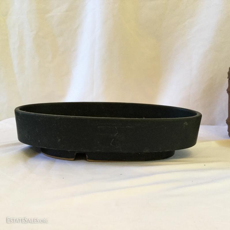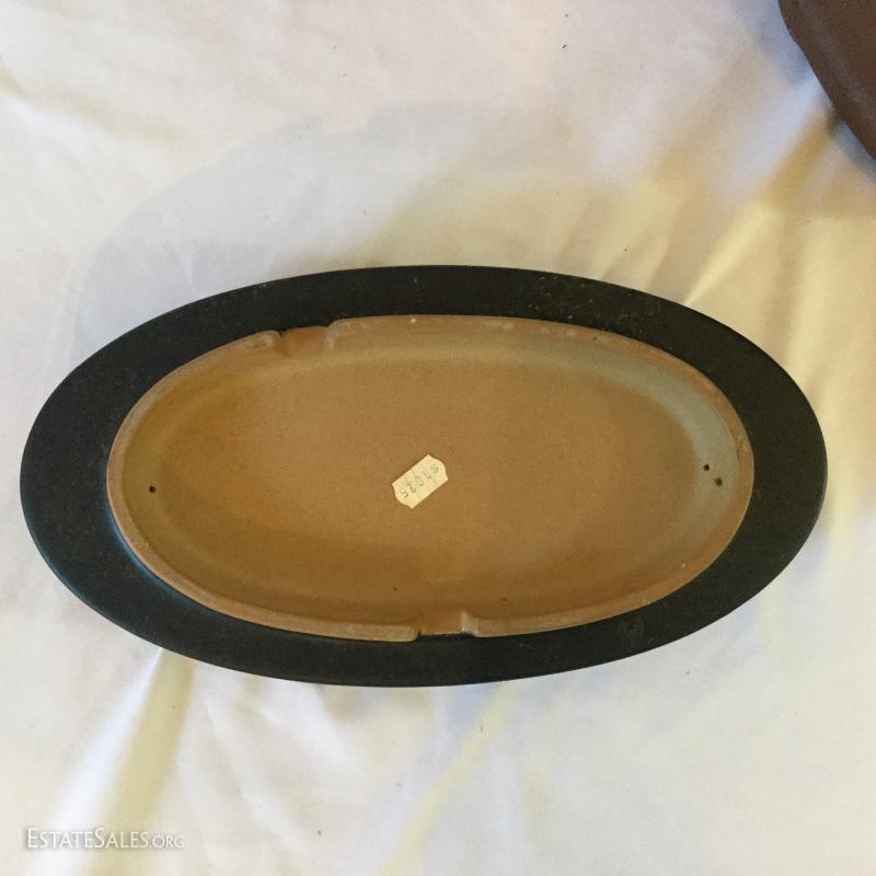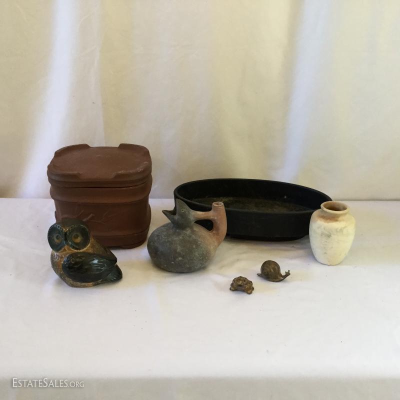 Lot of miscellaneous pottery pieces and collectibles. Includes owl, frog, and snail figurines, bowl (10" diameter), small earthenware jug, black oval bowl (12"L X 6.5"L) and square terra cotta pot with tray.