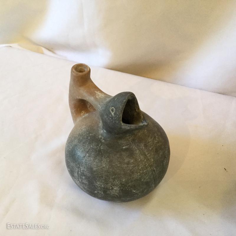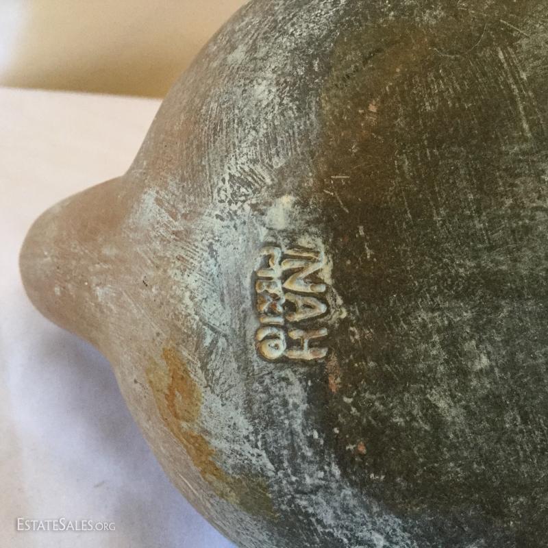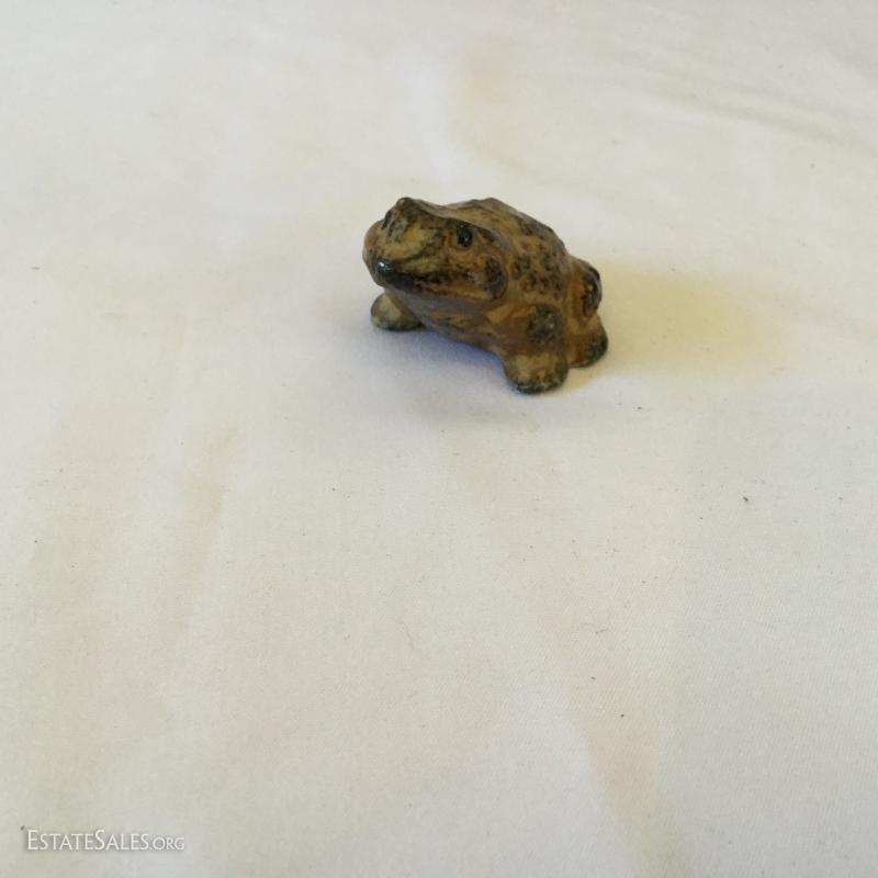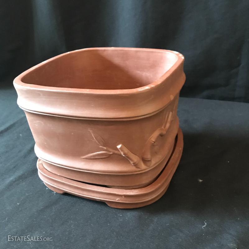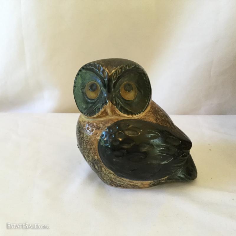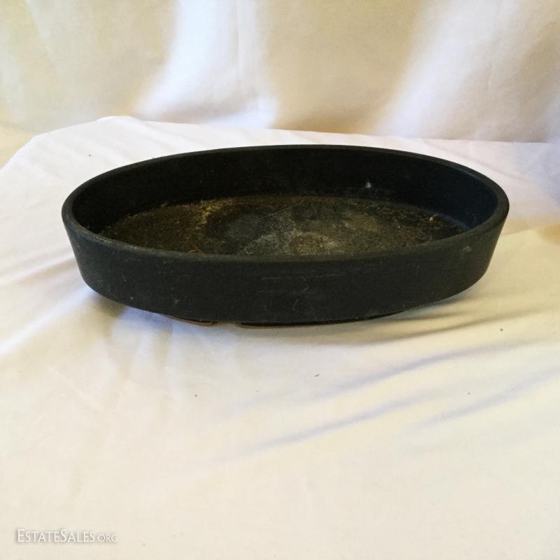 Lot of miscellaneous pottery pieces and collectibles. Includes owl, frog, and snail figurines, bowl (10" diameter), small earthenware jug, black oval bowl (12"L X 6.5"L) and square terra cotta pot with tray.