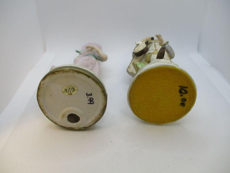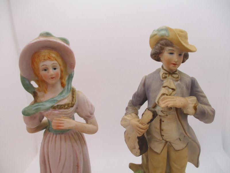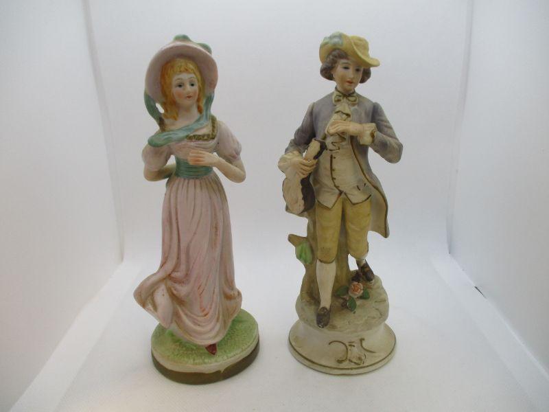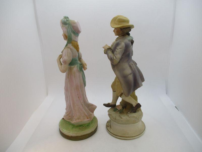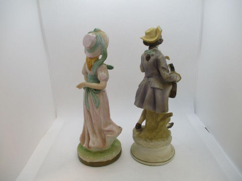 Both have a bisque finish and are in excellent condition. The are both about just shy of 8" tall. The lady is marked, but the man is unknown because of the green felt bottom. They do both need a bath.