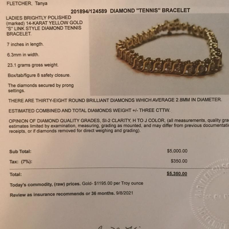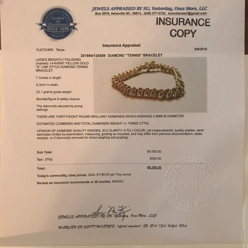 Treat yourself or buy this beauty for someone you love. This 14KT yellow gold “S” link style diamond tennis bracelet has 3+ CTTW and is a show stopper. We had it appraised in September 2018 from a local jeweler that can be transferred into the buyer’s name after auction purchase for insurance purposes. Appraisal value is at $5350. All other specs are listed on appraisal form. See photos for details. This lot also includes an older appraisal from 1992. Shipping available. Starting price based on potential melt value.