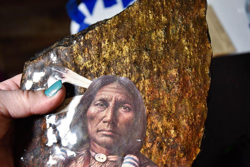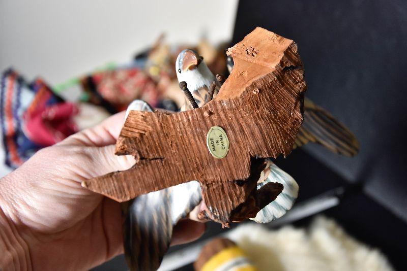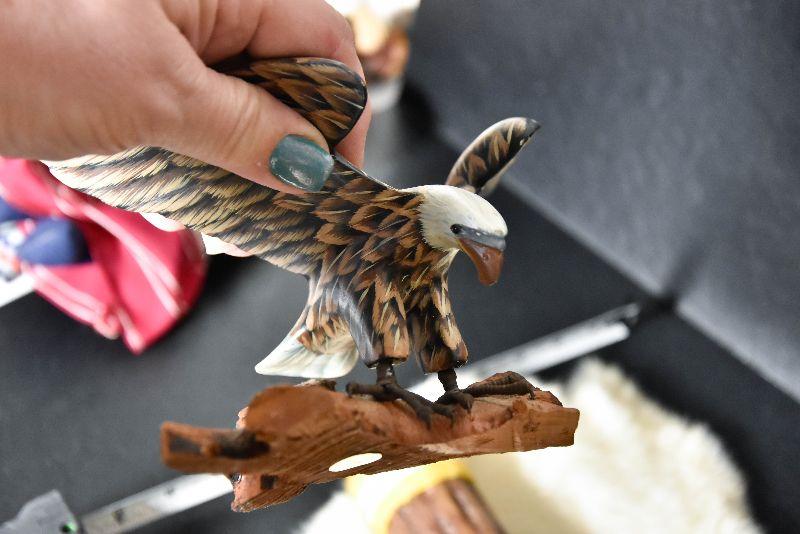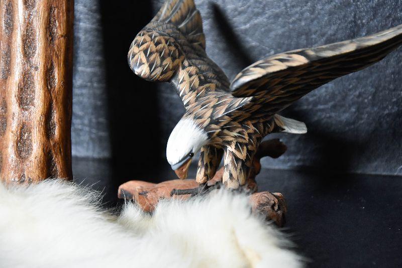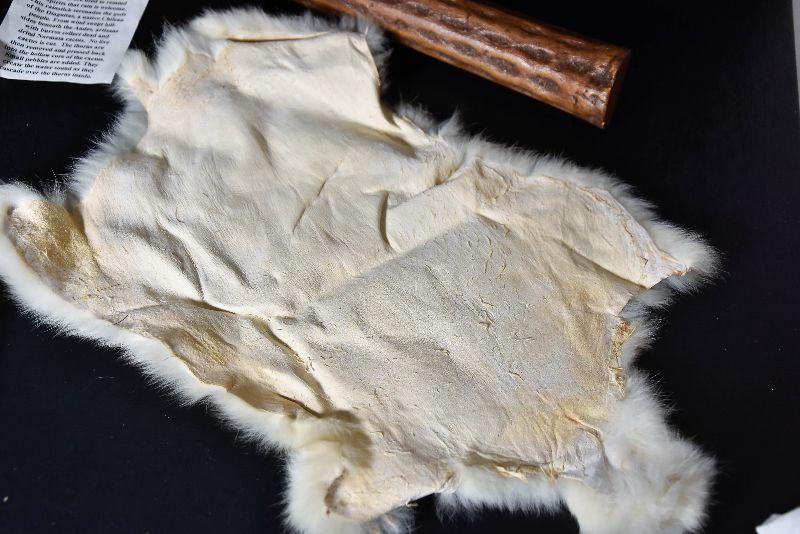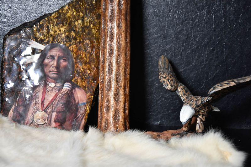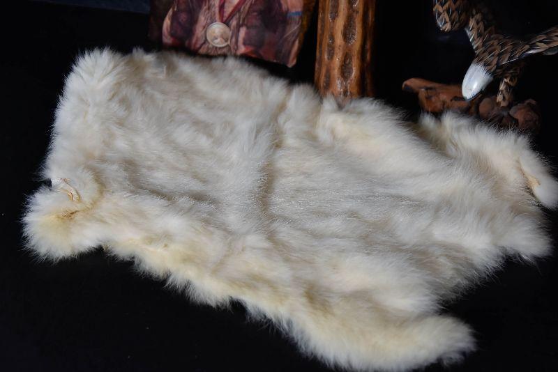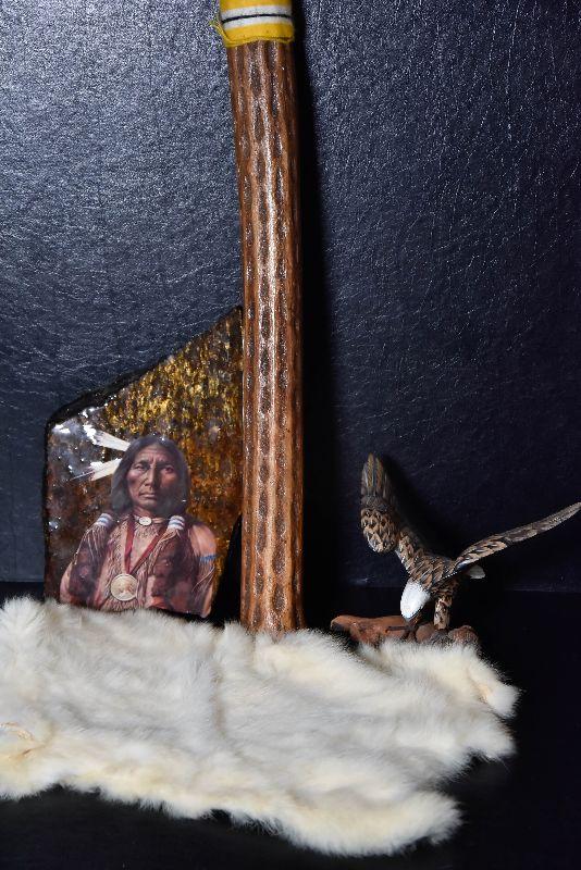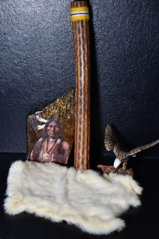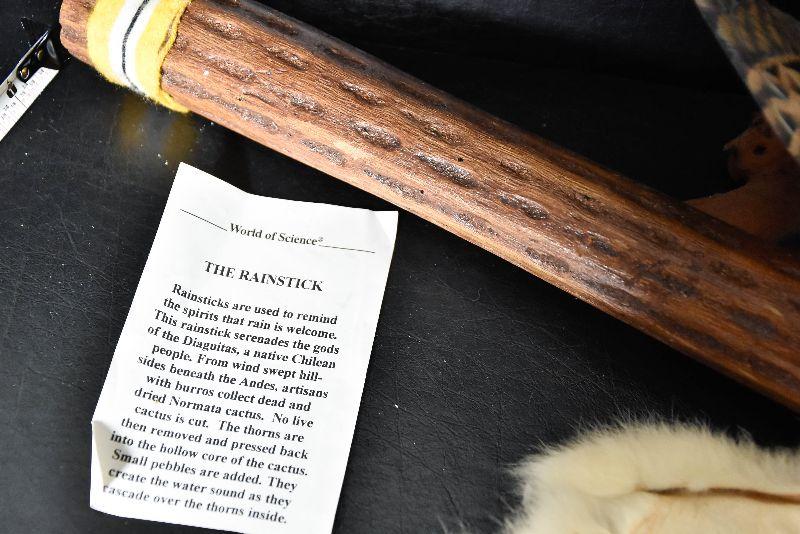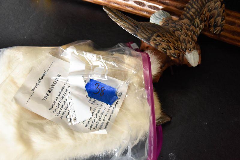 Rainstick, eagle decor, painted rock and a cured fur from small animal.