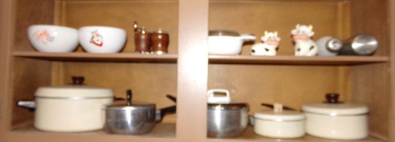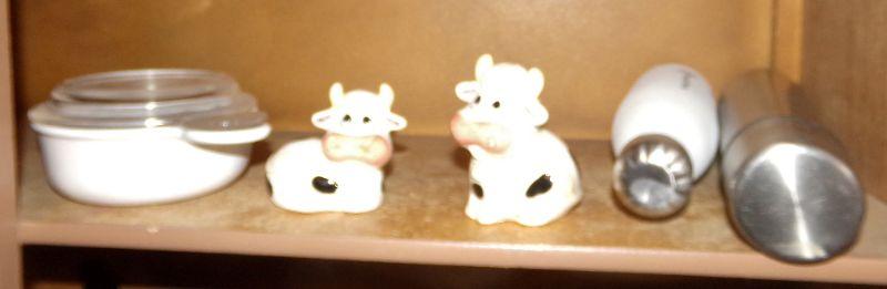 SALT & PEPPER COWS, SINGLE CASSEROLE DISH W/LID, WOODEN SALT SHAKER AND PEPPER MILL, WATER BOTTLE, SMALL THERMOS,