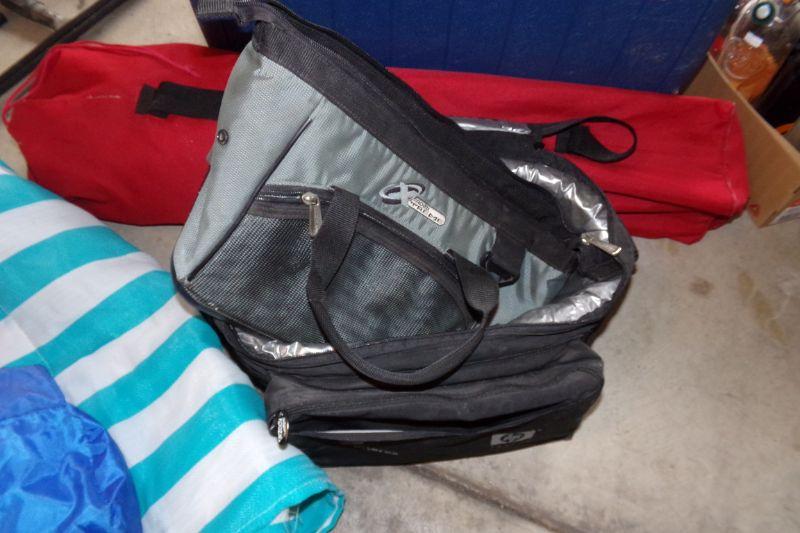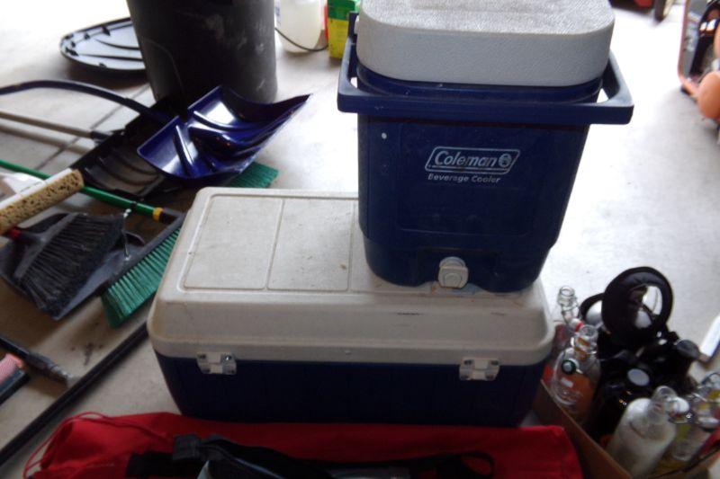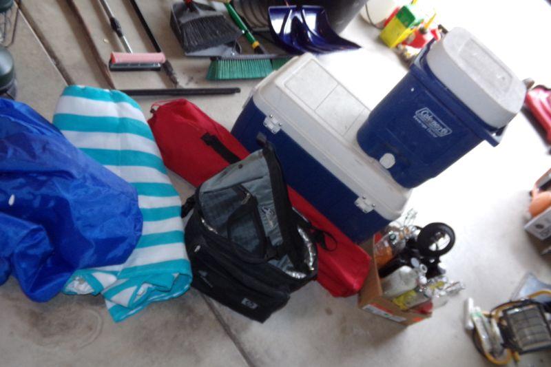 2 HARD SIDED COOLERS, SEVERAL SOFT SIDED COOLER, FOLDING CHAIR AND MORE