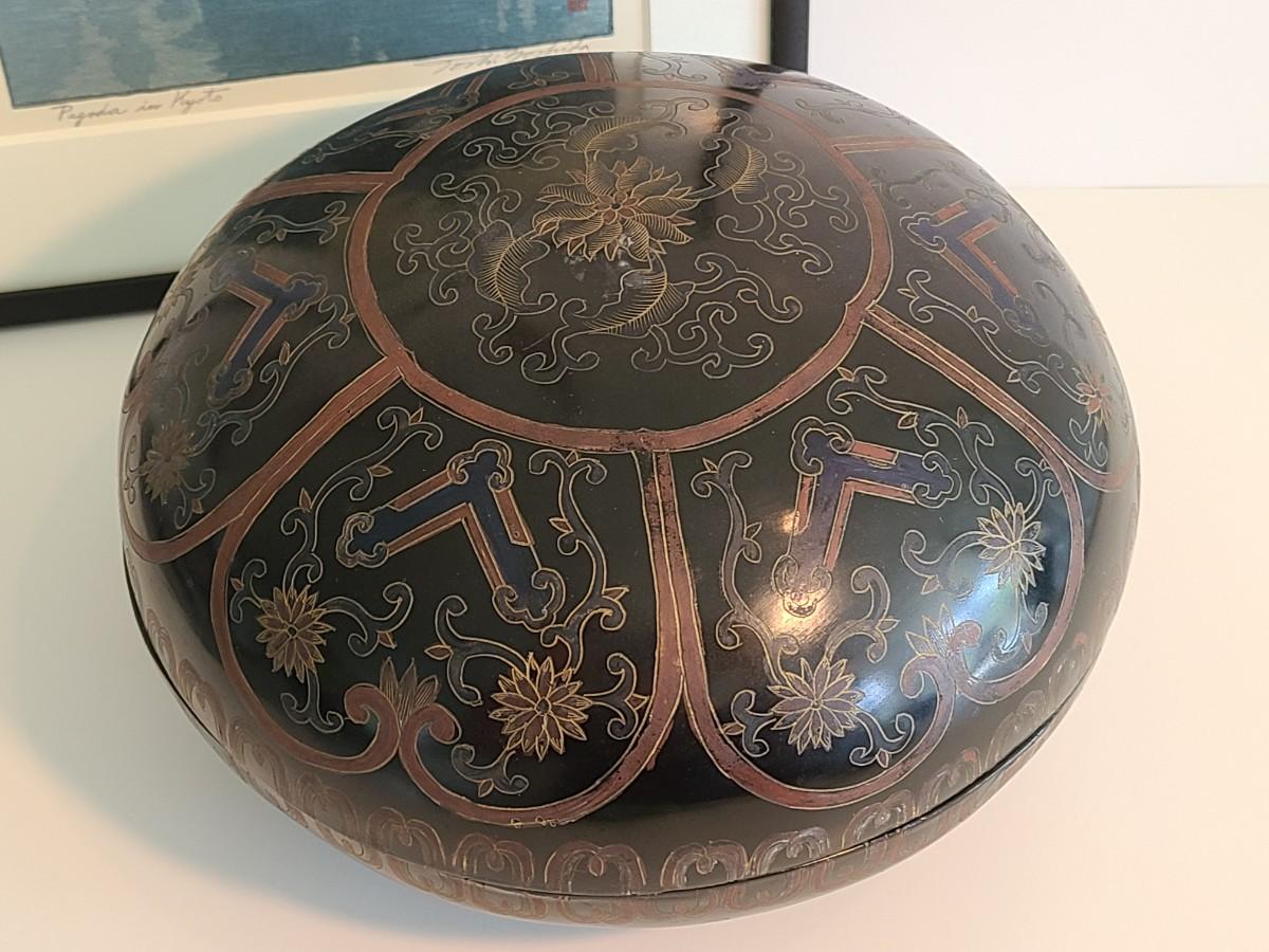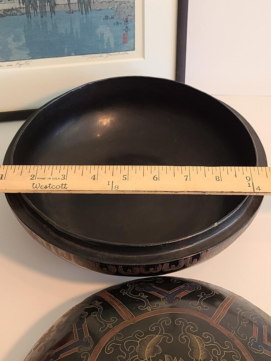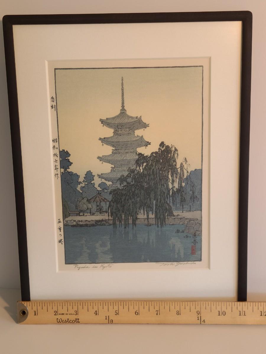 Large ornately designed lacquerware lidded bowl/container, and artist signed "Pagoda in Kyoto" framed and matted, in glass artwork. Please see all pictures for content of the lot, condition of the lot, and measurements if taken. Pictures are the best representation of the items listed and items are untested unless indicated in description. Thank you for looking and have fun bidding!