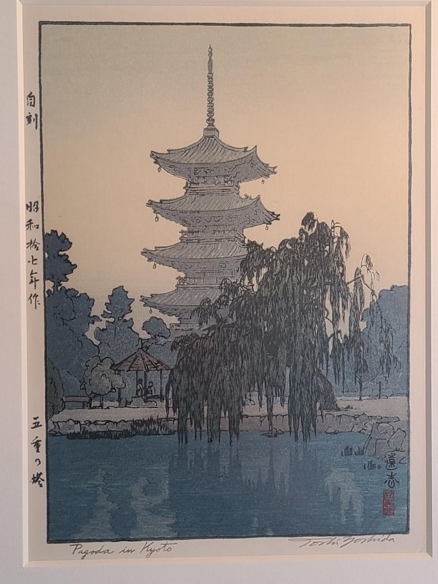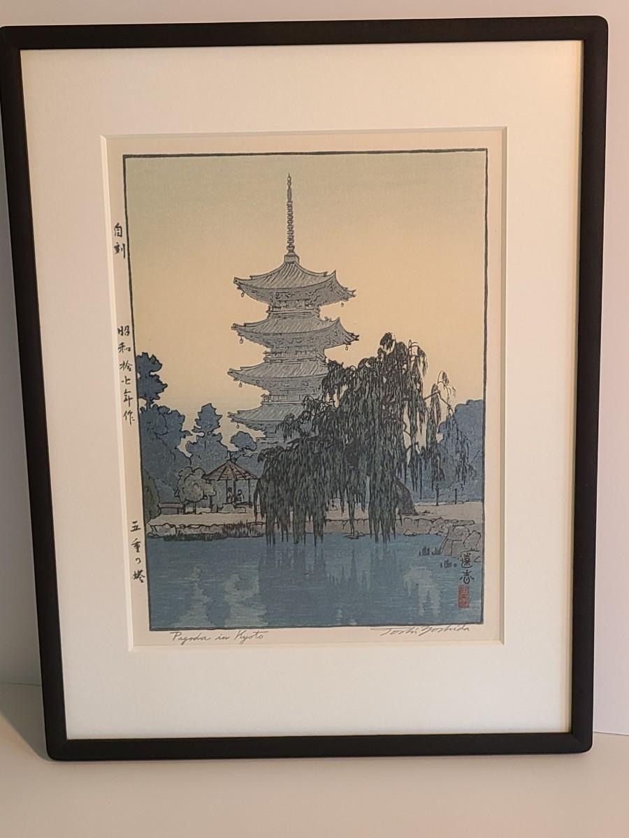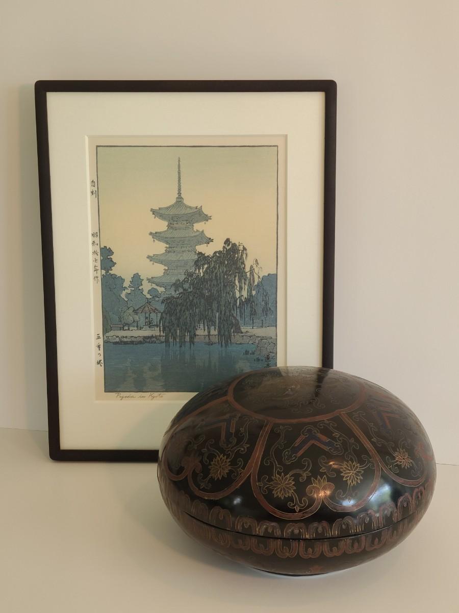 Lot 38: Toshi Yoshida Signed Pagoda Artwork & Large Asian Lacquerware Lidded Canister