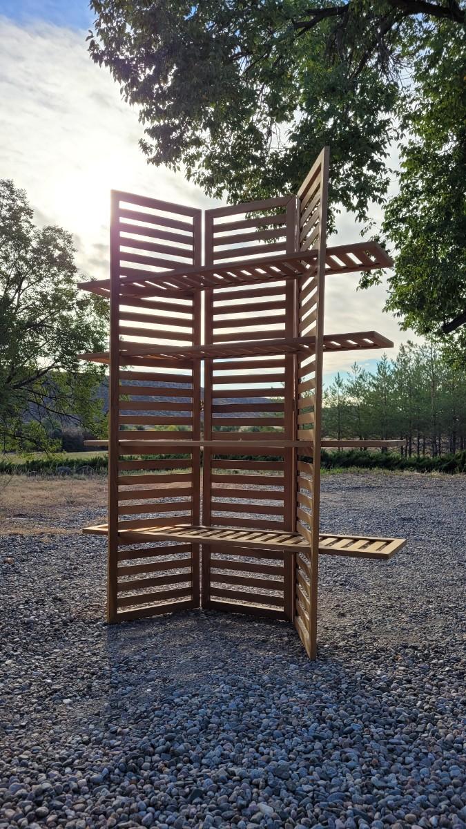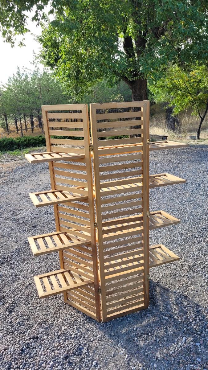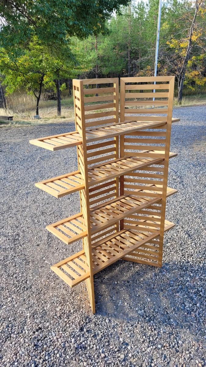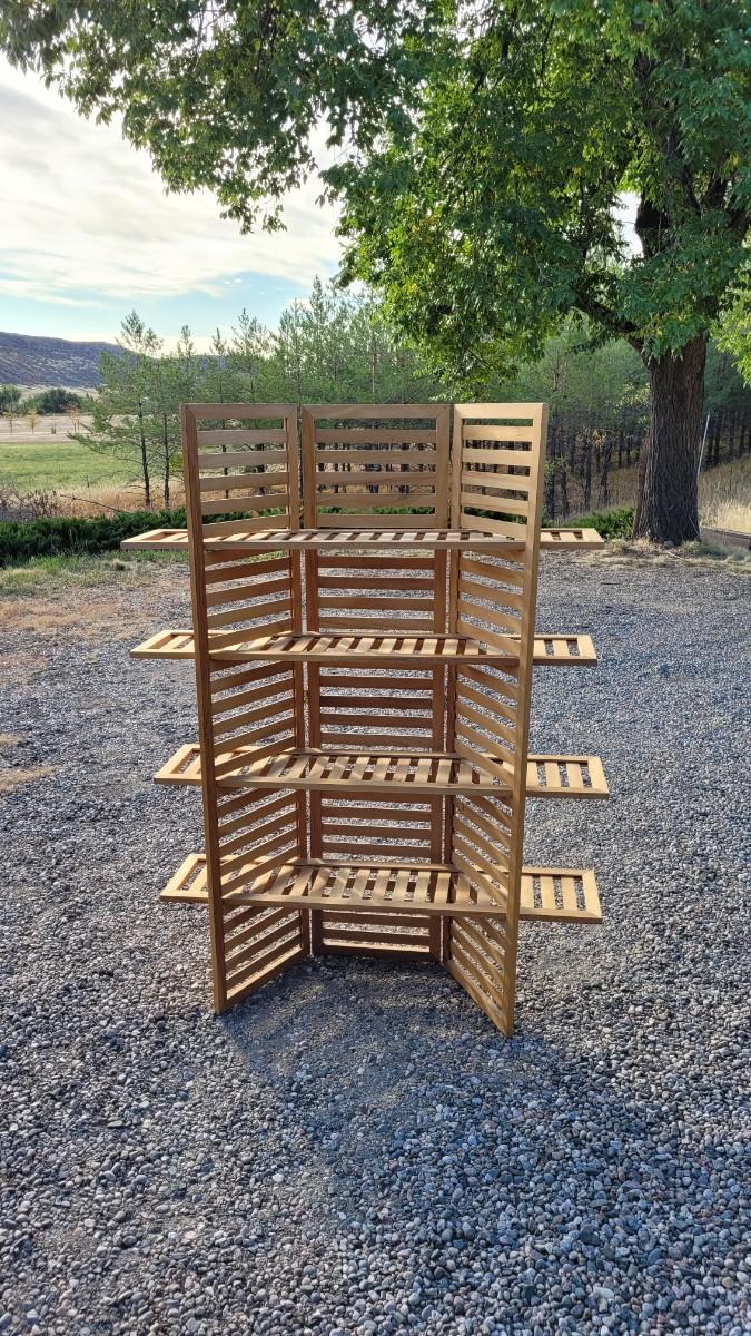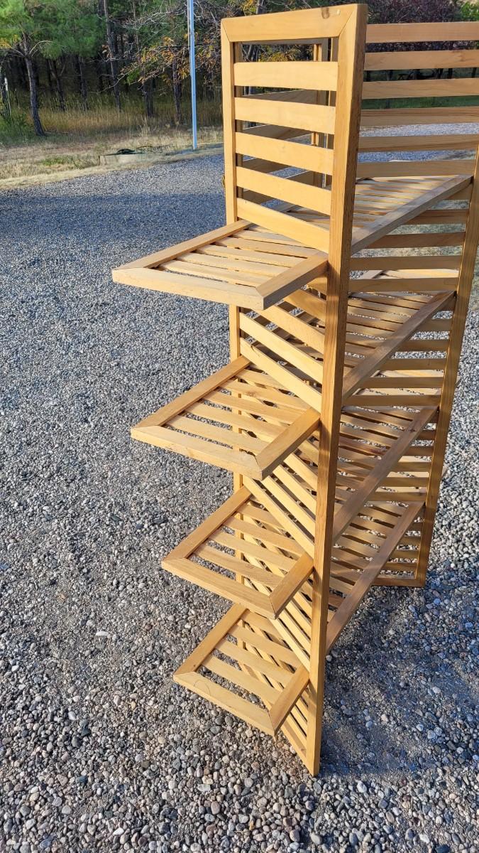 Lot 38: Vintage Wooden Slat Shelf Triple Zone Display Unit
