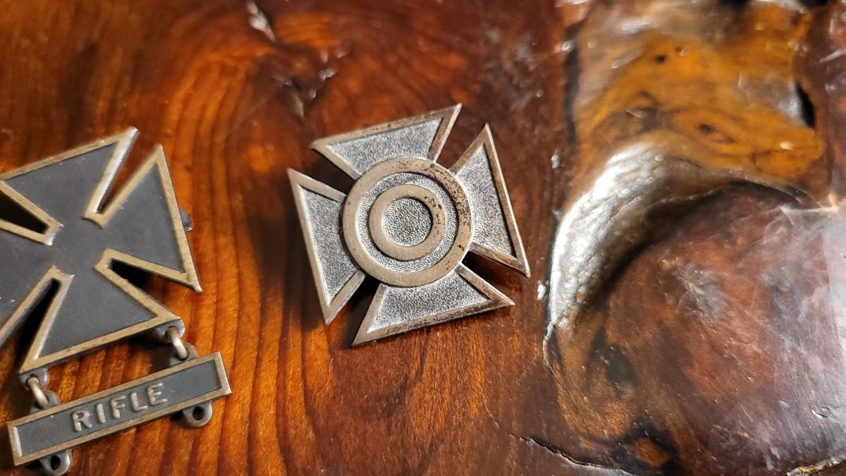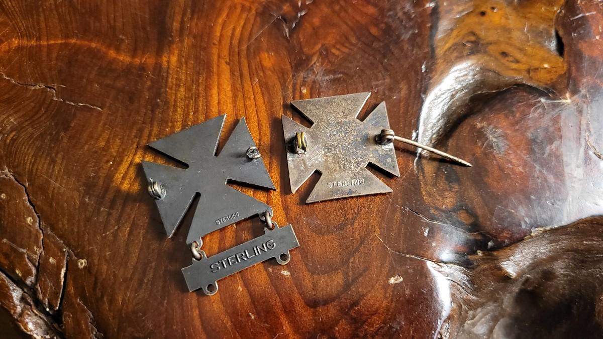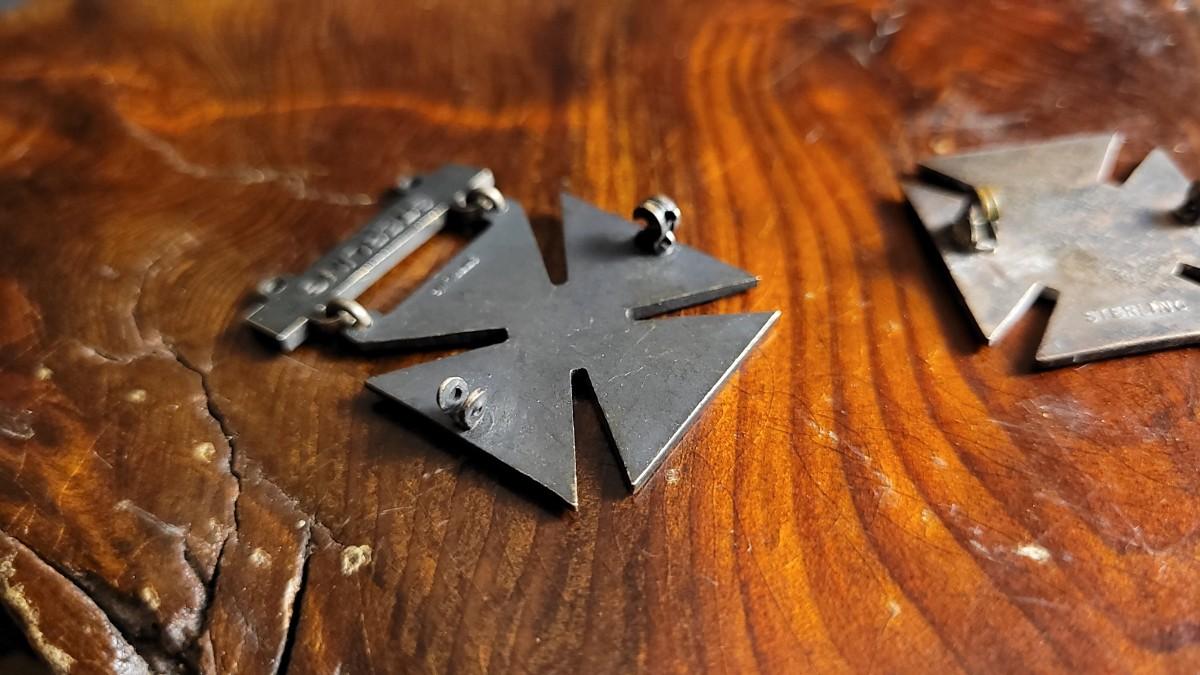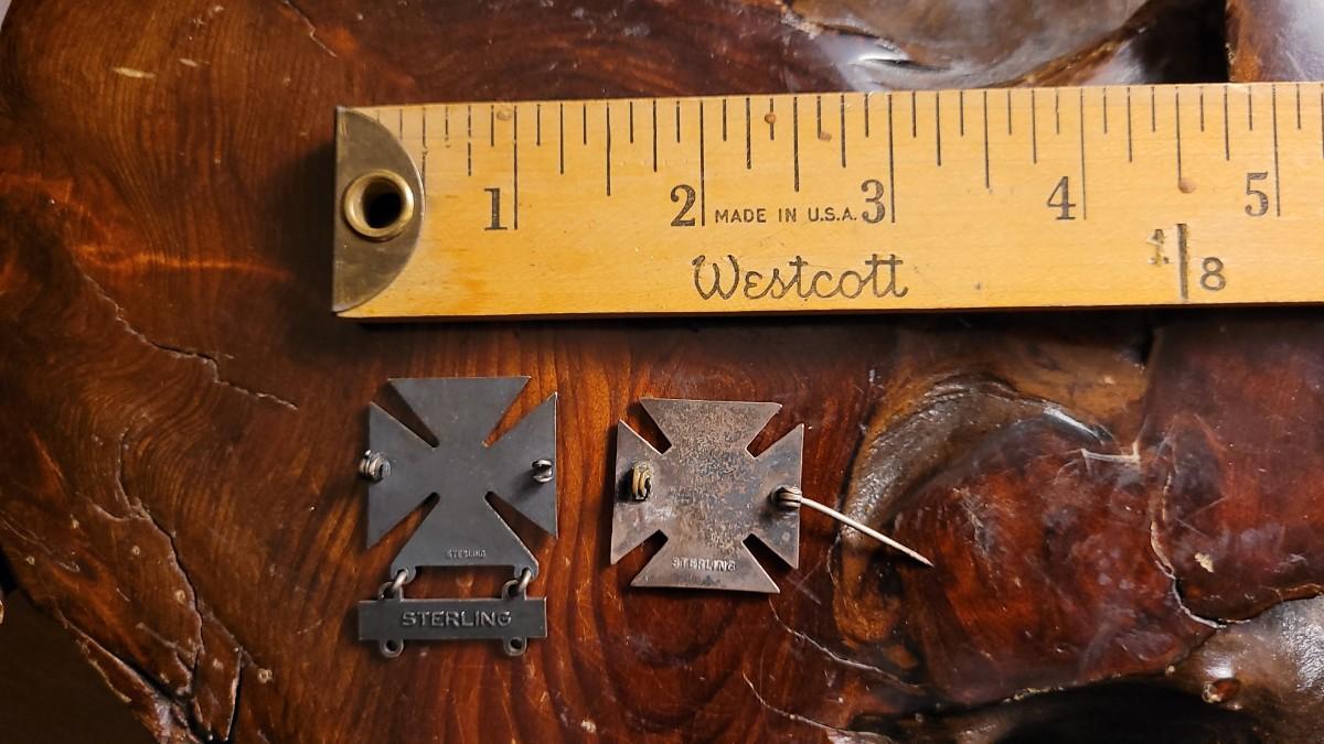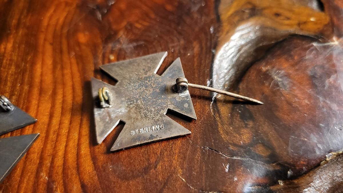 Set of 2 Vintage Military Iron Cross Pin Badges. One does show a missing mount pin on the reverse.