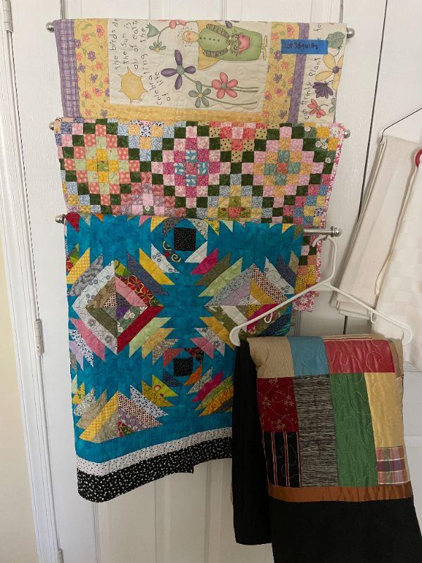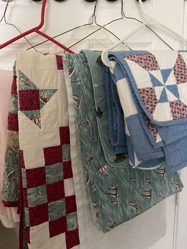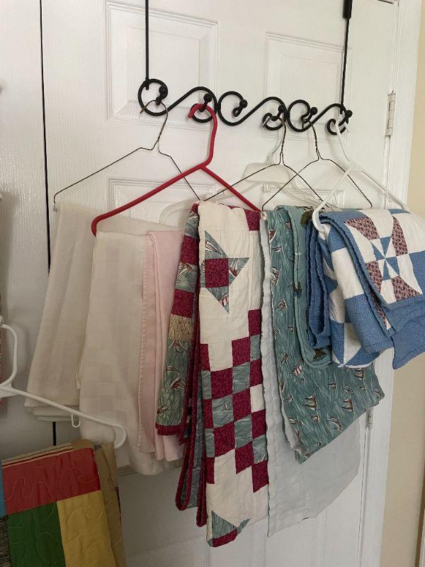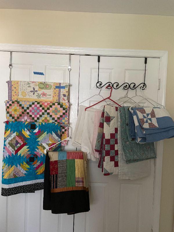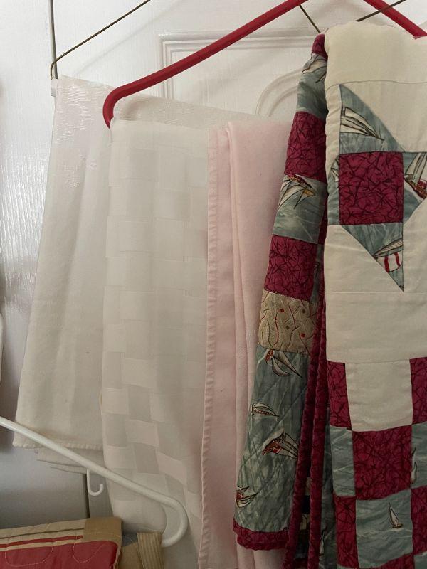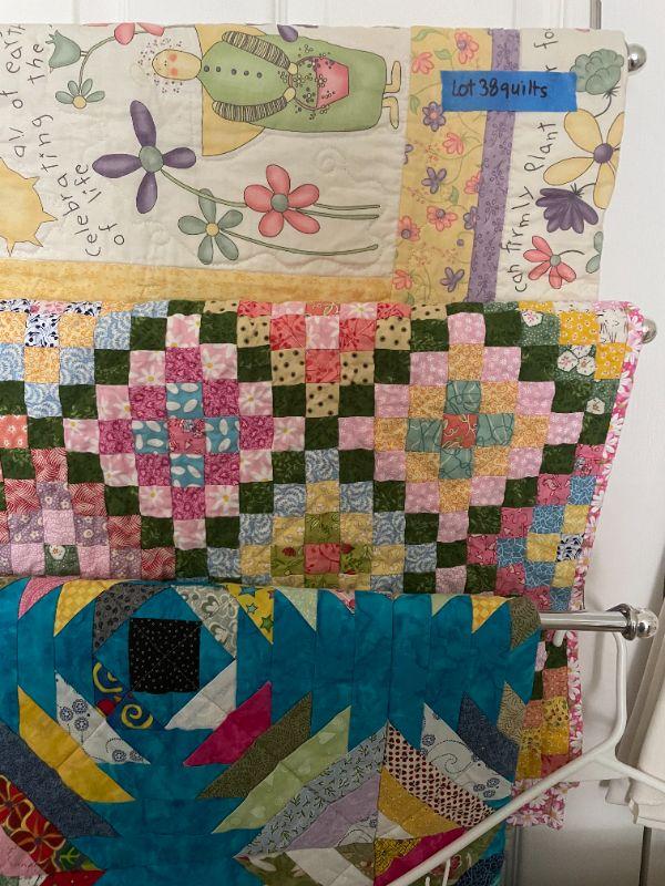 Lot 38 - 7 handmade quilts, table cloths, misc. blankets