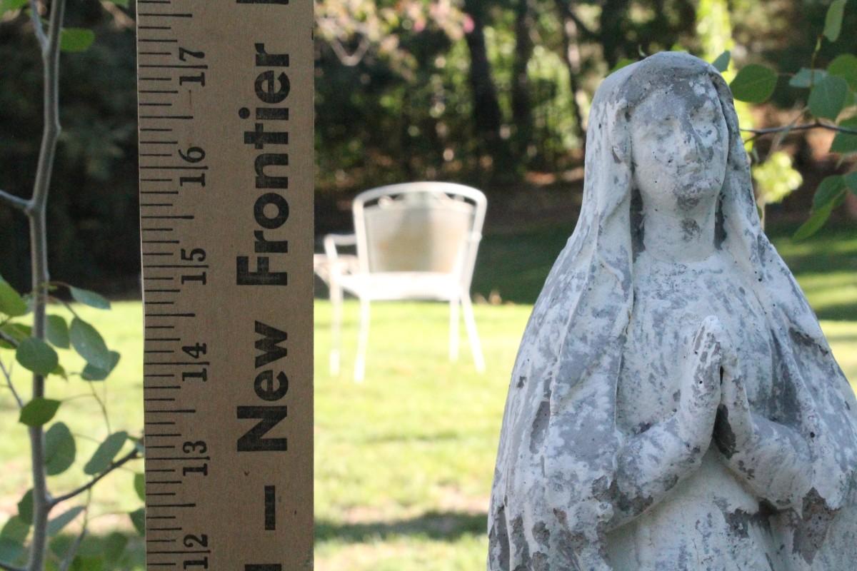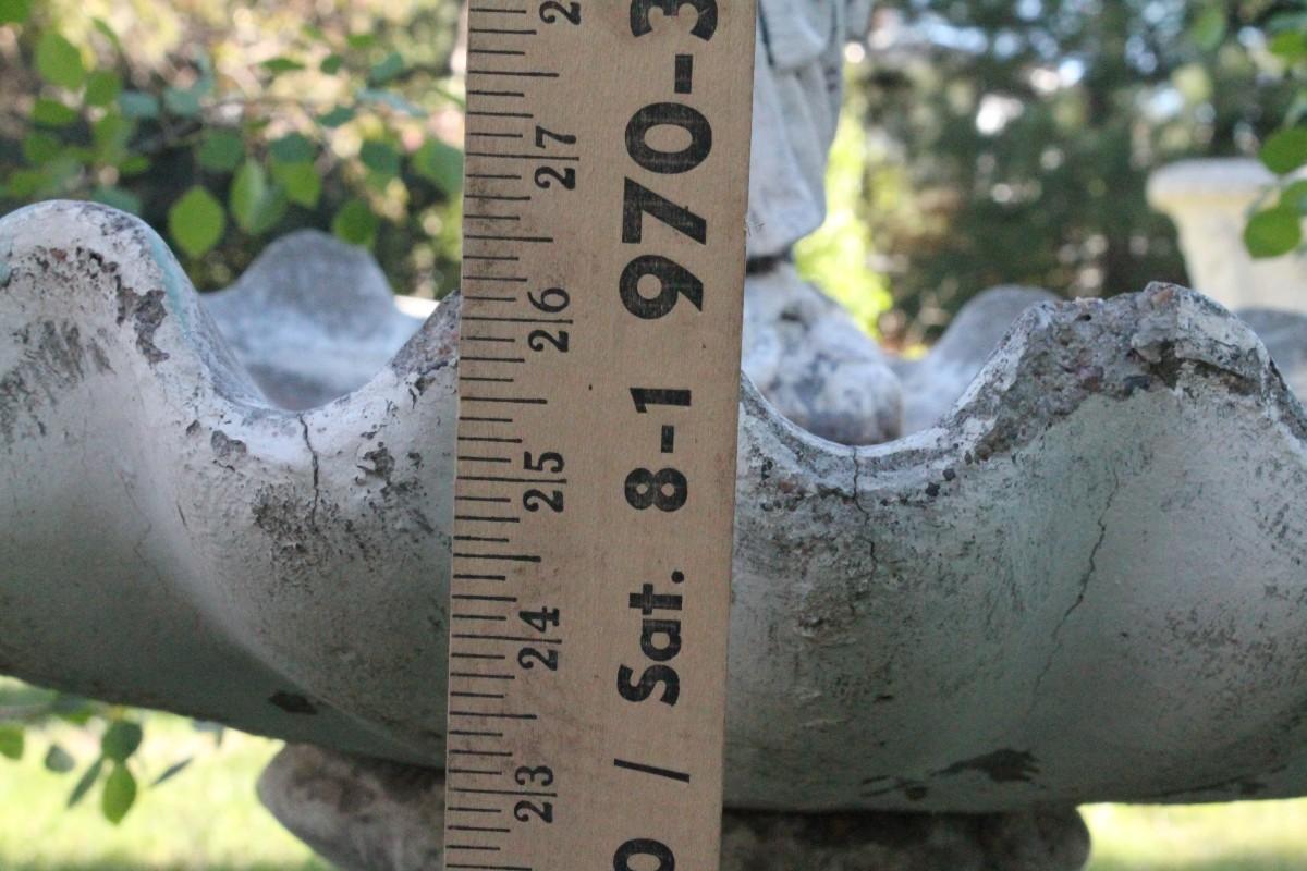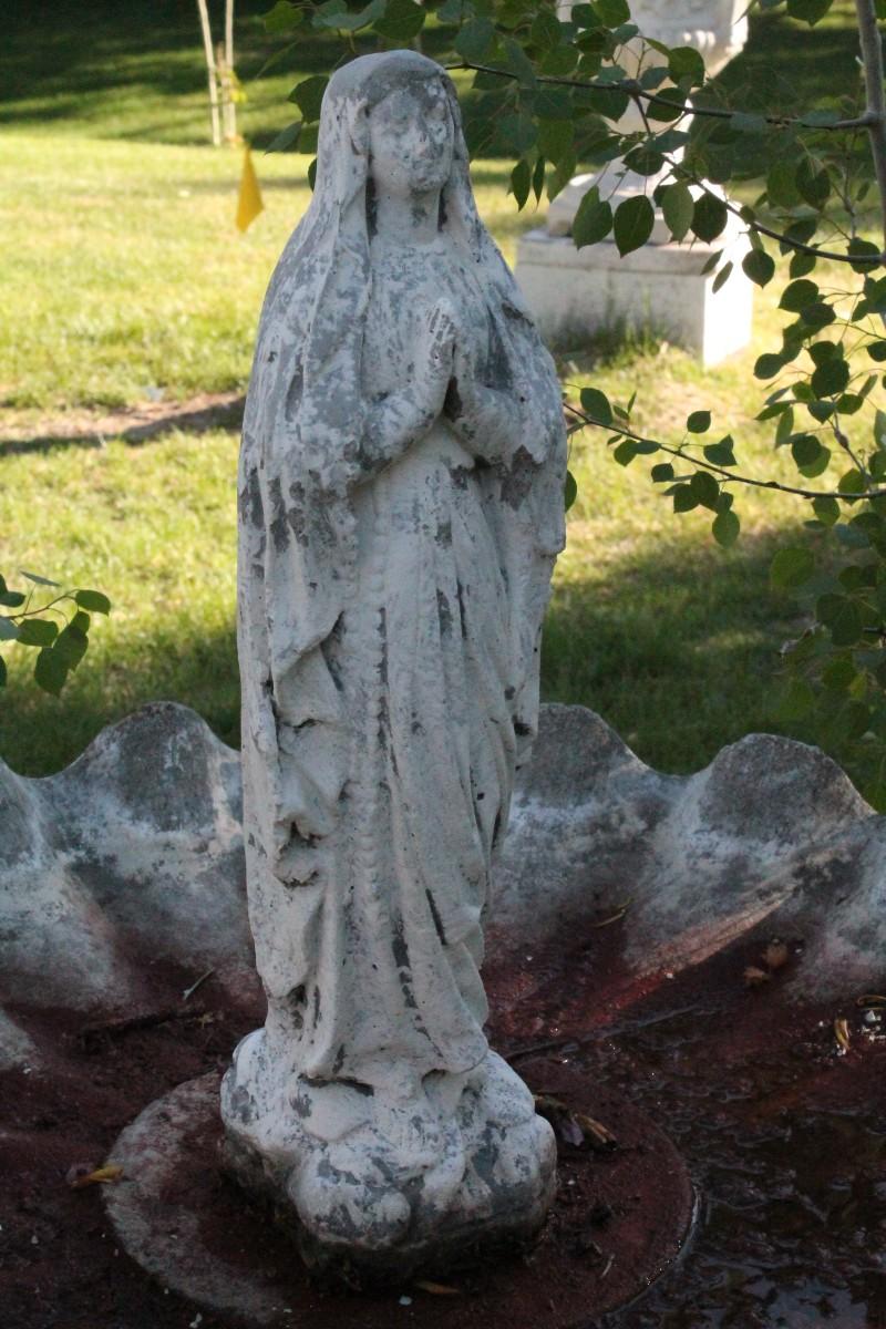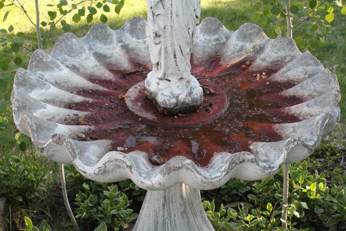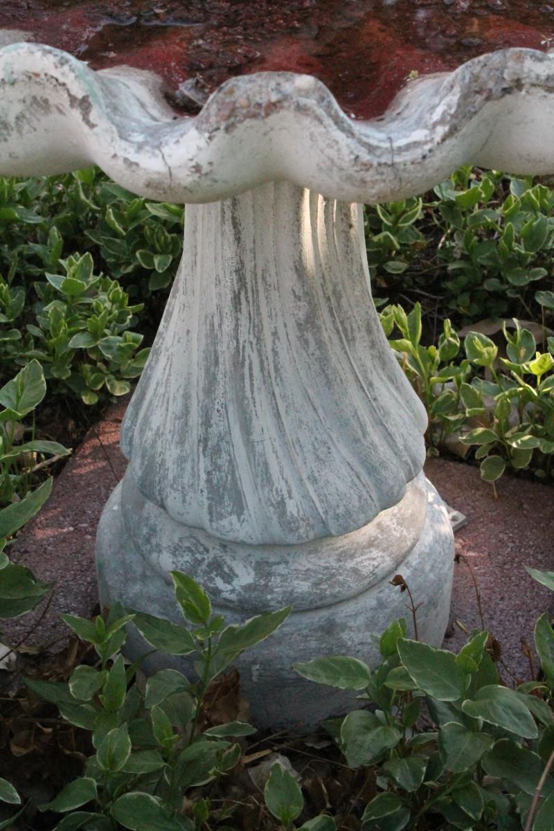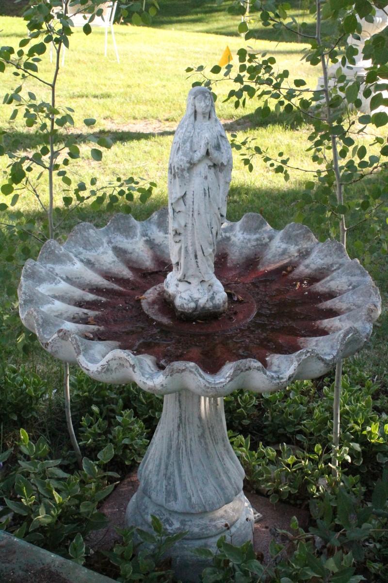 This large vintage bird bath currently shows a Virgin Mary sculpture in the center and displays some red iron stains from past water evaporation.
